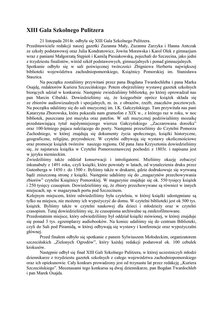 XIII Gala Szkolnego Pulitzera 21 listopada 2014r. odbyła się XIII Gala Szkolnego Pulitzera. Przedstawiciele redakcji naszej gazetki Zuzanna Mały, Zuzanna Zarzyka i Hanna Antczak ze szkoły podstawowej oraz Julia Kondratowicz, Jowita Morawska i Karol Olek z gimnazjum wraz z paniami Małgorzatą Stępień i Kamilą Piesiakowską, pojechali do Szczecina, jako jedni z trzydziestu finalistów, wśród szkół podstawowych, gimnazjalnych i ponad gimnazjalnych. Spotkanie odbyło się w sali poświęconej twórczości Zbigniewa Herberta największej biblioteki województwa zachodniopomorskiego, Książnicy Pomorskiej im. Stanisława Staszica. Na początku zostaliśmy przywitani przez pana Bogdana Twardochleba i pana Marka Osajdę, redaktorów Kuriera Szczecińskiego. Potem obejrzeliśmy wystawę gazetek szkolnych biorących udział w konkursie. Następnie zwiedzaliśmy bibliotekę, po której oprowadzał nas pan Marcin Cibalski. Dowiedzieliśmy się, że księgozbiór oprócz książek składa się ze zbiorów audiowizualnych i specjalnych, m. in. z obrazów, rzeźb, znaczków pocztowych. Na początku udaliśmy się do sali muzycznej im. I.K. Gałczyńskiego. Tam przywitała nas pani Katarzyna Zborowska, która pokazała nam gramofon z XIX w., z którego raz w roku, w noc bibliotek, puszczana jest muzyka oraz patefon. W sali muzycznej podziwialiśmy mozaikę przedstawiającą tytuł najsłynniejszego wiersza Gałczyńskiego ,,Zaczarowana dorożka” oraz 100-letniego pajaca należącego do poety. Następnie przeszliśmy do Czytelni Pomorza Zachodniego, w której znajdują się dokumenty życia społecznego, książki historyczne, geograficzne, religijne, przyrodnicze. W czytelni odbywają się wystawy okolicznościowe oraz promocje książek twórców naszego regionu. Od pana Jana Krzysztonia dowiedzieliśmy się, że najstarsza książka w Czytelni Pomorzoznawczej pochodzi z 1803r. i napisana jest w języku niemieckim. Zwiedziliśmy także oddział konserwacji i introligatorni. Mieliśmy okazję zobaczyć inkunabuły z 1491 roku, czyli książki, które powstały w latach, od wynalezienia druku przez Gutenberga w 1450 r. do 1500 r. Byliśmy także w drukarni, gdzie dodrukowuje się wyrwaną bądź zniszczoną stronę z książki. Następnie udaliśmy się do „magazynów przechowywania zbiorów” czytelni Książnicy Pomorskiej. W magazynie znajduje się ok. 550 tysięcy książek i 250 tysięcy czasopism. Dowiedzieliśmy się, że zbiory przechowywane są również w innych miejscach, np. w magazynach portu pod Szczecinem. Kolejnym miejscem, które odwiedziliśmy była czytelnia, w której książki udostępniane są tylko na miejscu, nie możemy ich wypożyczyć do domu. W czytelni biblioteki jest ok 500 tys. książek. Byliśmy także w czytelni naukowej dla dzieci i młodzieży oraz w czytelni czasopism. Tutaj dowiedzieliśmy się, że czasopisma archiwalne są zmikrofilmowane. Przedostatnim miejsce, który odwiedziliśmy był oddział książki mówionej, w której znajduje się ponad 3 tys. egzemplarzy audiobooków. Na koniec udaliśmy się do centrum Biblioteki, czyli do Sali pod Piramidą, w której odbywają się wystawy i konferencje oraz wypożyczalni głównej. Przed finałem odbyło się spotkanie z panem Sylwiuszem Mołodeckim, organizatorem szczecińskich „Zielonych Ogrodów”, który każdej redakcji podarował ok. 100 cebulek krokusów. Następnie odbył się finał XIII Gali Szkolnego Pulitzera, w której uczestniczyli młodzi dziennikarze z trzydziestu gazetek szkolnych z całego województwa zachodniopomorskiego oraz ich opiekunowie. Cały konkurs prowadzony jest od trzynastu lat przez redakcję ,,Kuriera Szczecińskiego”. Mecenasami tego konkursu są dwaj dziennikarze, pan Bogdan Twardochleb i pan Marek Osajda. Upominki, dyplomy i nagrody zostały ufundowane przez ,,Kurier Szczeciński” i Kuratorium Oświaty oraz głównego sponsora, którym jest Wojewódzki Fundusz Ochrony Środowiska i Gospodarki Wodnej w Szczecinie. Nagrody główne otrzymały redakcje gazetek szkolnych: ,,Nowinki z 16” ze szkoły podstawowej w Kliniskach Wielkich, ,,Extra Dwójka” z gimnazjum w Wałczu i pismo młodzieżowe „Maniak” Zespołu Szkół nr 5 w Szczecinie. „Pisanie na kolanie” otrzymało nominacje do nagrody głównej „Szkolnego Pulitzera” – niestety w tym roku nie zostaliśmy laureatem. Cieszymy się, że zostaliśmy nominowani i mieliśmy możliwość zwiedzenia Książnicy – jednej z 7 najważniejszych bibliotek w kraju. Warto przypomnień, że w roku szkolnym 2012/2013 nasza gazetka zdobyła tytuł Szkolnego Pulitzera, najlepszej gazetki w województwie zachodniopomorskim. Konferencja prasowa… W czasie gali młodych redaktorów odbyła się konferencja prasowa z panem Lucjanem Bąbolewskim, dyrektorem Książnicy Pomorskiej oraz gospodarzem miejsca, w którym odbywała się uroczystość. Chciałybyśmy przytoczyć najciekawsze pytania kierowane w stronę dyrektora Książnicy Pomorskiej: Kiedy powstała biblioteka? Początki Książnicy Pomorskiej sięgają roku 1905, kiedy w zaadaptowanym gmachu liceum z połowy XIX w. utworzona została Biblioteka Miejska Szczecina. Swój rozwój zawdzięcza dr. Erwinowi Ackerknechtowi, kierującemu nią w latach 1907-1945. W czasie wojny budynek biblioteki została częściowo zniszczony. 12 lipca 1945 roku została wznowienia działalności Biblioteki Miejskiej jako pierwszej polskiej książnicy w zniszczonym Szczecinie. Od 1947 r. biblioteka była Wojewódzką Biblioteką Publiczną. Zaś w 1955 roku utworzono Wojewódzką i Miejską Bibliotekę Publiczną, która objęła nadzorem całą sieć bibliotek publicznych w mieście i ówczesnym województwie szczecińskim. 3 października 1994 roku Wojewódzka i Miejska Biblioteka Publiczna została przekształcona w Książnicę Pomorską. Ile lat pan pracuje w Książnicy Pomorskiej? W Książnicy pracuję od 12 lat, wcześniej pracowałem w szkole, byłem nauczyciel