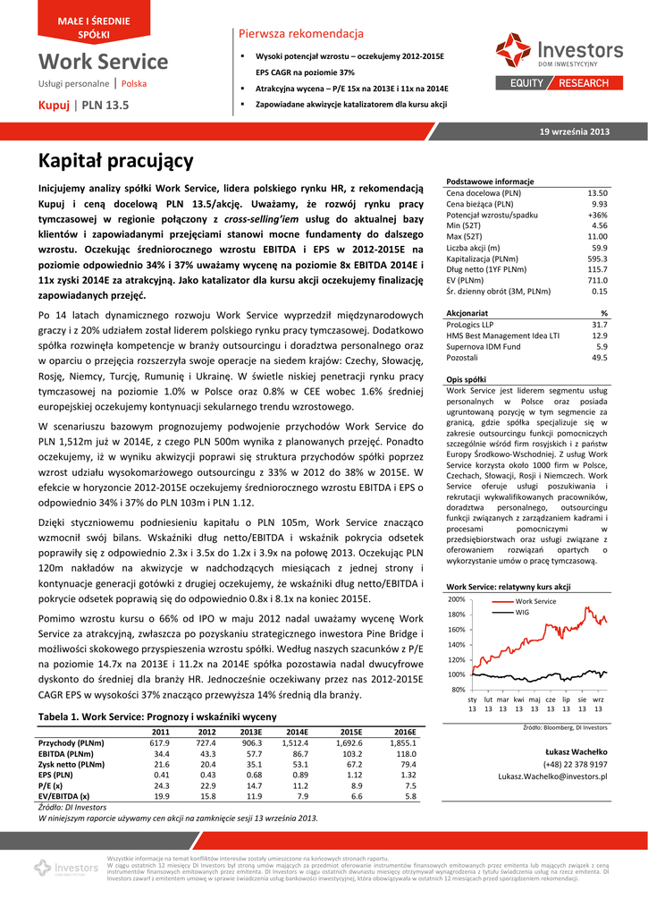 MAŁE I ŚREDNIE SPÓŁKI Pierwsza rekomendacja Work Service Usługi personalne Wysoki potencjał wzrostu – oczekujemy 2012-2015E EPS CAGR na poziomie 37% | Polska Kupuj | PLN 13.5 Atrakcyjna wycena – P/E 15x na 2013E i 11x na 2014E Zapowiadane akwizycje katalizatorem dla kursu akcji 19 września 2013 15.04.2013 Kapitał pracujący Inicjujemy analizy spółki Work Service, lidera polskiego rynku HR, z rekomendacją Kupuj i ceną docelową PLN 13.5/akcję. Uważamy, że rozwój rynku pracy tymczasowej w regionie połączony z cross-selling’iem usług do aktualnej bazy klientów i zapowiadanymi przejęciami stanowi mocne fundamenty do dalszego wzrostu. Oczekując średniorocznego wzrostu EBITDA i EPS w 2012-2015E na poziomie odpowiednio 34% i 37% uważamy wycenę na poziomie 8x EBITDA 2014E i 11x zyski 2014E za atrakcyjną. Jako katalizator dla kursu akcji oczekujemy finalizację zapowiadanych przejęć. Po 14 latach dynamicznego rozwoju Work Service wyprzedził międzynarodowych graczy i z 20% udziałem został liderem polskiego rynku pracy tymczasowej. Dodatkowo spółka rozwinęła kompetencje w branży outsourcingu i doradztwa personalnego oraz w oparciu o przejęcia rozszerzyła swoje operacje na siedem krajów: Czechy, Słowację, Rosję, Niemcy, Turcję, Rumunię i Ukrainę. W świetle niskiej penetracji rynku pracy tymczasowej na poziomie 1.0% w Polsce oraz 0.8% w CEE wobec 1.6% średniej europejskiej oczekujemy kontynuacji sekularnego trendu wzrostowego. W scenariuszu bazowym prognozujemy podwojenie przychodów Work Service do PLN 1,512m już w 2014E, z czego PLN 500m wynika z planowanych przejęć. Ponadto oczekujemy, iż w wyniku akwizycji poprawi się struktura przychodów spółki poprzez wzrost udziału wysokomarżowego outsourcingu z 33% w 2012 do 38% w 2015E. W efekcie w horyzoncie 2012-2015E oczekujemy średniorocznego wzrostu EBITDA i EPS o odpowiednio 34% i 37% do PLN 103m i PLN 1.12. Dzięki styczniowemu podniesieniu kapitału o PLN 105m, Work Service znacząco wzmocnił swój bilans. Wskaźniki dług netto/EBITDA i wskaźnik pokrycia odsetek poprawiły się z odpowiednio 2.3x i 3.5x do 1.2x i 3.9x na połowę 2013. Oczekując PLN 120m nakładów na akwizycje w nadchodzących miesiącach z jednej strony i kontynuacje generacji gotówki z drugiej oczekujemy, że wskaźniki dług netto/EBITDA i pokrycie odsetek poprawią się do odpowiednio 0.8x i 8.1x na koniec 2015E. Pomimo wzrostu kursu o 66% od IPO w maju 2012 nadal uważamy wycenę Work Service za atrakcyjną, zwłaszcza po pozyskaniu strategicznego inwestora Pine Bridge i możliwości skokowego przyspieszenia wzrostu spółki. Według naszych szacunków z P/E na poziomie 14.7x na 2013E i 11.2x na 2014E spółka pozostawia nadal dwucyfrowe dyskonto do średniej dla branży HR. Jednocześnie oczekiwany przez nas 2012-2015E CAGR EPS w wysokości 37% znacząco przewyższa 14% średnią dla branży. Tabela 1. Work Service: Prognozy i wskaźniki wyceny 2011 617.9 34.4 21.6 0.41 24.3 19.9 2012 727.4 43.3 20.4 0.43 22.9 15.8 2013E 906.3 57.7 35.1 0.68 14.7 11.9 2014E 1,512.4 86.7 53.1 0.89 11.2 7.9 Przychody (PLNm) EBITDA (PLNm) Zysk netto (PLNm) EPS (PLN) P/E (x) EV/EBITDA (x) Źródło: DI Investors W niniejszym raporcie używamy cen akcji na zamknięcie sesji 13 września 2013. 2015E 1,692.6 103.2 67.2 1.12 8.9 6.6 2016E 1,855.1 118.0 79.4 1.32 7.5 5.8 Podstawowe informacje Cena docelowa (PLN) Cena bieżąca (PLN) Potencjał wzrostu/spadku Min (52T) Max (52T) Liczba akcji (m) Kapitalizacja (PLNm) Dług netto (1YF PLNm) EV (PLNm) Śr. dzienny obrót (3M, PLNm) Akcjonariat ProLogics LLP HMS Best Management Idea LTI Supernova IDM Fund Pozostali 13.50 9.93 +36% 4.56 11.00 59.9 595.3 115.7 711.0 0.15 % 31.7 12.9 5.9 49.5 Opis spółki Work Service jest liderem segmentu usług personalnych w Polsce oraz posiada ugruntowaną pozycję w tym segmencie za granicą, gdzie spółka specjalizuje się w zakresie outsourcingu funkcji pomocniczych szczególnie wśród firm rosyjskich i z państw Europy Środkowo-Wschodniej. Z usług Work Service korzysta około 1000 firm w Polsce, Czechach, Słowacji, Rosji i Niemczech. Work Service oferuje usługi poszukiwania i rekrutacji wykwalifikowanych pracowników, doradztwa personalnego, outsourcingu funkcji związanych z zarządzaniem kadrami i procesami pomocniczymi w przedsiębiorstwach oraz usługi związane z oferowaniem rozwiązań opartych o wykorzystanie umów o pracę tymczasową. Work Service: relatywny kurs akcji 200% 180% Work Service WIG 160% 140% 120% 100% 80% sty lut mar kwi maj cze lip 13 13 13 13 13 13 13 sie wrz 13 13 Źródło: Bloomberg, DI Investors Łukasz Wachełko (+48) 22 378 9197 [email protected] Wszystkie informacje na temat konfliktów interesów zostały umieszczone na końcowych stronach raportu. W ciągu ostatnich 12 miesięcy DI Investors był stroną umów mających za przedmiot oferowanie instrumentów finansowych emitowanych przez emitenta lub mających związek z ceną instrumentów finansowych emitowanych przez emitenta. DI Investors w ciągu ostatnich dwunastu miesięcy otrzymywał wynagrodzenia z tytułu świadczenia usług na rzecz emitenta. DI Investors zawarł z emitentem umowę w sprawie świadczenia usług bankowości inwestycyjnej, która obowiązywała w ostatnich 12 miesiącach przed sporządzeniem rekomendacji. Work Service, Wrzesień 2013 Tabela 2. Work Service: Prognozy, wskaźniki wyceny, analiza scenariuszowa W PLNm o ile nie podano inaczej Rachunek zysków i strat 2010 2011 2012 2013E 2014E 2015E Przychody 499.0 617.9 727.4 906.3 1512.4 1692.6 Koszt własny przychodów -449.2 -564.8 -652.1 -807.6 -1357.6 -1512.3 Optymistyczny Bazowy Pesymistyczny Zysk brutto ze sprzedaży 49.8 53.1 75.3 98.7 154.8 180.3 2013 Przychody 906.3 906.3 868.0 Koszty sprzedaży -7.9 -10.4 -10.7 -15.1 -25.1 -28.1 2013 Zysk netto 36.4 35.1 33.8 -16.5 -11.6 -25.7 -30.4 -50.7 -56.7 2014 Przychody 1512.4 1512.4 990.8 Zysk na sprzedaży 25.4 31.1 38.9 53.3 78.9 95.4 