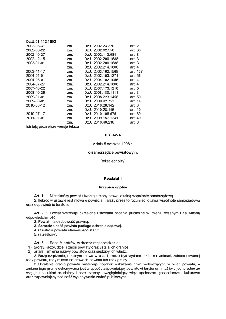 Dz.U.01.142.1592 2002-03-31 2002-06-22 2002-10-27 2002-12-15 2003-01-01 zm. zm. zm. zm. zm. zm. 2003-11-17 zm. 2004-01-01 zm. 2004-05-01 zm. 2004-07-27 zm. 2007-10-22 zm. 2008-10-25 zm. 2009-01-01 zm. 2009-08-01 zm. 2010-03-12 zm. zm. 2010-07-17 zm. 2011-01-01 zm. zm. Istnieją późniejsze wersje tekstu Dz.U.2002.23.220 Dz.U.2002.62.558 Dz.U.2002.113.984 Dz.U.2002.200.1688 Dz.U.2002.200.1688 Dz.U.2002.214.1806 Dz.U.2003.162.1568 Dz.U.2002.153.1271 Dz.U.2004.102.1055 Dz.U.2002.214.1806 Dz.U.2007.173.1218 Dz.U.2008.180.1111 Dz.U.2008.223.1458 Dz.U.2009.92.753 Dz.U.2010.28.142 Dz.U.2010.28.146 Dz.U.2010.106.675 Dz.U.2009.157.1241 Dz.U.2010.40.230 art. art. art. art. art. art. art. art. art. art. art. art. art. art. art. art. art. art. art. 2 33 81 3 3 4 137 56 4 4 5 3 50 14 3 10 69 40 8 USTAWA z dnia 5 czerwca 1998 r. o samorządzie powiatowym. (tekst jednolity) Rozdział 1 Przepisy ogólne Art. 1. 1. Mieszkańcy powiatu tworzą z mocy prawa lokalną wspólnotę samorządową. 2. Ilekroć w ustawie jest mowa o powiecie, należy przez to rozumieć lokalną wspólnotę samorządową oraz odpowiednie terytorium. Art. 2. 1. Powiat wykonuje określone ustawami zadania publiczne w imieniu własnym i na własną odpowiedzialność. 2. Powiat ma osobowość prawną. 3. Samodzielność powiatu podlega ochronie sądowej. 4. O ustroju powiatu stanowi jego statut. 5. (skreślony). Art. 3. 1. Rada Ministrów, w drodze rozporządzenia: 1) tworzy, łączy, dzieli i znosi powiaty oraz ustala ich granice, 2) ustala i zmienia nazwy powiatów oraz siedziby ich władz. 2. Rozporządzenie, o którym mowa w ust. 1, może być wydane także na wniosek zainteresowanej rady powiatu, rady miasta na prawach powiatu lub rady gminy. 3. Ustalenie granic powiatu następuje poprzez wskazanie gmin wchodzących w skład powiatu, a zmiana jego granic dokonywana jest w sposób zapewniający powiatowi terytorium możliwie jednorodne ze względu na układ osadniczy i przestrzenny, uwzględniający więzi społeczne, gospodarcze i kulturowe oraz zapewniający zdolność wykonywania zadań publicznych. 4. Przez łączenie powiatów należy również rozumieć połączenie miasta na prawach powiatu z powiatem mającym siedzibę władz w tym mieście. Z dniem połączenia wygasają prawa powiatu posiadane dotychczas przez miasto. 5. Przez dzielenie powiatów należy również rozumieć wyłączenie jednej lub więcej gmin z terytorium powiatu z jednoczesnym: 1) włączeniem tej gminy lub gmin do innego powiatu, 2) utworzeniem powiatu z tych gmin albo z tych gmin i miasta na prawach powiatu; z dniem utworzenia powiatu wygasają prawa powiatu posiadane dotychczas przez miasto, (1) przywróceniem statusu miasta na prawach powiatu miastu, które w trybie ust. 4 zostało połączone 3) z powiatem mającym siedzibę władz w tym mieście. 6. Zmiany, o których mowa w ust. 1, następują z dniem 1 stycznia. Art. 3a. 1. Wydanie rozporządzenia, o którym mowa w art. 3 ust. 1, wymaga zasięgnięcia przez ministra właściwego do spraw administracji publicznej opinii zainteresowanych rad powiatów albo rady miasta na prawach powiatu i rady powiatu - poprzedzonych przeprowadzeniem przez te rady konsultacji z mieszkańcami, a w przypadku zmian granic powiatów naruszających granice województw - dodatkowo opinii odpowiednich sejmików województw. Minister właściwy do spraw administracji publicznej może wystąpić także o opinie zainteresowanych rad gmin; w tym przypadku nie jest konieczne przeprowadzenie konsultacji z mieszkańcami gminy. 2. Konsultacje z mieszkańcami dotyczące, naruszającej granice województw, zmiany granic powiatów albo powiatu i miasta na prawach powiatu w sprawach, o których mowa w art. 3 ust. 3 i 4 - jeżeli zmiana granic wynika z wyłączenia tylko jednej gminy lub miasta na prawach powiatu - mogą zostać ograniczone przez sejmiki województw do mieszkańców odpowiedniego powiatu lub miasta na prawach powiatu objętego zmianą. (2) 3. W przypadku niewyrażenia opinii, o której mowa w ust. 1, w terminie 3 miesięcy od dnia otrzymania wystąpienia o opinię, wymóg zasięgnięcia opinii uznaje się za spełniony. Art. 3b. 1. Wydanie rozporządzenia, o którym mowa w art. 3 ust. 1, na wniosek odpowiednio rady powiatu, rady miasta na prawach powiatu lub rady gminy wymaga: 1) wniosku rady powiatu, rady miasta na prawach powiatu lub rady gminy poprzedzonego przeprowadzeniem przez tę radę konsultacji z mieszkańcami, wraz z uzasadnieniem oraz niezbędnymi dokumentami, mapami i informacjami potwierdzającymi zasadność wniosku, 2) opinii odpowiednio rad powiatów lub rady miasta na prawach powiatu objętych wnioskiem, poprzedzonych przeprowadzeniem przez te rady konsultacji z mieszkańcami, a w przypadku zmiany granic powiatu naruszającej granice województw - opinii sejmików województw, 3) opinii rad gmin, których dotyczy wniosek, 4) opinii wojewody właściwego dla powiatu lub miasta na prawach powiatu objętego wnioskiem. 2. Do wniosku i opinii, o których mowa w ust. 1, przepisy art. 3a ust. 2 i 3 stosuje się odpowiednio. 3. Rada powiatu, rada miasta na prawach powiatu lub rada gminy występuje z wnioskiem, o którym mowa w ust. 1, do ministra właściwego do spraw administracji publicznej za pośrednictwem wojewody, w terminie do dnia 31 marca. 4. Rada Ministrów określi, w drodze rozporządzenia, tryb postępowania przy składaniu wniosków, o których mowa w ust. 1, oraz dokumenty, które należy dołączyć do wniosku. Art. 3c. W przypadku uzyskania zgody na połączenie miasta na prawach powiatu z powiatem mającym siedzibę władz w tym mieście lub utworzenie powiatu, w którego skład wejdzie dotychczasowe miasto na prawach powiatu, wyrażonej we wniosku lub opinii rady powiatu lub rady miasta na prawach powiatu oraz w wyniku przeprowadzonych przez te rady konsultacji z mieszkańcami, Rada Ministrów obowiązana jest dokonać tego połączenia lub utworzenia powiatu, w drodze rozporządzenia,