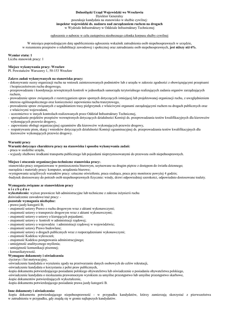 Dolnośląski Urząd Wojewódzki we Wrocławiu Dyrektor Generalny poszukuje kandydata na stanowisko w służbie cywilnej: inspektor wojewódzki ds. nadzoru nad zarządzaniem ruchem na drogach w Wydziale Infrastruktury w Oddziale Infrastruktury Technicznej ogłoszenie o naborze w celu zastępstwa nieobecnego członka korpusu służby cywilnej W miesiącu poprzedzającym datę upublicznienia ogłoszenia wskaźnik zatrudnienia osób niepełnosprawnych w urzędzie, w rozumieniu przepisów o rehabilitacji zawodowej i społecznej oraz zatrudnianiu osób niepełnosprawnych, jest niższy niż 6%. Wymiar etatu: 1 Liczba stanowisk pracy: 1 Miejsce wykonywania pracy: Wrocław Pl. Powstańców Warszawy 1, 50-153 Wrocław Zakres zadań wykonywanych na stanowisku pracy: - dokonywanie oceny organizacji ruchu na wniosek zainteresowanych podmiotów lub z urzędu w zakresie zgodności z obowiązującymi przepisami i bezpieczeństwem ruchu drogowego, - przeprowadzanie i koordynacja zewnętrznych kontroli w jednostkach samorządu terytorialnego realizujących zadania organów zarządzających ruchem, - prowadzenie spraw związanych z rozstrzyganiem spraw spornych dotyczących istniejącej lub projektowanej organizacji ruchu, z uwzględnieniem interesu ogólnospołecznego oraz konieczności zapewnienia ruchu tranzytowego, - prowadzenie spraw związanych z uzgadnianiem trasy pielgrzymek z właściwymi organami zarządzającymi ruchem na drogach publicznych oraz z właściwymi wojewodami, - uczestnictwo w innych kontrolach realizowanych przez Oddział Infrastruktury Technicznej, - sporządzanie projektów przepisów wewnętrznych dotyczących działalności Komisji ds. przeprowadzania testów kwalifikacyjnych dla kierowców wykonujących przewóz drogowy, - zapewnianie obsługi organizacyjnej egzaminów dla kierowców wykonujących przewóz drogowy, - rozpatrywanie pism, skarg i wniosków dotyczących działalności Komisji egzaminacyjnej ds. przeprowadzania testów kwalifikacyjnych dla kierowców wykonujących przewóz drogowy. Warunki pracy Warunki dotyczące charakteru pracy na stanowisku i sposobu wykonywania zadań: - praca w siedzibie urzędu, - wyjazdy służbowe środkami transportu publicznego lub pojazdami nieprzystosowanymi do przewozu osób niepełnosprawnych. Miejsce i otoczenie organizacyjno-techniczne stanowiska pracy:. -stanowisko pracy zorganizowane w pomieszczeniu biurowym, usytuowane na drugim piętrze z dostępem do światła dziennego; -narzędzia i materiały pracy: komputer, urządzenia biurowe; -występowanie uciążliwych warunków pracy: sztuczne oświetlenie, praca siedząca, praca przy monitorze powyżej 4 godzin; -budynek dostosowany do potrzeb osób niepełnosprawnych fizycznie: windy, drzwi odpowiedniej szerokości, odpowiednio dostosowane toalety. Wymagania związane ze stanowiskiem pracy niezbędne wykształcenie: wyższe prawnicze lub administracyjne lub techniczne z zakresu inżynierii ruchu doświadczenie zawodowe/staż pracy: pozostałe wymagania niezbędne: - prawo jazdy kategorii B; - znajomość ustawy Prawo o ruchu drogowym wraz z aktami wykonawczymi; - znajomość ustawy o transporcie drogowym wraz z aktami wykonawczymi; - znajomość ustawy o ustawy o kierujących pojazdami; - znajomość ustawy o kontroli w administracji rządowej; - znajomość ustawy o wojewodzie i administracji rządowej w województwie; - znajomość ustawy Prawo budowlane; - znajomość ustawy o drogach publicznych wraz z rozporządzeniami wykonawczymi; - znajomość Kodeksu wykroczeń; - znajomość Kodeksu postępowania administracyjnego; - umiejętność analitycznego myślenia; - umiejętność komunikacji pisemnej; - komunikatywność. Wymagane dokumenty i oświadczenia -życiorys i list motywacyjny, -oświadczenie kandydata o wyrażeniu zgody na przetwarzanie danych osobowych do celów rekrutacji, -oświadczenie kandydata o korzystaniu z pełni praw publicznych, -kopia dokumentu potwierdzającego posiadanie polskiego obywatelstwa lub oświadczenie o posiadaniu obywatelstwa polskiego, -oświadczenie kandydata o nieskazaniu prawomocnym wyrokiem za umyślne przestępstwo lub umyślne przestępstwo skarbowe, -kopie dokumentów potwierdzających wykształcenie, -kopia dokumentu potwierdzającego posiadanie prawa jazdy kategorii B. Inne dokumenty i oświadczenia: -kopia dokumentu potwierdzającego niepełnosprawność - w przypadku kandydatów, którzy zamierzają skorzystać z pierwszeństwa w zatrudnieniu w przypadku, gdy znajdą się w gronie najlepszych kandydatów. Dokumenty należy składać lub przesyłać w terminie do 20.02.2017 Miejsce składania dokumentów Dolnośląski Urząd Wojewódzki Wydział Organizacji i Rozwoju pl. Powstańców Warszawy 1 50-153 Wrocław lub składać w pok. 0200 z dopiskiem „Oferta zatrudnienia w służbie cywilnej IF/IT/01/02/2017” Inne informacje Nasz urząd jest pracodawcą równych szans i wszystkie aplikacje są rozważane z równą uwagą bez względu na płeć, wiek, niepełnosprawność, rasę, narodowość, przekonania polityczne, przynależność związkową, pochodzenie etniczne, wyznanie, orientację seksualną czy też jakąkolwiek inną cechę prawnie chronioną. Do składania dokumentów zachęcamy również osoby niepełnosprawne. Informacje o stosowanych technikach i metodach oraz zasadach uczestnictwa w naborze znajdują się na stronie internetowej www.bip.duw.pl w zakładce „praca w DUW”. Wszystkie oświadczenia powinny zawierać odpowiednią treść, datę i podpis (wzory oświadczeń, które kandydaci mogą wykorzystać zamieszczone są na stronie internetowej www.bip.duw.pl). Oferty niekompletne i dostarczone po terminie (decyduje data stempla pocztowego) nie będą rozpatrywane. Po zakończeniu procesu naboru złożone aplikacje niszczone są niezwłocznie z wyjątkiem aplikacji kandydatów/kandydatek wyłonionych przez komisję przeprowadzająca nabór, które niszczone są po upływie 3 miesięcy od dnia nawiązania stosunku