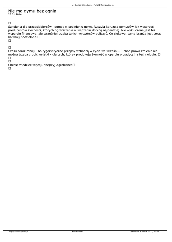 .:: Dopłaty i Fundusze - Portal Informacyjny ::. Nie ma dymu bez ognia 23.01.2014. Szkolenia dla przedsiębiorców i pomoc w spełnieniu norm. Ruszyła karuzela pomysłów jak wesprzeć producentów żywności, których ograniczenia w wędzeniu dotkną najbardziej. Nie wykluczone jest też wsparcie finansowe, ale wcześniej trzeba takich wytwórców policzyć. Co ciekawe, sama branża jest coraz bardziej podzielona. Czasu coraz mniej - bo rygorystyczne przepsy wchodzą w życie we wrześniu. I choć prawa zmienić nie można trzeba zrobić wyjątki - dla tych, którzy produkują żywność w oparciu o tradycyjną technologię. Chcesz wiedzieć więcej, obejrzyj Agrobiznes http://www.doplaty.pl Kreator PDF Utworzono 8 March, 2017, 21:42