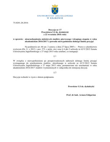 75.0201.20.2016 Decyzja nr 17 Prorektora UJ ds. dydaktyki z 22 września 2016 roku w sprawie: nieuruchomienia niektórych studiów pierwszego i drugiego stopnia w roku akademickim 2016/2017 z powodu niewypełnienia dolnego limitu przyjęć Na podstawie art. 66 ust. 2 ustawy z dnia 27 lipca 2005 r. – Prawo o szkolnictwie wyższym (Dz. U. z 2012 r. poz. 572, z późn. zm.) oraz § 6 pkt 2 uchwały nr 63/V/2015 Senatu Uniwersytetu Jagiellońskiego z 27 maja 2015 roku ustalam, co następuje: §1 W związku z niewypełnieniem po przeprowadzonych naborach dolnego limitu przyjęć wymaganego do uruchomienia studiów, określonego w uchwale nr 63/V/2015 Senatu Uniwersytetu Jagiellońskiego z 27 maja 2015 roku, postanawiam nie uruchamiać w roku akademickim 2016/2017 studiów wymienionych w załączniku do niniejszej decyzji. §2 Decyzja wchodzi w życie z dniem podpisania. Prorektor UJ ds. dydaktyki Prof. dr hab. Armen Edigarian Załącznik do decyzji nr 17 Prorektora UJ ds. dydaktyki z 22 września 2016 r. Stacjonarne studia pierwszego stopnia nieuruchomione w roku akademickim 2016/2017 wydział Wydział Matematyki i Informatyki kierunek informatyka specjalność specjalizacja bioinformatyka - Niestacjonarne studia pierwszego stopnia nieuruchomione w roku akademickim 2016/2017 wydział kierunek specjalność specjalizacja Wydział Filologiczny neofilologia język i kultura Rosji - Wydział Filologiczny neofilologia filologia w zakresie języka hiszpańskiego - Wydział Prawa i Administracji prawo własności intelektualnej i nowych mediów - - Wydział Studiów Międzynarodowych i Politycznych politologia doradztwo polityczne; dziennikarstwo polityczne - Wydział Studiów Międzynarodowych i Politycznych relacje międzykulturowe - - Wydział Zarządzania i Komunikacji Społecznej - - Wydział Zarządzania i Komunikacji Społecznej filmoznawstwo i wiedza o nowych mediach zarządzanie kulturą i mediami Wydział Zarządzania i Komunikacji Społecznej zarządzanie kulturą i mediami zarządzanie kulturą - zarządzanie mediami - Stacjonarne studia drugiego stopnia nieuruchomione w roku akademickim 2016/2017 wydział kierunek specjalność kultura Rosji i narodów sąsiednich specjalizacja Wydział Filologiczny neofilologia Wydział Filologiczny lingwistyka Wydział Filologiczny lingwistyka Wydział Filologiczny neofilologia Wydział Filozoficzny pedagogika Wydział Studiów Międzynarodowych i Politycznych europeistyka wiedza o Holokauście i totalitaryzmach - Wydział Studiów Międzynarodowych i Politycznych kulturoznawstwo kulturoznawstwo międzynarodowe - Wydział Studiów Międzynarodowych i Politycznych kulturoznawstwo ukrainoznawstwo - lingwistyka stosowana przekład i komunikacja międzykulturowa studia środkowoeuropejskie pedagogika wczesnoszkolna i przedszkolna tłumaczenie (ukraiński, angielski, polski) - Niestacjonarne studia drugiego stopnia nieuruchomione w roku akademickim 2016/2017 wydział kierunek specjalność specjalizacja Wydział Filologiczny neofilologia język i kultura Rosji - Wydział Filozoficzny pedagogika pedagogika resocjalizacyjna - Wydział Filozoficzny pedagogika pedagogika społeczno-opiekuńcza - Wydział Filozoficzny pedagogika pedagogika wczesnoszkolna - Wydział Nauk o Zdrowiu położnictwo Wydział Nauk o Zdrowiu zdrowie publiczne Wydział Studiów Międzynarodowych i Politycznych politologia Wydział Studiów Międzynarodowych i Politycznych relacje międzykulturowe Wydział Studiów Międzynarodowych i Politycznych stosunki międzynarodowe filmoznawstwo i wiedza o nowych mediach Wydział Zarządzania i Komunikacji Społecznej - - promocja zdrowia; zarządzanie w jednostkach ochrony zdrowia dziennikarstwo polityczne; instytucje i zarządzanie polityką; polityki publiczne; transformacje polityczne i ustrojowe - - - studia nad rozwojem; studia strategiczne - - - polityka społeczna zarządzanie organizacjami publicznymi i obywatelskimi - Wydział Zarządzania i Komunikacji Społecznej zarządzanie kulturą i mediami kultura współczesna - Wydział Zarządzania i Komunikacji Społecznej zarządzanie kulturą i mediami zarządzanie kulturą - Wydział Zarządzania i Komunikacji Społecznej zarządzanie kulturą i mediami zarządzanie mediami - Wydział Zarządzania i Komunikacji Społecznej zarządzanie Wydział Zarządzania i Komunikacji Społecznej zarządzanie Wydział Zarządzania i Komunikacji Społecznej zarządzanie Wydział Zarządzania i Komunikacji Społecznej media społecznościowe w zarządzaniu zarządzanie w sektorze publicznym i pozarządowym zarządzanie w sporcie - - Prorektor UJ ds. dydaktyki Prof. dr hab. Armen Edigarian