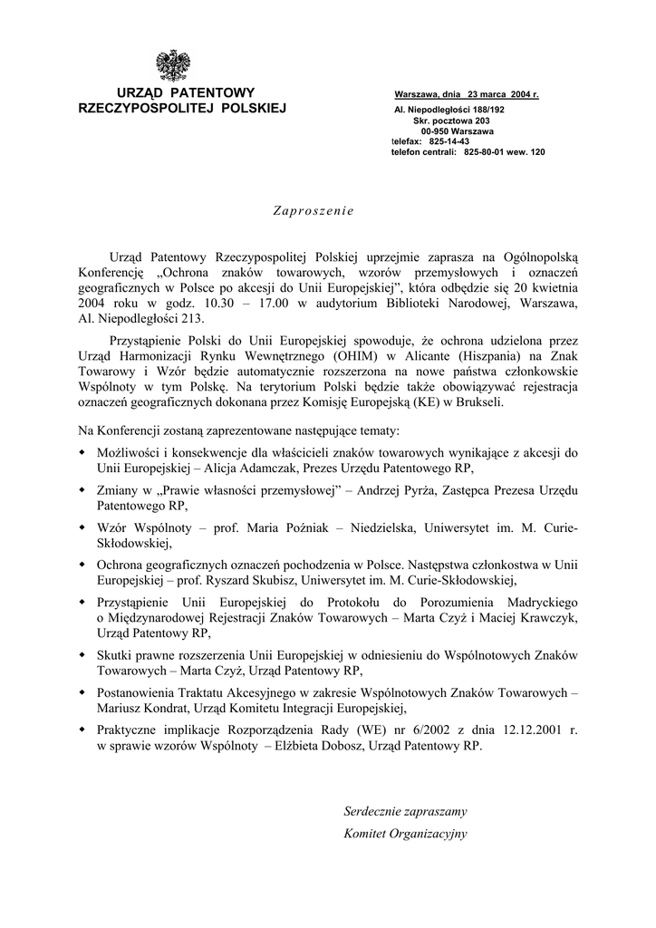 URZĄD PATENTOWY RZECZYPOSPOLITEJ POLSKIEJ Warszawa, dnia 23 marca 2004 r. Al. Niepodległości 188/192 Skr. pocztowa 203 00-950 Warszawa telefax: 825-14-43 telefon centrali: 825-80-01 wew. 120 Zaproszenie Urząd Patentowy Rzeczypospolitej Polskiej uprzejmie zaprasza na Ogólnopolską Konferencję „Ochrona znaków towarowych, wzorów przemysłowych i oznaczeń geograficznych w Polsce po akcesji do Unii Europejskiej”, która odbędzie się 20 kwietnia 2004 roku w godz. 10.30 – 17.00 w audytorium Biblioteki Narodowej, Warszawa, Al. Niepodległości 213. Przystąpienie Polski do Unii Europejskiej spowoduje, że ochrona udzielona przez Urząd Harmonizacji Rynku Wewnętrznego (OHIM) w Alicante (Hiszpania) na Znak Towarowy i Wzór będzie automatycznie rozszerzona na nowe państwa członkowskie Wspólnoty w tym Polskę. Na terytorium Polski będzie także obowiązywać rejestracja oznaczeń geograficznych dokonana przez Komisję Europejską (KE) w Brukseli. Na Konferencji zostaną zaprezentowane następujące tematy: Możliwości i konsekwencje dla właścicieli znaków towarowych wynikające z akcesji do Unii Europejskiej – Alicja Adamczak, Prezes Urzędu Patentowego RP, Zmiany w „Prawie własności przemysłowej” – Andrzej Pyrża, Zastępca Prezesa Urzędu Patentowego RP, Wzór Wspólnoty – prof. Maria Poźniak – Niedzielska, Uniwersytet im. M. CurieSkłodowskiej, Ochrona geograficznych oznaczeń pochodzenia w Polsce. Następstwa członkostwa w Unii Europejskiej – prof. Ryszard Skubisz, Uniwersytet im. M. Curie-Skłodowskiej, Przystąpienie Unii Europejskiej do Protokołu do Porozumienia Madryckiego o Międzynarodowej Rejestracji Znaków Towarowych – Marta Czyż i Maciej Krawczyk, Urząd Patentowy RP, Skutki prawne rozszerzenia Unii Europejskiej w odniesieniu do Wspólnotowych Znaków Towarowych – Marta Czyż, Urząd Patentowy RP, Postanowienia Traktatu Akcesyjnego w zakresie Wspólnotowych Znaków Towarowych – Mariusz Kondrat, Urząd Komitetu Integracji Europejskiej, Praktyczne implikacje Rozporządzenia Rady (WE) nr 6/2002 z dnia 12.12.2001 r. w sprawie wzorów Wspólnoty – Elżbieta Dobosz, Urząd Patentowy RP. Serdecznie zapraszamy Komitet Organizacyjny