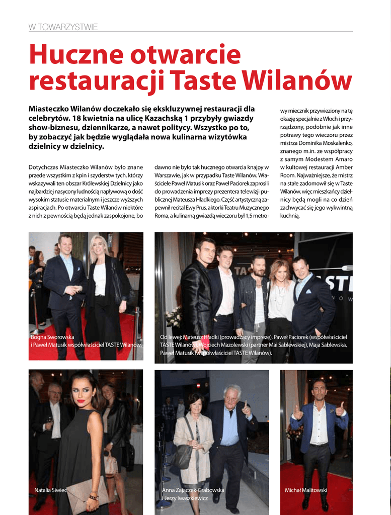W towarzystwie Huczne otwarcie restauracji Taste Wilanów Miasteczko Wilanów doczekało się ekskluzywnej restauracji dla celebrytów. 18 kwietnia na ulicę Kazachską 1 przybyły gwiazdy show-biznesu, dziennikarze, a nawet politycy. Wszystko po to, by zobaczyć jak będzie wyglądała nowa kulinarna wizytówka dzielnicy w dzielnicy. Dotychczas Miasteczko Wilanów było znane przede wszystkim z kpin i szyderstw tych, którzy wskazywali ten obszar Królewskiej Dzielnicy jako najbardziej nasycony ludnością napływową o dość wysokim statusie materialnym i jeszcze wyższych aspiracjach. Po otwarciu Taste Wilanów niektóre z nich z pewnością będą jednak zaspokojone, bo Bogna Sworowska i Paweł Matusik współwłaściciel TASTE Wilanów. Natalia Siwiec 94 dawno nie było tak hucznego otwarcia knajpy w Warszawie, jak w przypadku Taste Wilanów. Właściciele Paweł Matusik oraz Paweł Paciorek zaprosili do prowadzenia imprezy prezentera telewizji publicznej Mateusza Hładkiego. Część artystyczną zapewnił recital Ewy Prus, aktorki Teatru Muzycznego Roma, a kulinarną gwiazdą wieczoru był 1,5 metro- wy miecznik przywieziony na tę okazję specjalnie z Włoch i przyrządzony, podobnie jak inne potrawy tego wieczoru przez mistrza Dominika Moskalenko, znanego m.in. ze współpracy z samym Modestem Amaro w kultowej restauracji Amber Room. Najważniejsze, że mistrz na stałe zadomowił się w Taste Wilanów, więc mieszkańcy dzielnicy będą mogli na co dzień zachwycać się jego wykwintną kuchnią. Od lewej: Mateusz Hładki (prowadzący imprezę), Paweł Paciorek (współwłaściciel TASTE Wilanów), Wojciech Mazolewski (partner Mai Sablewskiej), Maja Sablewska, Paweł Matusik (współwłaściciel TASTE Wilanów). Anna Zajączek-Grabowska i Jerzy Iwaszkiewicz Michał Malitowski Maj 2013
