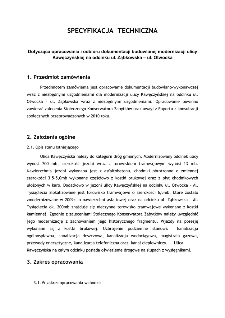 SPECYFIKACJA TECHNICZNA Dotycząca opracowania i odbioru dokumentacji budowlanej modernizacji ulicy Kawęczyńskiej na odcinku ul. Ząbkowska – ul. Otwocka 1. Przedmiot zamówienia Przedmiotem zamówienia jest opracowanie dokumentacji budowlano-wykonawczej wraz z niezbędnymi uzgodnieniami dla modernizacji ulicy Kawęczyńskiej na odcinku ul. Otwocka – ul. Ząbkowska wraz z niezbędnymi uzgodnieniami. Opracowanie powinno zawierać zalecenia Stołecznego Konserwatora Zabytków oraz uwagi z Raportu z konsultacji społecznych przeprowadzonych w 2010 roku. 2. Założenia ogólne 2.1. Opis stanu istniejącego Ulica Kawęczyńska należy do kategorii dróg gminnych. Modernizowany odcinek ulicy wynosi 700 mb, szerokość jezdni wraz z torowiskiem tramwajowym wynosi 13 mb. Nawierzchnia jezdni wykonana jest z asfaltobetonu, chodniki obustronne o zmiennej szerokości 3,5-5,0mb wykonane częściowo z kostki brukowej oraz z płyt chodnikowych ułożonych w karo. Dodatkowo w jezdni ulicy Kawęczyńskiej na odcinku ul. Otwocka – Al. Tysiąclecia zlokalizowane jest torowisko tramwajowe o szerokości 6,5mb, które zostało zmodernizowane w 2009r. o nawierzchni asfaltowej oraz na odcinku ul. Ząbkowska – Al. Tysiąclecia ok. 200mb znajduje się nieczynne torowisko tramwajowe wykonane z kostki kamiennej. Zgodnie z zaleceniami Stołecznego Konserwatora Zabytków należy uwzględnić jego modernizację z zachowaniem jego historycznego fragmentu. Wjazdy na posesję wykonane są z kostki brukowej. Uzbrojenie podziemne stanowi: kanalizacja ogólnospławna, kanalizacja deszczowa, kanalizacja wodociągowa, magistrala gazowa, przewody energetyczne, kanalizacja telefoniczna oraz kanał ciepłowniczy. Ulica Kawęczyńska na całym odcinku posiada oświetlenie drogowe na słupach z wysięgnikami. 3. Zakres opracowania 3.1. W zakres opracowania wchodzi: 1. Projekt drogowy 2. Projekt oświetlenia ulicy skorelowany z projektem trakcji tramwajowej 3. Inwentaryzacja zieleni 4. Projekt nasadzeń 5. Projekt odwodnienia 6. Projekt usunięcia ewentualnych kolizji 7. Projekt docelowy stałej organizacji ruchu 8. Projekt czasowej organizacji ruchu 9. Kosztorysy inwestorskie dla projektów wymienionych w punktach 1,2,4,5,6,7,8 10. Przedmiary robót dla projektów wymienionych w punktach 1,2,4,5,6,7,8 11. Specyfikacja techniczna wykonania i odbioru robót 3.2. Dokumentacja projektowa budowlano - wykonawcza powinna być wykonana w pięciu egzemplarzach oddzielnie dla każdej branży. Dokumentacja powinna być opracowana zgodnie z art. 20 prawa budowlanego, przepisami o ruchu drogowym i powinna odpowiadać wymogom branżowym, a także spełniać warunki Rozporządzenia Ministra Infrastruktury z dnia 03 lipca 2003r. (Dz.U.03.120.1133 z późniejszymi zmianami) w sprawie szczegółowego zakresu i formy projektu budowlanego. Projektant jest zobowiązany do wykonania dla każdego projektu budowlanego oddzielnie, informacji dotyczącej bezpieczeństwa i ochrony zdrowia oraz planu bezpieczeństwa i ochrony zdrowia zgodnie z Rozporządzeniem Ministra Infrastruktury z dnia 23 czerwca 2003 r. 3.3. Kosztorysy Inwestorskie dla poszczególnych projektów branżowych powinny być sporządzone zgodnie z Rozporządzeniem Ministra Infrastruktury z dnia 18 maja 2004r. w sprawie inwestorskiego, określenia obliczania metod planowanych i podstaw kosztów sporządzania prac kosztorysu projektowych oraz planowanych kosztów robót budowlanych określonych w programie funkcjonalnoużytkowym, w dwóch egzemplarzach dla każdego rodzaju robót oddzielnie. 3.4. Przedmiary robót dla każdego rodzaju robót należy opracować metodą szczegółową zgodnie z Rozporządzeniem Ministra Infrastruktury z dnia 02 września 2004r. w sprawie szczegółowego zakresu i formy dokumentacji projektowej, specyfikacji technicznych wykonania i odbioru robót budowlanych oraz programu funkcjonalnoużytkowego (Dz.U.04.202.2072 z późniejszymi zmianami), w dwóch egzemplarzach dla każdego rodzaju robót. 3.5. Specyfikacje techniczne wykonania i odbioru robót należy wykonać zgodnie z Rozporządzeniem Ministra Infrastruktury z dnia 02 września 2004r. w sprawie szczegółowego zakresu i formy dokumentacji projektowej, specyfikacji technicznych wykonania i odbioru robót budowlanych oraz programu funkcjonalnoużytkowego, w dwóch egzemplarzach dla każdego rodzaju robót. 3.6. Projektant jest zobowiązany do uzyskania własnym kosztem i staraniem aktualnych map geodezyjnych dla celów projektowych. 4. Wytyczne do projektowania dla poszczególnych części dokumentacji 1. Część drogowa Zamówienie dotyczy opracowania dokumentacji budowlano – wykonawczej dla modernizacji ulicy Kawęczyńskiej. Przebudowa ulicy będzie polegała na rozebraniu istniejącej nawierzchni jezdni wraz z podbudową i zastąpienia jej nową konstrukcją odpowiadającą wytycznym Stołecznego Konserwatora Zabytków. Według zaleceń Stołecznego Konserwatora Zabytków w partii jezdni zaleca się odsłonięcie spod obecnej warstwy asfaltu oryginalnej nawierzchni brukowej. Nawierzchnia chodników powinna być wykonana z płyt o wymiarach 50/50/7 z zastosowaniem ułożenia w karo. Miejsca postojowe ogólnodostępne należy wykonać zgodnie z postulatami mieszkańców tj. wyznaczyć miejsca do parkowania tylko po południowej stronie ulicy oddzielając ciąg pieszy słupkami typu „syrenka”. Dodatkowo według postulatów mieszkańców zgłaszanych na przeprowadzonych konsultacjach społecznych w projekcie należy uwzględnić: wykonanie/odrestaurowanie zabytkowych wjazdów bramowych z bruku oraz dostosowanie wejść do budynków poprzez wyprofilowanie chodnika ułatwiając poruszanie się osób niepełnosprawnych. 2. Oświetlenie Projekt oświetlenia powinien przewidywać oświetlenie z zastosowaniem historycznych wzorów latarń wyglądem przypominającym latarnie pastorałowe używane w Warszawie a latach 1923 – 1928 – EX2 oraz opraw OP-61 lub Eger. Projekt oświetlenia powinien by