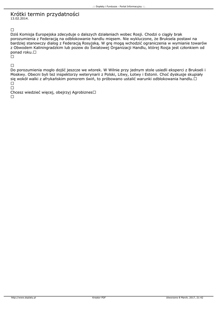 .:: Dopłaty i Fundusze - Portal Informacyjny ::. Krótki termin przydatności 13.02.2014. Dziś Komisja Europejska zdecyduje o dalszych działaniach wobec Rosji. Chodzi o ciągły brak porozumienia z Federacją na odblokowanie handlu mięsem. Nie wykluczone, że Bruksela postawi na bardziej stanowczy dialog z Federacją Rosyjską. W grę mogą wchodzić ograniczenia w wymianie towarów z Obwodem Kaliningradzkim lub pozew do Światowej Organizacji Handlu, której Rosja jest członkiem od ponad roku. Do porozumienia mogło dojść jeszcze we wtorek. W Wilnie przy jednym stole usiedli eksperci z Brukseli i Moskwy. Obecni byli też inspektorzy weterynarii z Polski, Litwy, Łotwy i Estonii. Choć dyskusje skupiały się wokół walki z afrykańskim pomorem świń, to próbowano ustalić warunki odblokowania handlu. Chcesz wiedzieć więcej, obejrzyj Agrobiznes http://www.doplaty.pl Kreator PDF Utworzono 8 March, 2017, 21:42