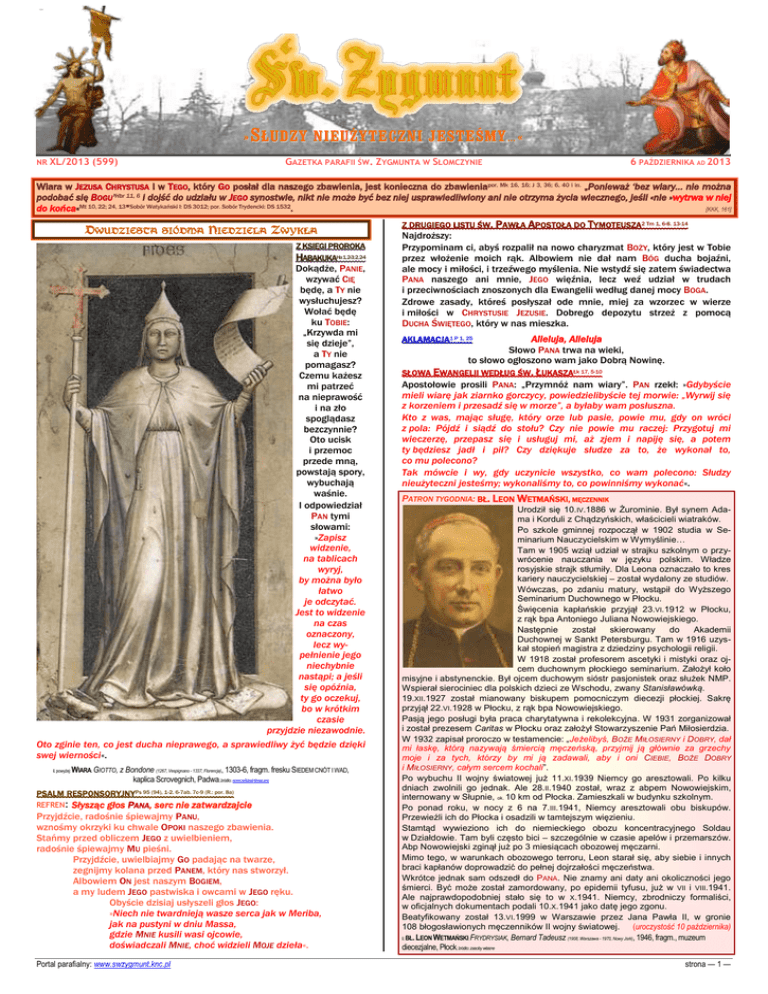 » NR XL/2013 (599) SŁUDZY NIEUŻYTECZNI JESTEŚMY…« GAZETKA PARAFII ŚW. ZYGMUNTA W SŁOMCZYNIE 6 PAŹDZIERNIKA AD 2013 Wiara w JEZUSA CHRYSTUSA i w TEGO, który GO posłał dla naszego zbawienia, jest konieczna do zbawieniapor. Mk 16, 16; J 3, 36; 6, 40 i in. „Ponieważ ‘bez wiary… nie można podobać się BOGU’Hbr 11, 6 i dojść do udziału w JEGO synostwie, nikt nie może być bez niej usprawiedliwiony ani nie otrzyma życia wiecznego, jeśli «nie »wytrwa w niej do końca«Mt 10, 22; 24, 13”Sobór Watykański I: DS 3012; por. Sobór Trydencki: DS 1532. [KKK, 161] DWUDZIESTA SIÓDMA NIEDZIELA ZWYKŁA Z KSIĘGI PROROKA HABAKUKAHa1,2-3;2,2-4 Dokądże, PANIE, wzywać CIĘ będę, a TY nie wysłuchujesz? Wołać będę ku TOBIE: „Krzywda mi się dzieje”, a TY nie pomagasz? Czemu każesz mi patrzeć na nieprawość i na zło spoglądasz bezczynnie? Oto ucisk i przemoc przede mną, powstają spory, wybuchają waśnie. I odpowiedział PAN tymi słowami: »Zapisz widzenie, na tablicach wyryj, by można było łatwo je odczytać. Jest to widzenie na czas oznaczony, lecz wypełnienie jego niechybnie nastąpi; a jeśli się opóźnia, ty go oczekuj, bo w krótkim czasie przyjdzie niezawodnie. Oto zginie ten, co jest ducha nieprawego, a sprawiedliwy żyć będzie dzięki swej wierności«. il. powyżej: WIARA: GIOTTO, z Bondone (1267, Vespignano - 1337, Florencja), 1303-6, fragm. fresku SIEDEM CNÓT I WAD, kaplica Scrovegnich, Padwa; źródło: www.wikipaintings.org PSALM RESPONSORYJNYPs 95 (94), 1-2. 6-7ab. 7c-9 (R.: por. 8a) REFREN: Słysząc głos PANA, serc nie zatwardzajcie Przyjdźcie, radośnie śpiewajmy PANU, wznośmy okrzyki ku chwale OPOKI naszego zbawienia. Stańmy przed obliczem JEGO z uwielbieniem, radośnie śpiewajmy MU pieśni. Przyjdźcie, uwielbiajmy GO padając na twarze, zegnijmy kolana przed PANEM, który nas stworzył. Albowiem ON jest naszym BOGIEM, a my ludem JEGO pastwiska i owcami w JEGO ręku. Obyście dzisiaj usłyszeli głos JEGO: »Niech nie twardnieją wasze serca jak w Meriba, jak na pustyni w dniu Massa, gdzie MNIE kusili wasi ojcowie, doświadczali MNIE, choć widzieli MOJE dzieła«. Portal parafialny: www.swzygmunt.knc.pl Z DRUGIEGO LISTU ŚW. PAWŁA APOSTOŁA DO TYMOTEUSZA2 Tm 1, 6-8. 13-14 Najdroższy: Przypominam ci, abyś rozpalił na nowo charyzmat BOŻY, który jest w Tobie przez włożenie moich rąk. Albowiem nie dał nam BÓG ducha bojaźni, ale mocy i miłości, i trzeźwego myślenia. Nie wstydź się zatem świadectwa PANA naszego ani mnie, JEGO więźnia, lecz weź udział w trudach i przeciwnościach znoszonych dla Ewangelii według danej mocy BOGA. Zdrowe zasady, któreś posłyszał ode mnie, miej za wzorzec w wierze i miłości w CHRYSTUSIE JEZUSIE. Dobrego depozytu strzeż z pomocą DUCHA ŚWIĘTEGO, który w nas mieszka. Alleluja, Alleluja Słowo PANA trwa na wieki, to słowo ogłoszono wam jako Dobrą Nowinę. AKLAMACJA1 P 1, 25 SŁOWA EWANGELII WEDŁUG ŚW. ŁUKASZAŁk 17, 5-10 Apostołowie prosili PANA: „Przymnóż nam wiary”. PAN rzekł: »Gdybyście mieli wiarę jak ziarnko gorczycy, powiedzielibyście tej morwie: „Wyrwij się z korzeniem i przesadź się w morze”, a byłaby wam posłuszna. Kto z was, mając sługę, który orze lub pasie, powie mu, gdy on wróci z pola: Pójdź i siądź do stołu? Czy nie powie mu raczej: Przygotuj mi wieczerzę, przepasz się i usługuj mi, aż zjem i napiję się, a potem ty będziesz jadł i pił? Czy dziękuje słudze za to, że wykonał to, co mu polecono? Tak mówcie i wy, gdy uczynicie wszystko, co wam polecono: Słudzy nieużyteczni jesteśmy; wykonaliśmy to, co powinniśmy wykonać«. PATRON TYGODNIA: BŁ. LEON WETMAŃSKI, MĘCZENNIK Urodził się 10.IV.1886 w Żurominie. Był synem Adama i Korduli z Chądzyńskich, właścicieli wiatraków. Po szkole gminnej rozpoczął w 1902 studia w Seminarium Nauczycielskim w Wymyślinie… Tam w 1905 wziął udział w strajku szkolnym o przywrócenie nauczania w języku polskim. Władze rosyjskie strajk stłumiły. Dla Leona oznaczało to kres kariery nauczycielskiej – został wydalony ze studiów. Wówczas, po zdaniu matury, wstąpił do Wyższego Seminarium Duchownego w Płocku. Święcenia kapłańskie przyjął 23.VI.1912 w Płocku, z rąk bpa Antoniego Juliana Nowowiejskiego. Następnie został skierowany do Akademii Duchownej w Sankt Petersburgu. Tam w 1916 uzyskał stopień magistra z dziedziny psychologii religii. W 1918 został profesorem ascetyki i mistyki oraz ojcem duchownym płockiego seminarium. Założył koło misyjne i abstynenckie. Był ojcem duchowym sióstr pasjonistek oraz służek NMP. Wspierał sierociniec dla polskich dzieci ze Wschodu, zwany Stanisławówką. 19.XII.1927 został mianowany biskupem pomocniczym diecezji płockiej. Sakrę przyjął 22.VI.1928 w Płocku, z rąk bpa Nowowiejskiego. Pasją jego posługi była praca charytatywna i rekolekcyjna. W 1931 zorganizował i został prezesem Caritas w Płocku oraz założył Stowarzyszenie Pań Miłosierdzia. W 1932 zapisał proroczo w testamencie: „Jeżelibyś, BOŻE MIŁOSIERNY i DOBRY, dał mi łaskę, którą nazywają śmiercią męczeńską, przyjmij ją głównie za grzechy moje i za tych, którzy by mi ją zadawali, aby i oni CIEBIE, BOŻE DOBRY i MIŁOSIERNY, całym sercem kochali”. Po wybuchu II wojny światowej już 11.XI.1939 Niemcy go aresztowali. Po kilku dniach zwolnili go jednak. Ale 28.II.1940 został, wraz z abpem Nowowiejskim, internowany w Słupnie, ok. 10 km od Płocka. Zamieszkali w budynku szkolnym. Po ponad roku, w nocy z 6 na 7.III.1941, Niemcy aresztowali obu biskupów. Przewieźli ich do Płocka i osadzili w tamtejszym więzieniu. Stamtąd wywieziono ich do niemieckiego obozu koncentracyjnego Soldau w Działdowie. Tam byli często bici – szczególnie w czasie apelów i przemarszów. Abp Nowowiejski zginął już po 3 miesiącach obozowej męczarni. Mimo tego, w warunkach obozowego terroru, Leon starał się, aby