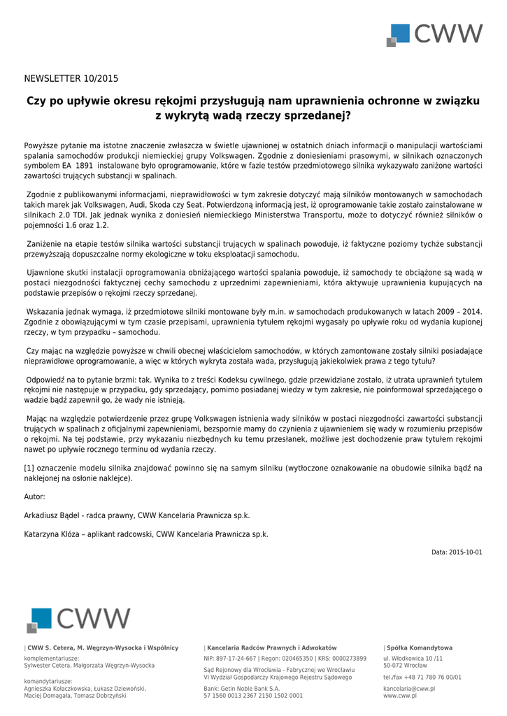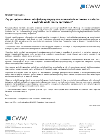 NEWSLETTER 10/2015 Czy po upływie okresu rękojmi przysługują nam uprawnienia ochronne w związku z wykrytą wadą rzeczy sprzedanej? Powyższe pytanie ma istotne znaczenie zwłaszcza w świetle ujawnionej w ostatnich dniach informacji o manipulacji wartościami spalania samochodów produkcji niemieckiej grupy Volkswagen. Zgodnie z doniesieniami prasowymi, w silnikach oznaczonych symbolem EA 1891 instalowane było oprogramowanie, które w fazie testów przedmiotowego silnika wykazywało zaniżone wartości zawartości trujących substancji w spalinach. Zgodnie z publikowanymi informacjami, nieprawidłowości w tym zakresie dotyczyć mają silników montowanych w samochodach takich marek jak Volkswagen, Audi, Skoda czy Seat. Potwierdzoną informacją jest, iż oprogramowanie takie zostało zainstalowane w silnikach 2.0 TDI. Jak jednak wynika z doniesień niemieckiego Ministerstwa Transportu, może to dotyczyć również silników o pojemności 1.6 oraz 1.2. Zaniżenie na etapie testów silnika wartości substancji trujących w spalinach powoduje, iż faktyczne poziomy tychże substancji przewyższają dopuszczalne normy ekologiczne w toku eksploatacji samochodu. Ujawnione skutki instalacji oprogramowania obniżającego wartości spalania powoduje, iż samochody te obciążone są wadą w postaci niezgodności faktycznej cechy samochodu z uprzednimi zapewnieniami, która aktywuje uprawnienia kupujących na podstawie przepisów o rękojmi rzeczy sprzedanej. Wskazania jednak wymaga, iż przedmiotowe silniki montowane były m.in. w samochodach produkowanych w latach 2009 – 2014. Zgodnie z obowiązującymi w tym czasie przepisami, uprawnienia tytułem rękojmi wygasały po upływie roku od wydania kupionej rzeczy, w tym przypadku – samochodu. Czy mając na względzie powyższe w chwili obecnej właścicielom samochodów, w których zamontowane zostały silniki posiadające nieprawidłowe oprogramowanie, a więc w których wykryta została wada, przysługują jakiekolwiek prawa z tego tytułu? Odpowiedź na to pytanie brzmi: tak. Wynika to z treści Kodeksu cywilnego, gdzie przewidziane zostało, iż utrata uprawnień tytułem rękojmi nie następuje w przypadku, gdy sprzedający, pomimo posiadanej wiedzy w tym zakresie, nie poinformował sprzedającego o wadzie bądź zapewnił go, że wady nie istnieją. Mając na względzie potwierdzenie przez grupę Volkswagen istnienia wady silników w postaci niezgodności zawartości substancji trujących w spalinach z oficjalnymi zapewnieniami, bezspornie mamy do czynienia z ujawnieniem się wady w rozumieniu przepisów o rękojmi. Na tej podstawie, przy wykazaniu niezbędnych ku temu przesłanek, możliwe jest dochodzenie praw tytułem rękojmi nawet po upływie rocznego terminu od wydania rzeczy. [1] oznaczenie modelu silnika znajdować powinno się na samym silniku (wytłoczone oznakowanie na obudowie silnika bądź na naklejonej na osłonie naklejce). Autor: Arkadiusz Bądel - radca prawny, CWW Kancelaria Prawnicza sp.k. Katarzyna Klóza – aplikant radcowski, CWW Kancelaria Prawnicza sp.k. Data: 2015-10-01 | CWW S. Cetera, M. Węgrzyn-Wysocka i Wspólnicy | Kancelaria Radców Prawnych i Adwokatów | Spółka Komandytowa komplementariusze: Sylwester Cetera, Małgorzata Węgrzyn-Wysocka NIP: 897-17-24-667 | Regon: 020465350 | KRS: 0000273899 ul. Włodkowica 10 /11 50-072 Wrocław komandytariusze: Agnieszka Kołaczkowska, Łukasz Dziewoński, Maciej Domagała, Tomasz Dobrzyński Sąd Rejonowy dla Wrocławia - Fabrycznej we Wrocławiu VI Wydział Gospodarczy Krajowego Rejestru Sądowego Bank: Getin Noble Bank S.A. 57 1560 0013 2367 2150 1502 0001 tel./fax +48 71 780 76 00/01 [email protected] www.cww.pl