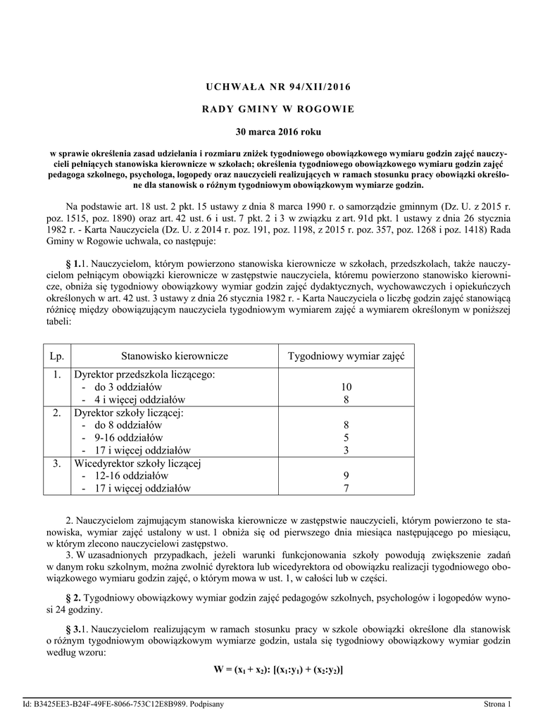 UCH WAŁA NR 94/ X II/ 2016 RADY GMINY W R O GO WIE 30 marca 2016 roku w sprawie określenia zasad udzielania i rozmiaru zniżek tygodniowego obowiązkowego wymiaru godzin zajęć nauczycieli pełniących stanowiska kierownicze w szkołach; określenia tygodniowego obowiązkowego wymiaru godzin zajęć pedagoga szkolnego, psychologa, logopedy oraz nauczycieli realizujących w ramach stosunku pracy obowiązki określone dla stanowisk o różnym tygodniowym obowiązkowym wymiarze godzin. Na podstawie art. 18 ust. 2 pkt. 15 ustawy z dnia 8 marca 1990 r. o samorządzie gminnym (Dz. U. z 2015 r. poz. 1515, poz. 1890) oraz art. 42 ust. 6 i ust. 7 pkt. 2 i 3 w związku z art. 91d pkt. 1 ustawy z dnia 26 stycznia 1982 r. - Karta Nauczyciela (Dz. U. z 2014 r. poz. 191, poz. 1198, z 2015 r. poz. 357, poz. 1268 i poz. 1418) Rada Gminy w Rogowie uchwala, co następuje: § 1.1. Nauczycielom, którym powierzono stanowiska kierownicze w szkołach, przedszkolach, także nauczycielom pełniącym obowiązki kierownicze w zastępstwie nauczyciela, któremu powierzono stanowisko kierownicze, obniża się tygodniowy obowiązkowy wymiar godzin zajęć dydaktycznych, wychowawczych i opiekuńczych określonych w art. 42 ust. 3 ustawy z dnia 26 stycznia 1982 r. - Karta Nauczyciela o liczbę godzin zajęć stanowiącą różnicę między obowiązującym nauczyciela tygodniowym wymiarem zajęć a wymiarem określonym w poniższej tabeli: Lp. 1. 2. 3. Stanowisko kierownicze Dyrektor przedszkola liczącego: - do 3 oddziałów - 4 i więcej oddziałów Dyrektor szkoły liczącej: - do 8 oddziałów - 9-16 oddziałów - 17 i więcej oddziałów Wicedyrektor szkoły liczącej - 12-16 oddziałów - 17 i więcej oddziałów Tygodniowy wymiar zajęć 10 8 8 5 3 9 7 2. Nauczycielom zajmującym stanowiska kierownicze w zastępstwie nauczycieli, którym powierzono te stanowiska, wymiar zajęć ustalony w ust. 1 obniża się od pierwszego dnia miesiąca następującego po miesiącu, w którym zlecono nauczycielowi zastępstwo. 3. W uzasadnionych przypadkach, jeżeli warunki funkcjonowania szkoły powodują zwiększenie zadań w danym roku szkolnym, można zwolnić dyrektora lub wicedyrektora od obowiązku realizacji tygodniowego obowiązkowego wymiaru godzin zajęć, o którym mowa w ust. 1, w całości lub w części. § 2. Tygodniowy obowiązkowy wymiar godzin zajęć pedagogów szkolnych, psychologów i logopedów wynosi 24 godziny. § 3.1. Nauczycielom realizującym w ramach stosunku pracy w szkole obowiązki określone dla stanowisk o różnym tygodniowym obowiązkowym wymiarze godzin, ustala się tygodniowy obowiązkowy wymiar godzin według wzoru: W = (x1 + x2): [(x1:y1) + (x2:y2)] Id: B3425EE3-B24F-49FE-8066-753C12E8B989. Podpisany Strona 1 gdzie: W - oznacza tygodniowy obowiązkowy wymiar godzin, x1,x2...- oznacza ilość godzin poszczególnych stanowisk przydzieloną nauczycielowi w arkuszu organizacji szkoły, y1,y2...- oznacza tygodniowy obowiązkowy wymiar godzin zajęć dydaktycznych, opiekuńczych, wychowawczych określona dla danych stanowisk w art. 42 ust. 3 ustawy Karta nauczyciela. 2. Wymiar, o którym mowa w ust. 1, przyjmuje się w pełnych godzinach tak, że czas do 0,5 godziny pomija się, a co najmniej 0,5 godziny przyjmuje się za pełną godzinę. 3. Obowiązkowy pełny wymiar godzin zajęć dydaktycznych, wychowawczych lub opiekuńczych nauczycieli zobowiązanych do pracy w innej szkole w celu uzupełnienia obowiązkowego wymiaru zajęć dydaktycznych ustala się według zasad określonych w ust. 1. § 4. Wykonanie uchwały powierza się Wójtowi Gminy Rogów. § 5. Traci moc uchwała nr 14/III/2000 Rady Gminy w Rogowie z dnia 13 kwietnia 2000 roku w sprawie zasad udzielania i rozmiaru zniżek nauczycielom zajmującym stanowiska kierownicze oraz zasad zwalniania od obowiązku realizacji zajęć dydaktycznych, wychowawczych i opiekuńczych oraz uchwała nr 13/III/2000 Rady Gminy w Rogowie z dnia 13 kwietnia 2000 roku w sprawie tygodniowego obowiązkowego wymiaru godzin zajęć nauczycieli nie wymienionych w art. 42 ust.3 Karty Nauczyciela oraz zasad zaliczania do wymiaru godzin zajęć nauczycieli przedmiotów o rożnym wymiarze godzin. § 6. Uchwała wchodzi w życie po upływie 14 dni od dnia jej ogłoszenia w Dzienniku Urzędowym Województwa Łódzkiego. Przewodniczący Rady Gminy w Rogowie Robert Góra Id: B3425EE3-B24F-49FE-8066-753C12E8B989. Podpisany Strona 2