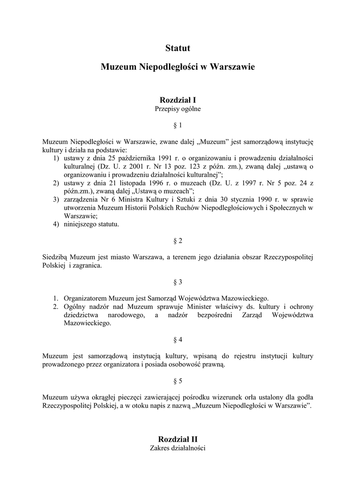 Statut Muzeum Niepodległości w Warszawie Rozdział I Przepisy ogólne §1 Muzeum Niepodległości w Warszawie, zwane dalej „Muzeum” jest samorządową instytucję kultury i działa na podstawie: 1) ustawy z dnia 25 października 1991 r. o organizowaniu i prowadzeniu działalności kulturalnej (Dz. U. z 2001 r. Nr 13 poz. 123 z późn. zm.), zwaną dalej „ustawą o organizowaniu i prowadzeniu działalności kulturalnej”; 2) ustawy z dnia 21 listopada 1996 r. o muzeach (Dz. U. z 1997 r. Nr 5 poz. 24 z późn.zm.), zwaną dalej „Ustawą o muzeach”; 3) zarządzenia Nr 6 Ministra Kultury i Sztuki z dnia 30 stycznia 1990 r. w sprawie utworzenia Muzeum Historii Polskich Ruchów Niepodległościowych i Społecznych w Warszawie; 4) niniejszego statutu. §2 Siedzibą Muzeum jest miasto Warszawa, a terenem jego działania obszar Rzeczypospolitej Polskiej i zagranica. §3 1. Organizatorem Muzeum jest Samorząd Województwa Mazowieckiego. 2. Ogólny nadzór nad Muzeum sprawuje Minister właściwy ds. kultury i ochrony dziedzictwa narodowego, a nadzór bezpośredni Zarząd Województwa Mazowieckiego. §4 Muzeum jest samorządową instytucją kultury, wpisaną do rejestru instytucji kultury prowadzonego przez organizatora i posiada osobowość prawną. §5 Muzeum używa okrągłej pieczęci zawierającej pośrodku wizerunek orła ustalony dla godła Rzeczypospolitej Polskiej, a w otoku napis z nazwą „Muzeum Niepodległości w Warszawie”. Rozdział II Zakres działalności §6 1. Muzeum gromadzi i przechowuje dobra kultury polskiej w zakresie dokumentowania i popularyzowania wiedzy historycznej o dziejach Polski od czasów rozbiorów do współczesności, ze szczególnym uwzględnieniem działalności niepodległościowej oraz państwowotwórczej, a także procesów związanych z kształtowaniem się tożsamości narodowej i regionalnej w kontekście integracji europejskiej oraz globalizacji. 2. Muzeum informuje o treściach gromadzonych zbiorów, upowszechnia podstawowe wartości historii, nauki i kultury polskiej, kształtuje wrażliwość poznawczą i estetyczną, umożliwia kontakt ze zbiorami. §7 Muzeum realizuje cele określone w § 6 poprzez: 1) gromadzenie zabytków; 2) katalogowanie i naukowe opracowywanie zgromadzonych zbiorów; 3) przechowywanie zgromadzonych zabytków, w warunkach zapewniających im właściwy stan zachowania i bezpieczeństwo, oraz magazynowanie ich w sposób dostępny dla celów naukowych; 4) zabezpieczanie i konserwację zbiorów; 5) urządzanie wystaw stałych i czasowych; 6) organizowanie i prowadzenie badań naukowych; 7) prowadzenie działalności edukacyjnej; 8) popieranie i prowadzenie działalności artystycznej i upowszechniającej kulturę; 9) udostępnianie zbiorów do celów edukacyjnych i naukowych; 10) zapewnianie właściwych warunków zwiedzania oraz korzystania ze zbiorów i zgromadzonych informacji; 11) prowadzenie działalności wydawniczej. §8 W realizacji celów statutowych Muzeum może współdziałać zarówno z osobami prawnymi, jak i osobami fizycznymi oraz jednostkami organizacyjnymi nieposiadającymi osobowości prawnej. §9 1. W skład Muzeum wchodzą następujące działy i oddziały: 1) Dział Historii; 2) Dział Gromadzenia, Inwentaryzacji i Konserwacji Zbiorów; 3) Dział Edukacji i Promocji; 4) Dział Finansowo – Księgowy; 5) Biblioteka Naukowa; 6) Oddział – Muzeum Więzienia Pawiak, z filią Mauzoleum Walki i Męczeństwa a Al. Szucha; 7) Oddział – Muzeum X Pawilonu Cytadeli Warszawskiej; 8) Dział – Instytut Kresowy. 2. W Muzeum mogą być tworzone samodzielne stanowiska pracy oraz inne komórki organizacyjne niezbędne do właściwego funkcjonowania Muzeum. § 10 Szczegółową organizację wewnętrzną Muzeum określa regulamin organizacyjny nadawany przez dyrektora, po zasięgnięciu opinii organizatora oraz działających w Muzeum organizacji związkowych i stowarzyszeń twórców. Rozdział III Organy zarządzające i doradcze § 11 1. Dyrektor zarządza Muzeum i reprezentuje go na zewnątrz. 2. Dyrektor organizuje pracę Muzeum oraz odpowiada za całokształt jego działalności. 3. Do zakresu działania Dyrektora Muzeum należy w szczególności: 1) Podejmowanie niezbędnych działań w sferze organizacyjnej i merytorycznej zmierzających do funkcjonowania Muzeum na najwyższym poziomie; 2) Kierownictwo w sprawach naukowo – badawczych, eduklacyjnych, organizacyjnych i administracyjno – finansowych; 3) Nadzór nad zbiorami i ich ewidencjonowaniem oraz nad majątkiem Muzeum; 4) Wykonywanie uprawnień zwierzchnika służbowego w stosunku do pracowników Muzeum oraz wykonywanie czynności z zakresu prawa pracy; 5) Przestrzeganie dyscypliny finansowej; 6) Stwarzanie warunków do podnoszenia kwalifikacji zawodowej pracowników Muzeum; 7) Stwarzanie prawidłowego zabezpieczenia i ochrony mienia Muzeum, w tym muzealiów; 8) Wydawanie w obowiązującym trybie zarządzeń, regulaminów i innych aktów wewnętrznych; 9) Przedstawianie właściwym instytucjom i organizatorowi planów rzeczowych i finansowych, sprawozdań oraz wniosków inwestycyjnych. § 12 1. Dyrektora powołuje i odwołuje Zarząd Województwa Mazowieckiego w trybie przewidzianym ustawą o organizowaniu i prowadzeniu działalności kulturalnej oraz o muzeach. 2. Dyrektor zarządza Muzeum przy pomocy nie więcej niż dwóch Zastępców dyrektora, powoływanych i odwoływanych przez dyrektora Muzeum, w uzgodnieniu z Zarządem Województwa Mazowieckiego. 3. Zastępcy dyrektora zatrudniani są na podstawie umowy o pracę. § 13 1. Przy Muzeum działa Rada Muzeum, której członków powołuje i odwołuje Zarząd Województwa Mazowieckiego, na zasadach określonych w art. 11 ustawy o muzeach. 2. Rada Muzeum działa w zakresie i zgodnie z zasadami określonymi w art. 11 ustawy o muzeach. 3. Rada Muzeum składa się z 10 osób. § 14 1. Dyrektor Muzeum może tworzyć, z własnej inicjatywy lub na wniosek co najmniej połowy zatrudnionych muzealnik