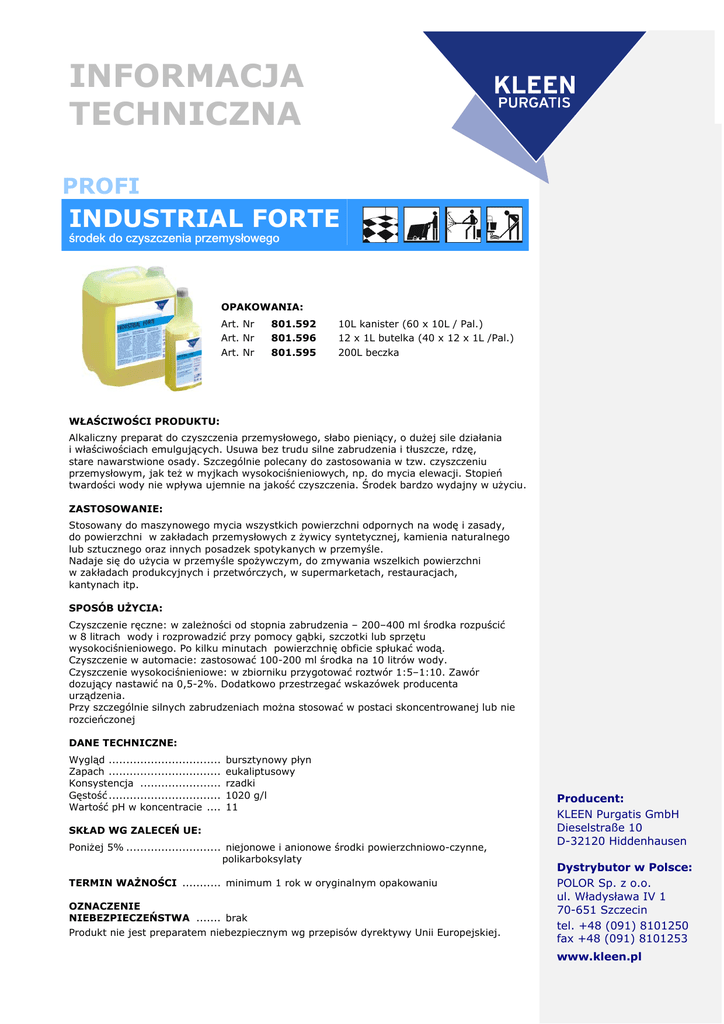 INFORMACJA TECHNICZNA PROFI INDUSTRIAL FORTE środek do czyszczenia przemysłowego OPAKOWANIA: Art. Nr Art. Nr Art. Nr 801.592 801.596 801.595 10L kanister (60 x 10L / Pal.) 12 x 1L butelka (40 x 12 x 1L /Pal.) 200L beczka WŁAŚCIWOŚCI PRODUKTU: Alkaliczny preparat do czyszczenia przemysłowego, słabo pieniący, o dużej sile działania i właściwościach emulgujących. Usuwa bez trudu silne zabrudzenia i tłuszcze, rdzę, stare nawarstwione osady. Szczególnie polecany do zastosowania w tzw. czyszczeniu przemysłowym, jak też w myjkach wysokociśnieniowych, np. do mycia elewacji. Stopień twardości wody nie wpływa ujemnie na jakość czyszczenia. Środek bardzo wydajny w użyciu. ZASTOSOWANIE: Stosowany do maszynowego mycia wszystkich powierzchni odpornych na wodę i zasady, do powierzchni w zakładach przemysłowych z żywicy syntetycznej, kamienia naturalnego lub sztucznego oraz innych posadzek spotykanych w przemyśle. Nadaje się do użycia w przemyśle spożywczym, do zmywania wszelkich powierzchni w zakładach produkcyjnych i przetwórczych, w supermarketach, restauracjach, kantynach itp. SPOSÓB UŻYCIA: Czyszczenie ręczne: w zależności od stopnia zabrudzenia – 200–400 ml środka rozpuścić w 8 litrach wody i rozprowadzić przy pomocy gąbki, szczotki lub sprzętu wysokociśnieniowego. Po kilku minutach powierzchnię obficie spłukać wodą. Czyszczenie w automacie: zastosować 100-200 ml środka na 10 litrów wody. Czyszczenie wysokociśnieniowe: w zbiorniku przygotować roztwór 1:5–1:10. Zawór dozujący nastawić na 0,5-2%. Dodatkowo przestrzegać wskazówek producenta urządzenia. Przy szczególnie silnych zabrudzeniach można stosować w postaci skoncentrowanej lub nie rozcieńczonej DANE TECHNICZNE: Wygląd ................................ Zapach ................................ Konsystencja ....................... Gęstość ................................ Wartość pH w koncentracie .... bursztynowy płyn eukaliptusowy rzadki 1020 g/l 11 SKŁAD WG ZALECEŃ UE: Poniżej 5% ........................... niejonowe i anionowe środki powierzchniowo-czynne, polikarboksylaty TERMIN WAŻNOŚCI ........... minimum 1 rok w oryginalnym opakowaniu OZNACZENIE NIEBEZPIECZEŃSTWA ....... brak Produkt nie jest preparatem niebezpiecznym wg przepisów dyrektywy Unii Europejskiej. Producent: KLEEN Purgatis GmbH Dieselstraße 10 D-32120 Hiddenhausen Dystrybutor w Polsce: POLOR Sp. z o.o. Producent: ul. Władysława IV 1 KLEEN Szczecin Purgatis GmbH 70-651 Dieselstraße tel. +48 (091)10 8101250 D-32120 Hiddenhausen fax +48 (091) 8101253 www.kleen.pl Dystrybutor w Polsce: POLOR Sp. z o.o. ul. Władysława IV 1 70-651 Szczecin tel. +48 (091) 8101250