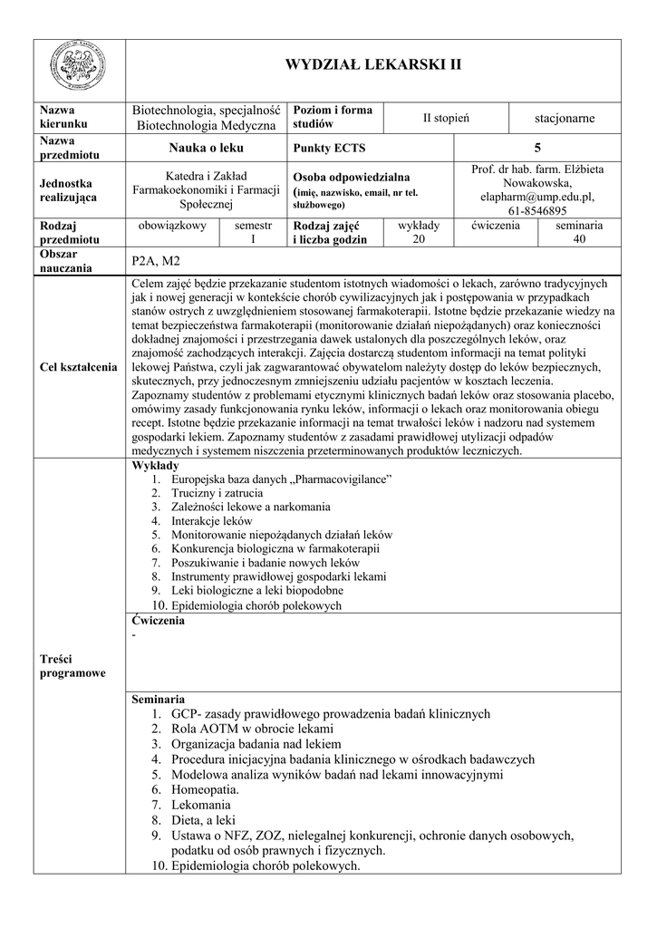 WYDZIAŁ LEKARSKI II Nazwa kierunku Nazwa przedmiotu Jednostka realizująca Rodzaj przedmiotu Obszar nauczania Cel kształcenia Biotechnologia, specjalność Poziom i forma Biotechnologia Medyczna studiów Nauka o leku Katedra i Zakład Farmakoekonomiki i Farmacji Społecznej obowiązkowy semestr I II stopień 5 Punkty ECTS Osoba odpowiedzialna (imię, nazwisko, email, nr tel. służbowego) Rodzaj zajęć i liczba godzin stacjonarne wykłady 20 Prof. dr hab. farm. Elżbieta Nowakowska, [email protected], 61-8546895 ćwiczenia seminaria 40 P2A, M2 Celem zajęć będzie przekazanie studentom istotnych wiadomości o lekach, zarówno tradycyjnych jak i nowej generacji w kontekście chorób cywilizacyjnych jak i postępowania w przypadkach stanów ostrych z uwzględnieniem stosowanej farmakoterapii. Istotne będzie przekazanie wiedzy na temat bezpieczeństwa farmakoterapii (monitorowanie działań niepożądanych) oraz konieczności dokładnej znajomości i przestrzegania dawek ustalonych dla poszczególnych leków, oraz znajomość zachodzących interakcji. Zajęcia dostarczą studentom informacji na temat polityki lekowej Państwa, czyli jak zagwarantować obywatelom należyty dostęp do leków bezpiecznych, skutecznych, przy jednoczesnym zmniejszeniu udziału pacjentów w kosztach leczenia. Zapoznamy studentów z problemami etycznymi klinicznych badań leków oraz stosowania placebo, omówimy zasady funkcjonowania rynku leków, informacji o lekach oraz monitorowania obiegu recept. Istotne będzie przekazanie informacji na temat trwałości leków i nadzoru nad systemem gospodarki lekiem. Zapoznamy studentów z zasadami prawidłowej utylizacji odpadów medycznych i systemem niszczenia przeterminowanych produktów leczniczych. Wykłady 1. Europejska baza danych „Pharmacovigilance” 2. Trucizny i zatrucia 3. Zależności lekowe a narkomania 4. Interakcje leków 5. Monitorowanie niepożądanych działań leków 6. Konkurencja biologiczna w farmakoterapii 7. Poszukiwanie i badanie nowych leków 8. Instrumenty prawidłowej gospodarki lekami 9. Leki biologiczne a leki biopodobne 10. Epidemiologia chorób polekowych Ćwiczenia - Treści programowe Seminaria GCP- zasady prawidłowego prowadzenia badań klinicznych Rola AOTM w obrocie lekami Organizacja badania nad lekiem Procedura inicjacyjna badania klinicznego w ośrodkach badawczych Modelowa analiza wyników badań nad lekami innowacyjnymi Homeopatia. Lekomania Dieta, a leki Ustawa o NFZ, ZOZ, nielegalnej konkurencji, ochronie danych osobowych, podatku od osób prawnych i fizycznych. 10. Epidemiologia chorób polekowych. 1. 2. 3. 4. 5. 6. 7. 8. 9. Inne - Formy i metody dydaktyczne Forma i warunki zaliczenia Literatura podstawowa (nie więcej niż 3 pozycje) Literatura uzupełniająca Przedmiotowe efekty kształcenia Prezentacje multimedialne (wykłady, seminaria), rozmowa i dyskusja ze studentami (seminaria) Egzamin pisemny - testowy (zaliczenie od 60%) 1. Herman Z.S., Kmieciak-Kołady K.: Farmakologia. Podręcznik dla studentów pielęgniarstwa, kompendium dla studentów wydziałów lekarskich i farmaceutów. Wydawnictwo Śląskiej Akademii Medycznej, Katowice 2001. 2. Kostowski W, Herman Z.: Farmakologia - podstawy farmakoterapii tom 1-2. PZWL Warszawa 2004. 3. Mutscher E.: Farmakologia i toksykologia – red. A Danysz, Urban 2004. 1. Katzung G et al. Basic and Clinical Pharmacology Edition IX. 2004. 2. Matusiewicz W.: Niezamierzone skutki stosowania leków. Łódź 2000. 3. Nowakowska E. [red.]: Postępy farmakoterapii – nowe leki przeciwdepresyjne. Dział Wydawnictw Uczelnianych AMiKM, Poznań 2003. 4. Nowakowska E. [red.]: Postępy farmakoterapii – nowe leki przeciwdepresyjne – część II. Dział Wydawnictw Uczelnianych AMiKM, Poznań 2005. 5. Rajtar-Cynke G.: Farmakologia dla studentów i absolwentów wydziału pielęgniarstwa CZELEJ 2002. Efekty kształcenia Przedstawić w formie operatorowej: Odniesienie do - zna kierunkowych - potrafi efektów kształcenia - rozumie - wykazuje umiejętności….. E_W01 E_W02 E_W03 Zna Prawo Farmaceutyczne oraz podstawowe narzędzia gospodarki K_W02 lekiem w polskim systemie opieki zdrowotnej K_W17 K_W18 K_W21 Zna niebezpieczne interakcje lekowe oraz narzędzia monitorowania K_W02 działań niepożądanych K_W07 K_W08 K_W15 Zna podstawowe pojęcia i reguły prowadzenia badań klinicznych. K_W05 K_W13 K_W19 E_U01 Potrafi zidentyfikować mechanizmy wybranych leków E_U02 Potrafi zidentyfikować dokumentację badań klinicznych E_U03 Zna zasady rejestracji leków oraz oceny technologii medycznych E_K01 Potrafi efektywnie wykorzystywać znajomość Prawa Farmaceutycznego oraz zapobiegania występowaniu zdarzeń niepożądanych Bilans nakładu Na jeden pkt ECTS przypada od 25-30 godzin nakładu pracy studenta, w tym godziny kontaktowe z nauczycielem akademickim ( wykłady, seminaria, ćwiczenia, konsultacje) plus samodzielna praca studenta K_U01 K_U06 K_U08 K_U05 K_U08 K_U03 K_U05 K_U08 K_K03 K_K06 K_K07 K_K08 K_K09 pracy studenta (przygotowanie do zajęć, do kolokwiów, do egzaminu, przygotowaniu projektów, prezentacji, opracowywanie protokołów) Godziny kontaktowe z nauczycielem akademickim udział w wykładach udział w ćwiczeniach udział w seminariach udział w konsultacjach związanych z zajęciami Samodzielna praca studenta przygotowanie do ćwiczeń przygotowanie do seminariów przygotowanie do kolokwiów przygotowanie do egzaminu 10 x 2 10 x 4 5x1 Razem 20 40 5 65 10 x 2 3x5 1 x 25 Razem 20 15 25 60 Liczba ECTS Liczba godzin Wskaźniki ilościowe Nakład pracy studenta związany z zajęciami wymagającymi bezpośredniego udziału nauczyciela 65 2 Nakład pracy studenta związany z zajęciami o charakterze praktycznym Łącznie (godziny kontaktowe z nauczycielem i samodzielna praca) 125 5 Metody weryfikacji efektu kształcenia Formujące Nr efektu kształcenia (np. wejściówka, obserwacja pracy studenta w trakcie zajęć, ocena zdolności do samodzielnej pracy….) E_W01-03 Obserwacja p