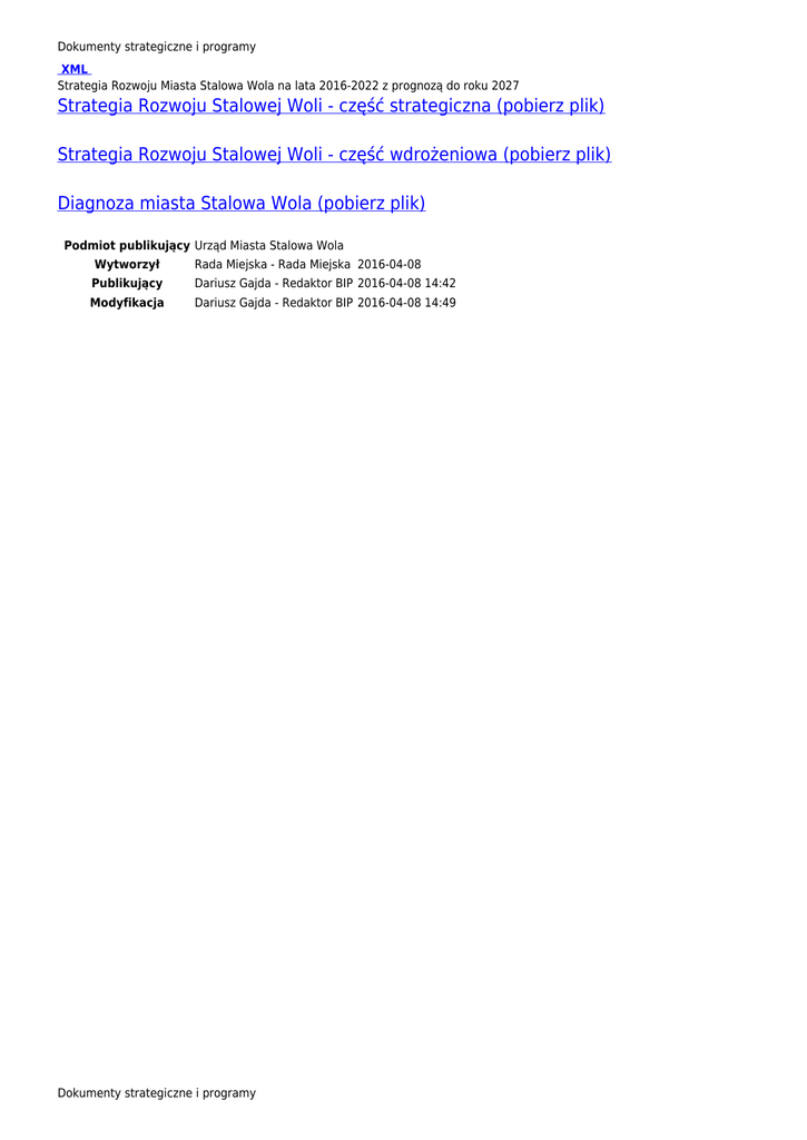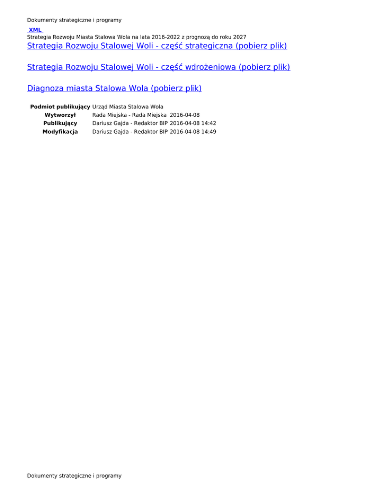 Dokumenty strategiczne i programy XML Strategia Rozwoju Miasta Stalowa Wola na lata 2016-2022 z prognozą do roku 2027 Strategia Rozwoju Stalowej Woli - część strategiczna (pobierz plik) Strategia Rozwoju Stalowej Woli - część wdrożeniowa (pobierz plik) Diagnoza miasta Stalowa Wola (pobierz plik) Podmiot publikujący Urząd Miasta Stalowa Wola Wytworzył Rada Miejska - Rada Miejska 2016-04-08 Publikujący Dariusz Gajda - Redaktor BIP 2016-04-08 14:42 Modyfikacja Dariusz Gajda - Redaktor BIP 2016-04-08 14:49 Dokumenty strategiczne i programy