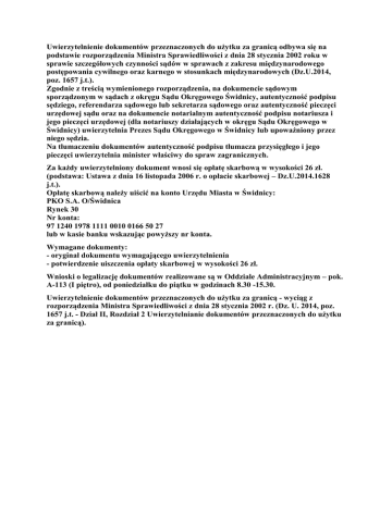 Uwierzytelnienie dokumentów przeznaczonych do użytku za granicą odbywa się na podstawie rozporządzenia Ministra Sprawiedliwości z dnia 28 stycznia 2002 roku w sprawie szczegółowych czynności sądów w sprawach z zakresu międzynarodowego postępowania cywilnego oraz karnego w stosunkach międzynarodowych (Dz.U.2014, poz. 1657 j.t.). Zgodnie z treścią wymienionego rozporządzenia, na dokumencie sądowym sporządzonym w sądach z okręgu Sądu Okręgowego Świdnicy, autentyczność podpisu sędziego, referendarza sądowego lub sekretarza sądowego oraz autentyczność pieczęci urzędowej sądu oraz na dokumencie notarialnym autentyczność podpisu notariusza i jego pieczęci urzędowej (dla notariuszy działających w okręgu Sądu Okręgowego w Świdnicy) uwierzytelnia Prezes Sądu Okręgowego w Świdnicy lub upoważniony przez niego sędzia. Na tłumaczeniu dokumentów autentyczność podpisu tłumacza przysięgłego i jego pieczęci uwierzytelnia minister właściwy do spraw zagranicznych. Za każdy uwierzytelniony dokument wnosi się opłatę skarbową w wysokości 26 zł. (podstawa: Ustawa z dnia 16 listopada 2006 r. o opłacie skarbowej – Dz.U.2014.1628 j.t.). Opłatę skarbową należy uiścić na konto Urzędu Miasta w Świdnicy: PKO S.A. O/Świdnica Rynek 30 Nr konta: 97 1240 1978 1111 0010 0166 50 27 lub w kasie banku wskazując powyższy nr konta. Wymagane dokumenty: - oryginał dokumentu wymagającego uwierzytelnienia - potwierdzenie uiszczenia opłaty skarbowej w wysokości 26 zł. Wnioski o legalizację dokumentów realizowane są w Oddziale Administracyjnym – pok. A-113 (I piętro), od poniedziałku do piątku w godzinach 8.30 -15.30. Uwierzytelnienie dokumentów przeznaczonych do użytku za granicą - wyciąg z rozporządzenia Ministra Sprawiedliwości z dnia 28 stycznia 2002 r. (Dz. U. 2014, poz. 1657 j.t. - Dział II, Rozdział 2 Uwierzytelnianie dokumentów przeznaczonych do użytku za granicą).