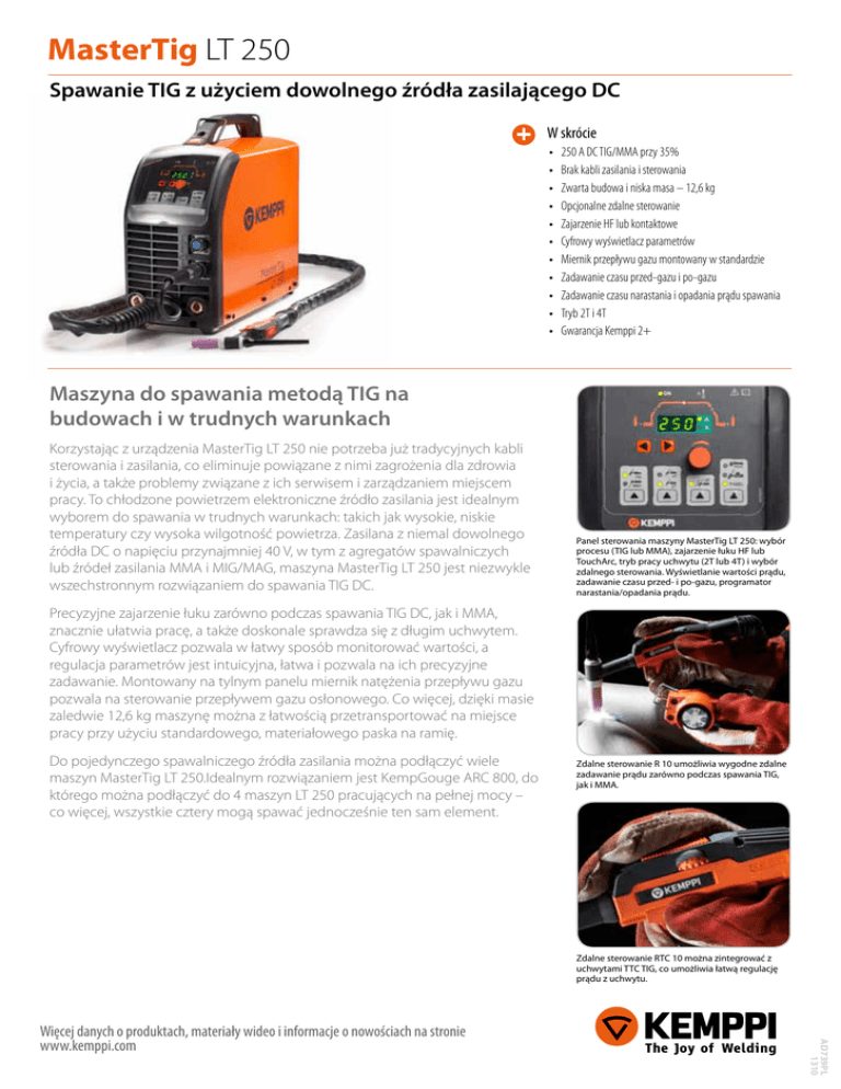 MasterTig LT 250 Spawanie TIG z użyciem dowolnego źródła zasilającego DC W skrócie • • • • • • • • • • • 2 50 A DC TIG/MMA przy 35% Brak kabli zasilania i sterowania Zwarta budowa i niska masa – 12,6 kg Opcjonalne zdalne sterowanie Zajarzenie HF lub kontaktowe Cyfrowy wyświetlacz parametrów Miernik przepływu gazu montowany w standardzie Zadawanie czasu przed-gazu i po-gazu Zadawanie czasu narastania i opadania prądu spawania Tryb 2T i 4T Gwarancja Kemppi 2+ Maszyna do spawania metodą TIG na budowach i w trudnych warunkach Korzystając z urządzenia MasterTig LT 250 nie potrzeba już tradycyjnych kabli sterowania i zasilania, co eliminuje powiązane z nimi zagrożenia dla zdrowia i życia, a także problemy związane z ich serwisem i zarządzaniem miejscem pracy. To chłodzone powietrzem elektroniczne źródło zasilania jest idealnym wyborem do spawania w trudnych warunkach: takich jak wysokie, niskie temperatury czy wysoka wilgotność powietrza. Zasilana z niemal dowolnego źródła DC o napięciu przynajmniej 40 V, w tym z agregatów spawalniczych lub źródeł zasilania MMA i MIG/MAG, maszyna MasterTig LT 250 jest niezwykle wszechstronnym rozwiązaniem do spawania TIG DC. Panel sterowania maszyny MasterTig LT 250: wybór procesu (TIG lub MMA), zajarzenie łuku HF lub TouchArc, tryb pracy uchwytu (2T lub 4T) i wybór zdalnego sterowania. Wyświetlanie wartości prądu, zadawanie czasu przed- i po-gazu, programator narastania/opadania prądu. Precyzyjne zajarzenie łuku zarówno podczas spawania TIG DC, jak i MMA, znacznie ułatwia pracę, a także doskonale sprawdza się z długim uchwytem. Cyfrowy wyświetlacz pozwala w łatwy sposób monitorować wartości, a regulacja parametrów jest intuicyjna, łatwa i pozwala na ich precyzyjne zadawanie. Montowany na tylnym panelu miernik natężenia przepływu gazu pozwala na sterowanie przepływem gazu osłonowego. Co więcej, dzięki masie zaledwie 12,6 kg maszynę można z łatwością przetransportować na miejsce pracy przy użyciu standardowego, materiałowego paska na ramię. Do pojedynczego spawalniczego źródła zasilania można podłączyć wiele maszyn MasterTig LT 250.Idealnym rozwiązaniem jest KempGouge ARC 800, do którego można podłączyć do 4 maszyn LT 250 pracujących na pełnej mocy – co więcej, wszystkie cztery mogą spawać jednocześnie ten sam element. Zdalne sterowanie R 10 umożliwia wygodne zdalne zadawanie prądu zarówno podczas spawania TIG, jak i MMA. Zdalne sterowanie RTC 10 można zintegrować z uchwytami TTC TIG, co umożliwia łatwą regulację prądu z uchwytu. AD739PL 1310 Więcej danych o produktach, materiały wideo i informacje o nowościach na stronie www.kemppi.com MasterTig LT 250 Dane techniczne MasterTig LT 250 Zakres napięcia zasilania DC Wejściowa moc znamionowa 40-100 V 8,6 kW / 9,1 kVA Prąd zasilania, I1maks. Prąd zasilania, I1skut. TIG 155 A MMA 230 A TIG 90 A MMA 135 A Kabel zasilający 35 mm² Cykl pracy 40°C Zakres parametrów spawania TIG 35% 250 A / 20 V TIG 60% 200 A / 18 V TIG 100% 160 A / 16,4 V MMA 35% 250 A / 30 V MMA 60% 200 A / 28 V MMA 100% 160 A / 26,4 V TIG 5 A / 1 V-250 A / 35 V MMA 10 A / 1 V-250 A / 35 V Napięcie biegu jałowego 90 V Moc biegu jałowego Sprawność dla 100% TIG 8W MMA 21 W TIG 80% MMA 86% Napięcie zajarzenia łuku 10 kV Elektrody do spawania MMA 1,6 –5,0 mm Wymiary zewnętrzne (dł. x sz. x wys.) 460 × 180 × 390 mm Masa 12,6 kg Klasa temperaturowa F Stopień ochrony IP23S Klasa kompatybilności elektromagnetycznej A Zakres temperatur pracy od -20°C do +40°C Zakres temperatur przechowywania od -40°C do +60°C Normy: IEC 60974-1:2012, IEC 60974-10:2007, IEC 60974-3:2007 Dane do zamówienia MasterTig LT 250 6115100 Kable Uchwyty Przepływomierz gazu, zegarowy AR 6265136 TTC 160, 4 m 627016004 Wąż gazu osłonowego (4,5 m) W001077 Kabel spawalniczy, 35 mm², 5 m 6184301 TTC 160, 8 m 627016008 Pasek do przenoszenia 9592160 Kabel spawalniczy, 35 mm², 10 m 6184302 TTC 220, 4 m 627022004 Kabel masy, 35 mm², 5 m 6184311 TTC 220, 8 m 627022008 Opcjonalne źródło zasilania dla wielu użytkowników Kabel masy, 35 mm², 10 m 6184312 Opcjonalne zdalne sterowanie Przedłużacz, 35 mm², 5 m 6183305 RTC 10 6185477 Przedłużacz, 35 mm², 10 m 6183310 RTC 20 6185478 R 10, 5 m 6185409 R 10, 10 m 618540901 R 11F 6185407 6284000 AD739PL 1310 Więcej danych o produktach, materiały wideo i informacje o nowościach na stronie www.kemppi.com KempGouge ARC 800