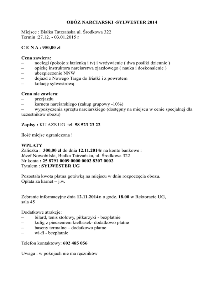 OBÓZ NARCIARSKI -SYLWESTER 2014 Miejsce : Białka Tatrzańska ul. Środkowa 322 Termin :27.12. - 03.01.2015 r C E N A : 950,00 zł Cena zawiera: – noclegi (pokoje z łazienką i tv) i wyżywienie ( dwa posiłki dziennie ) – opiekę instruktora narciarstwa zjazdowego ( nauka i doskonalenie ) – ubezpieczenie NNW – dojazd z Nowego Targu do Białki i z powrotem – kolację sylwestrową Cena nie zawiera: – przejazdu – karnetu narciarskiego (zakup grupowy -10%) – wypożyczenia sprzętu narciarskiego (dostępny na miejscu w cenie specjalnej dla uczestników obozu) Zapisy : KU AZS UG tel. 58 523 23 22 Ilość miejsc ograniczona ! WPŁATY Zaliczka : 300,00 zł do dnia 12.11.2014r na konto bankowe : Józef Nowobilski, Białka Tatrzańska, ul. Środkowa 322 Nr konta : 25 8791 0009 0000 0002 8307 0002 Tytułem : SYLWESTER UG Pozostała kwota płatna gotówką na miejscu w dniu rozpoczęcia obozu. Opłata za karnet – j.w. Zebranie informacyjne dnia 12.11.2014r. o godz. 18.00 w Rektoracie UG, sala 45 Dodatkowe atrakcje: – bilard, tenis stołowy, piłkarzyki - bezpłatnie – kulig z pieczeniem kiełbasek- dodatkowo płatne – baseny termalne – dodatkowo płatne – wi-fi - bezpłatnie Telefon kontaktowy: 602 485 056 Uwaga : w pokojach nie ma ręczników