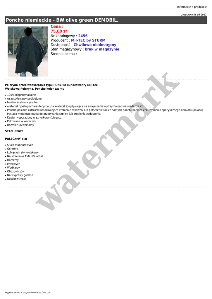 Informacje o produkcie Utworzono 08-03-2017 Poncho niemieckie - BW olive green DEMOBIL. Cena : 75,00 zł Nr katalogowy : 2456 Producent : Mil-TEC by STURM Dostępność : Chwilowo niedostępny Stan magazynowy : brak w magazynie Średnia ocena : ● ● ● ● ● ● ● ● 100% nieprzemakalne wszystkie szwy podklejone bardzo szybko wysycha materiał rip-stop (charakterystyczna krateczka)wpływająca na zwiększenie wytrzymałości na rozdarcia itp. Poncho posiada zatrzaski umożliwiające zrobienie rękawów lub połączenie takich samych ponch razem w celu zrobienia specyficznego namiotu (pałatki). Posiada metalowe oczka do przetykania szpilek lub zrobienia zadaszenia. Kaptur wyposażony w sznurkowy ściągacz. Pakowane w woreczek Rozmiar uniwersalny STAN NOWE POLECAMY dla: ● ● ● ● ● ● ● ● w ● Służb mundurowych Ochrony Lubiących styl wojskowy Na strzelanki ASG i Paintball Harcerzy Myśliwych Wędkarzy Obozowiczów Na wyprawy górskie Działkowiczów at ● er m ar k Peleryna przeciwdeszczowa typu PONCHO Bundeswehry Mil-Tec Wojskowa Peleryna, Poncho kolor czarny Wygenerowano w programie www.oscGold.com