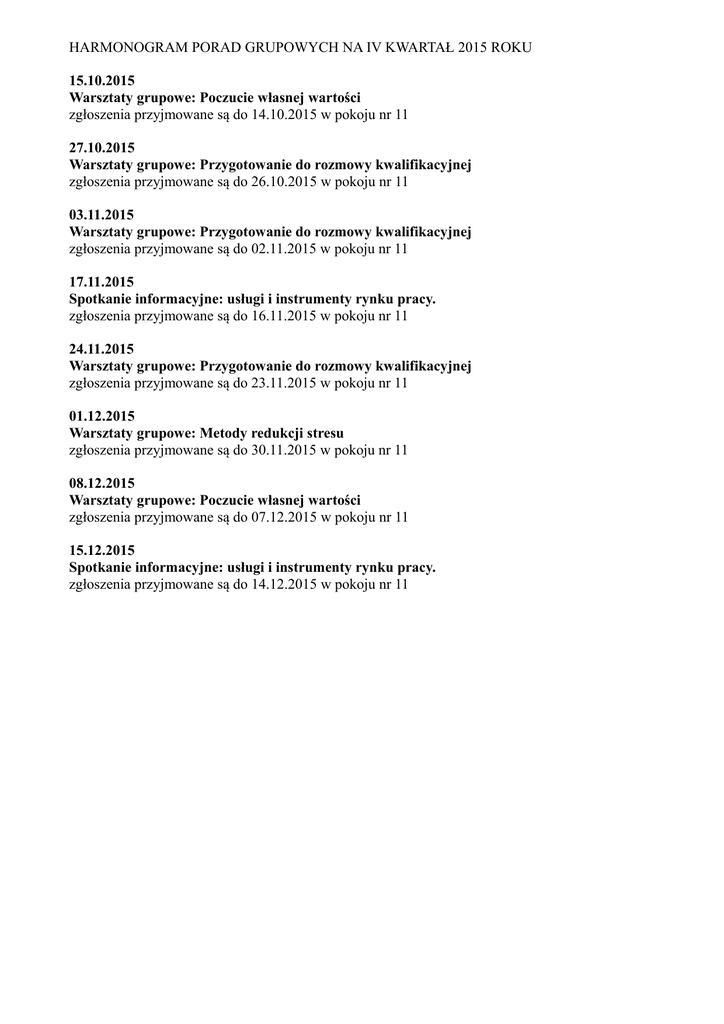 HARMONOGRAM PORAD GRUPOWYCH NA IV KWARTAŁ 2015 ROKU 15.10.2015 Warsztaty grupowe: Poczucie własnej wartości zgłoszenia przyjmowane są do 14.10.2015 w pokoju nr 11 27.10.2015 Warsztaty grupowe: Przygotowanie do rozmowy kwalifikacyjnej zgłoszenia przyjmowane są do 26.10.2015 w pokoju nr 11 03.11.2015 Warsztaty grupowe: Przygotowanie do rozmowy kwalifikacyjnej zgłoszenia przyjmowane są do 02.11.2015 w pokoju nr 11 17.11.2015 Spotkanie informacyjne: usługi i instrumenty rynku pracy. zgłoszenia przyjmowane są do 16.11.2015 w pokoju nr 11 24.11.2015 Warsztaty grupowe: Przygotowanie do rozmowy kwalifikacyjnej zgłoszenia przyjmowane są do 23.11.2015 w pokoju nr 11 01.12.2015 Warsztaty grupowe: Metody redukcji stresu zgłoszenia przyjmowane są do 30.11.2015 w pokoju nr 11 08.12.2015 Warsztaty grupowe: Poczucie własnej wartości zgłoszenia przyjmowane są do 07.12.2015 w pokoju nr 11 15.12.2015 Spotkanie informacyjne: usługi i instrumenty rynku pracy. zgłoszenia przyjmowane są do 14.12.2015 w pokoju nr 11