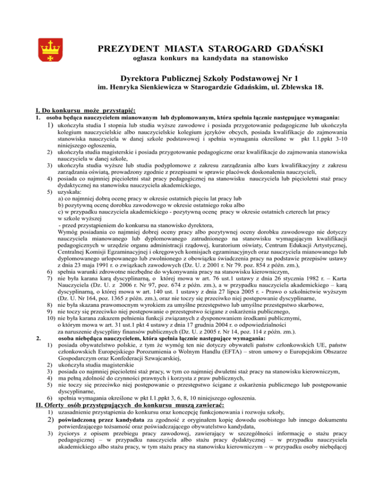 PREZYDENT MIASTA STAROGARD GDAŃSKI ogłasza konkurs na kandydata na stanowisko Dyrektora Publicznej Szkoły Podstawowej Nr 1 im. Henryka Sienkiewicza w Starogardzie Gdańskim, ul. Zblewska 18. I. Do konkursu może przystąpić: 1. osoba będąca nauczycielem mianowanym lub dyplomowanym, która spełnia łącznie następujące wymagania: 1) ukończyła studia I stopnia lub studia wyższe zawodowe i posiada przygotowanie pedagogiczne lub ukończyła kolegium nauczycielskie albo nauczycielskie kolegium języków obcych, posiada kwalifikacje do zajmowania stanowiska nauczyciela w danej szkole podstawowej i spełnia wymagania określone w pkt I.1.ppkt 3-10 niniejszego ogłoszenia, 2) ukończyła studia magisterskie i posiada przygotowanie pedagogiczne oraz kwalifikacje do zajmowania stanowiska nauczyciela w danej szkole, 3) ukończyła studia wyższe lub studia podyplomowe z zakresu zarządzania albo kurs kwalifikacyjny z zakresu zarządzania oświatą, prowadzony zgodnie z przepisami w sprawie placówek doskonalenia nauczycieli, 4) posiada co najmniej pięcioletni staż pracy pedagogicznej na stanowisku nauczyciela lub pięcioletni staż pracy dydaktycznej na stanowisku nauczyciela akademickiego, 5) uzyskała: a) co najmniej dobrą ocenę pracy w okresie ostatnich pięciu lat pracy lub b) pozytywną ocenę dorobku zawodowego w okresie ostatniego roku albo c) w przypadku nauczyciela akademickiego - pozytywną ocenę pracy w okresie ostatnich czterech lat pracy w szkole wyższej - przed przystąpieniem do konkursu na stanowisko dyrektora, Wymóg posiadania co najmniej dobrej oceny pracy albo pozytywnej oceny dorobku zawodowego nie dotyczy nauczyciela mianowanego lub dyplomowanego zatrudnionego na stanowisku wymagającym kwalifikacji pedagogicznych w urzędzie organu administracji rządowej, kuratorium oświaty, Centrum Edukacji Artystycznej, Centralnej Komisji Egzaminacyjnej i okręgowych komisjach egzaminacyjnych oraz nauczyciela mianowanego lub dyplomowanego urlopowanego lub zwolnionego z obowiązku świadczenia pracy na podstawie przepisów ustawy z dnia 23 maja 1991 r. o związkach zawodowych (Dz. U. z 2001 r. Nr 79. poz. 854 z późn. zm.), 6) spełnia warunki zdrowotne niezbędne do wykonywania pracy na stanowisku kierowniczym, 7) nie była karana karą dyscyplinarną, o której mowa w art. 76 ust.1 ustawy z dnia 26 stycznia 1982 r. – Karta Nauczyciela (Dz. U. z 2006 r. Nr 97, poz. 674 z późn. zm.), a w przypadku nauczyciela akademickiego – karą dyscyplinarną, o której mowa w art. 140 ust. 1 ustawy z dnia 27 lipca 2005 r. - Prawo o szkolnictwie wyższym (Dz. U. Nr 164, poz. 1365 z późn. zm.), oraz nie toczy się przeciwko niej postępowanie dyscyplinarne, 8) nie była skazana prawomocnym wyrokiem za umyślne przestępstwo lub umyślne przestępstwo skarbowe, 9) nie toczy się przeciwko niej postępowanie o przestępstwo ścigane z oskarżenia publicznego, 10) nie była karana zakazem pełnienia funkcji związanych z dysponowaniem środkami publicznymi, o którym mowa w art. 31 ust.1 pkt 4 ustawy z dnia 17 grudnia 2004 r. o odpowiedzialności za naruszenie dyscypliny finansów publicznych (Dz. U. z 2005 r. Nr 14, poz. 114 z późn. zm.). 2. osoba niebędąca nauczycielem, która spełnia łącznie następujące wymagania: 1) posiada obywatelstwo polskie, z tym że wymóg ten nie dotyczy obywateli państw członkowskich UE, państw członkowskich Europejskiego Porozumienia o Wolnym Handlu (EFTA) – stron umowy o Europejskim Obszarze Gospodarczym oraz Konfederacji Szwajcarskiej, 2) ukończyła studia magisterskie 3) posiada co najmniej pięcioletni staż pracy, w tym co najmniej dwuletni staż pracy na stanowisku kierowniczym, 4) ma pełną zdolność do czynności prawnych i korzysta z praw publicznych, 5) nie toczy się przeciwko niej postępowanie o przestępstwo ścigane z oskarżenia publicznego lub postępowanie dyscyplinarne, 6) spełnia wymagania określone w pkt I.1.ppkt 3, 6, 8, 10 niniejszego ogłoszenia. II. Oferty osób przystępujących do konkursu muszą zawierać: 1) uzasadnienie przystąpienia do konkursu oraz koncepcję funkcjonowania i rozwoju szkoły, 2) poświadczoną przez kandydata za zgodność z oryginałem kopię dowodu osobistego lub innego dokumentu potwierdzającego tożsamość oraz poświadczającego obywatelstwo kandydata, 3) życiorys z opisem przebiegu pracy zawodowej, zawierający w szczególności informację o stażu pracy pedagogicznej – w przypadku nauczyciela albo stażu pracy dydaktycznej – w przypadku nauczyciela akademickiego albo stażu pracy, w tym stażu pracy na stanowisku kierowniczym – w przypadku osoby niebędącej nauczycielem, 4) oryginały lub poświadczone przez kandydata za zgodność z oryginałem kopie dokumentów potwierdzających posiadanie wymaganego stażu pracy, o którym mowa w pkt 3, 5) oryginały lub poświadczone przez kandydata za zgodność z oryginałem kopie dokumentów potwierdzające posiadanie wymaganego wykształcenia, w tym dyplomu ukończenia studiów wyższych lub świadectwa ukończenia studiów podyplomowych z zakresu zarządzania albo świadectwa ukończenia kursu kwalifikacyjnego z zakresu zarządzania oświatą, 6) zaświadczenie lekarskie o braku przeciwwskazań zdrowotnych do wykonywania pracy na stanowisku kierowniczym, 7) oświadczenie, że przeciwko kandydatowi nie toczy się postępowanie o przestępstwo ścigane z oskarżenia publicznego lub postępowanie dyscyplinarne, 8) oświadczenie, że kandydat nie był skazany prawomocnym wyrokiem za umyślne przestępstwo lub umyślne przestępstwo skarbowe, 9) oświadczenie, że kandydat nie był karany zakazem pełnienia funkcji związanych z dysponowaniem środkami publicznymi, o którym mowa w art. 31 ust. 1 pkt 4 ustawy z dnia 17 grudnia 2004 r. o odpowiedzialności za naruszenie dyscypliny finansów publicznych (Dz. U. z 2005 r. Nr 14, poz. 114 z późn. zm.), 10) oświadczenie o dopełnieniu obowiązku, o którym mowa w art. 7 ust. 1 i 