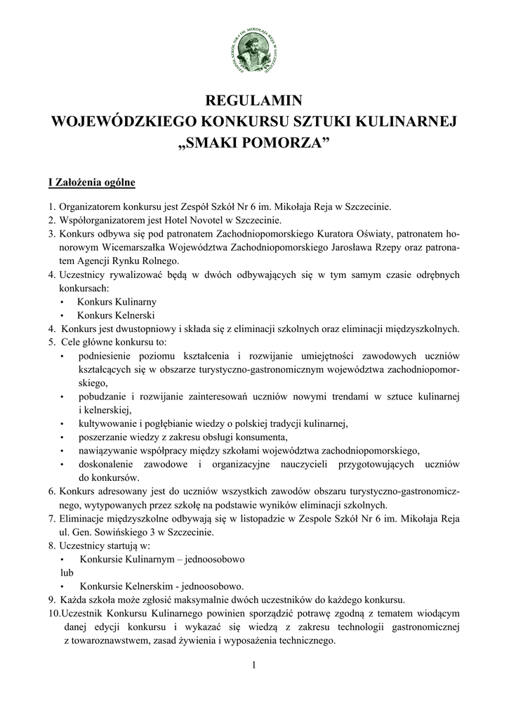 REGULAMIN WOJEWÓDZKIEGO KONKURSU SZTUKI KULINARNEJ „SMAKI POMORZA” I Założenia ogólne 1. Organizatorem konkursu jest Zespół Szkół Nr 6 im. Mikołaja Reja w Szczecinie. 2. Współorganizatorem jest Hotel Novotel w Szczecinie. 3. Konkurs odbywa się pod patronatem Zachodniopomorskiego Kuratora Oświaty, patronatem honorowym Wicemarszałka Województwa Zachodniopomorskiego Jarosława Rzepy oraz patronatem Agencji Rynku Rolnego. 4. Uczestnicy rywalizować będą w dwóch odbywających się w tym samym czasie odrębnych konkursach: • Konkurs Kulinarny • Konkurs Kelnerski 4. Konkurs jest dwustopniowy i składa się z eliminacji szkolnych oraz eliminacji międzyszkolnych. 5. Cele główne konkursu to: • podniesienie poziomu kształcenia i rozwijanie umiejętności zawodowych uczniów kształcących się w obszarze turystyczno-gastronomicznym województwa zachodniopomorskiego, • pobudzanie i rozwijanie zainteresowań uczniów nowymi trendami w sztuce kulinarnej i kelnerskiej, • kultywowanie i pogłębianie wiedzy o polskiej tradycji kulinarnej, • poszerzanie wiedzy z zakresu obsługi konsumenta, • nawiązywanie współpracy między szkołami województwa zachodniopomorskiego, • doskonalenie zawodowe i organizacyjne nauczycieli przygotowujących uczniów do konkursów. 6. Konkurs adresowany jest do uczniów wszystkich zawodów obszaru turystyczno-gastronomicznego, wytypowanych przez szkołę na podstawie wyników eliminacji szkolnych. 7. Eliminacje międzyszkolne odbywają się w listopadzie w Zespole Szkół Nr 6 im. Mikołaja Reja ul. Gen. Sowińskiego 3 w Szczecinie. 8. Uczestnicy startują w: • Konkursie Kulinarnym – jednoosobowo lub • Konkursie Kelnerskim - jednoosobowo. 9. Każda szkoła może zgłosić maksymalnie dwóch uczestników do każdego konkursu. 10.Uczestnik Konkursu Kulinarnego powinien sporządzić potrawę zgodną z tematem wiodącym danej edycji konkursu i wykazać się wiedzą z zakresu technologii gastronomicznej z towaroznawstwem, zasad żywienia i wyposażenia technicznego. 1 11. Uczestnik Konkursu Kelnerskiego powinien wykazać się wiedzą i umiejętnościami z zakresu zasad obsługi konsumenta. 12. Konkurs Kulinarny i Konkurs Kelnerski będzie oceniany przez dwa niezależne składy Jury oraz Jury oceniające część pisemną konkursu. 13. Nad prawidłowością przebiegu Konkursu Kulinarnego czuwać będzie: • Jury zawodowe w składzie: - przewodniczący - członek jury - szef kuchni szczecińskiego lokalu gastronomicznego - dwóch członków jury - nauczyciele przedmiotów zawodowych wybrany drogą losowania spośród opiekunów uczestników. 14. Nad prawidłowością przebiegu Konkursu Kelnerskiego czuwać będzie: • Jury zawodowe w składzie: - przewodniczący - członek jury - mistrz kelnerski z zakładu gastronomicznego z województwa zachodniopomorskiego - dwóch członków jury - nauczyciele przedmiotów zawodowych wybrany drogą losowania spośród opiekunów uczestników. 15. Nad prawidłowością przebiegu Etapu Pisemnego Konkursu czuwać będzie: • Jury zawodowe w składzie: - Przewodniczący- nauczyciel przedmiotów zawodowych w ZS Nr 6 - dwóch członków jury - nauczyciel przedmiotów zawodowych wybrany drogą losowania spośród opiekunów uczestników. II. Zasady organizacyjne Konkursów Konkurs jest dwustopniowy i obejmuje: • Stopień I - eliminacje szkolne Szkoły biorące udział w konkursie zobowiązane są do przeprowadzenia wewnątrzszkolnych eliminacji wg własnego regulaminu i przysłanie zgłoszenia maksymalnie czterech uczniów ( dwóch do Konkursu Kulinarnego i dwóch do Konkursu Kelnerskiego) w terminie do 31 października 2016r. na adres szkoły: Zespół Szkół Nr 6 im. Mikołaja Reja ul. Gen. J. Sowińskiego 3 70-236 Szczecin lub na adres mailowy [email protected] • Stopień II - eliminacje międzyszkolne Plan dnia 8:30 - 9:00 Zebranie organizacyjne: rejestracja uczestników, omówienie regulaminu konkursów, zasad oceniania i losowanie numerków, wybór członków jury spośród opiekunów uczestników. 9:00 - 10:00 etap pisemny - test 10:30 - 13:00 Rywalizacja w Konkursie Kulinarnym (sala 24) 10:30 - 13:00 Rywalizacja w Konkursie Kelnerskim (sala 26) 2 13:00 - 14:00 Prezentacja dań konkursowych Konkursu Kulinarnego (sala 21) 14:00 Ogłoszenie wyników konkursów (sala 21) Eliminacje międzyszkolne odbędą się w dwóch etapach: - I etap - pisemny, polegał będzie na rozwiązaniu testu pisemnego, składającego się z 40 pytań, obejmującego ogólną wiedzę zawodową, osobny dla uczestników Konkursu Kulinarnego i osobny dla uczestników Konkursu Kelnerskiego. W tym etapie można uzyskać maksymalnie 40 punktów. - II etap - praktyczny Konkurs Kulinarny 1. Warunkiem przystąpienia do zmagań konkursowych jest: • posiadanie legitymacji szkolnej potwierdzającej tożsamość uczestnika, • posiadanie aktualnej książeczki zdrowia dla celów sanitarno-epidemiologicznych, • posiadanie ubrania kucharskiego: bluzy, spodni, zapaski i czapki. 2. Uczestnicy konkursu będą sporządzać i podawać 5 porcji wybranej przez siebie potrawy (4 porcje do prezentacji, 1 porcja do oceny), podawanej w formie zakąski zimnej oraz 5 porcji deseru (4 porcje do prezentacji, 1 porcja do oceny ). Temat wiodący tegorocznego konkursu brzmi „Szlakiem zbóż i aromatów”. Uczestnicy do sporządzenia zakąski zimnej powinni wykorzystać dostępne aromatyczne zioła i przyprawy korzenne. Składnikiem deseru powinien być dowolny produkt zbożowy. 3. Jeżeli zażąda tego Jury, uczestnicy konkursu zobowiązani są do udzielenia odpowiedzi na zadane pytania, dotyczące przygotowanych potraw. 4. Czas przygotowania potraw konkursowych wynosi 150 minut. 5. Ocenie podlegać będą: • organizacja pracy i przebieg procesu technologicznego (10 - 20 pkt.), • profesjonalizm pracy (10 - 20 pkt.), • wykorzystanie różnych technik kulinarnych (10 - 20 pkt.), • smakowitość i sposób aranżacji potraw (10 - 20 pk