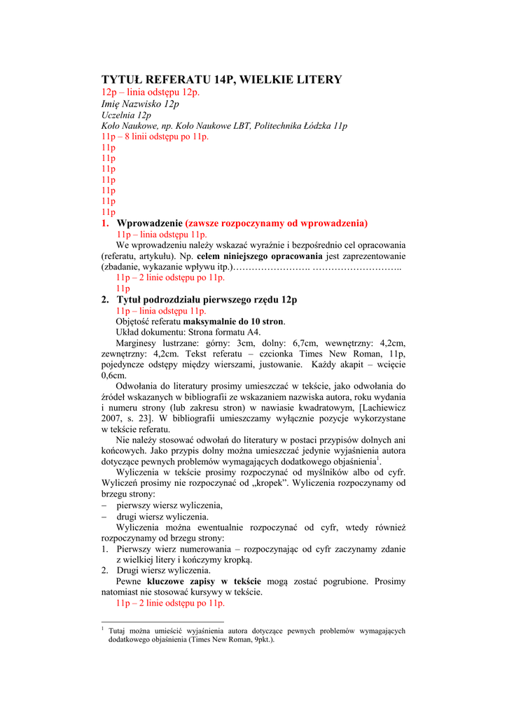 TYTUŁ REFERATU 14P, WIELKIE LITERY 12p – linia odstępu 12p. Imię Nazwisko 12p Uczelnia 12p Koło Naukowe, np. Koło Naukowe LBT, Politechnika Łódzka 11p 11p – 8 linii odstępu po 11p. 11p 11p 11p 11p 11p 11p 11p 1. Wprowadzenie (zawsze rozpoczynamy od wprowadzenia) 11p – linia odstępu 11p. We wprowadzeniu należy wskazać wyraźnie i bezpośrednio cel opracowania (referatu, artykułu). Np. celem niniejszego opracowania jest zaprezentowanie (zbadanie, wykazanie wpływu itp.)……………………. ……………………….. 11p – 2 linie odstępu po 11p. 11p 2. Tytuł podrozdziału pierwszego rzędu 12p 11p – linia odstępu 11p. Objętość referatu maksymalnie do 10 stron. Układ dokumentu: Strona formatu A4. Marginesy lustrzane: górny: 3cm, dolny: 6,7cm, wewnętrzny: 4,2cm, zewnętrzny: 4,2cm. Tekst referatu – czcionka Times New Roman, 11p, pojedyncze odstępy między wierszami, justowanie. Każdy akapit – wcięcie 0,6cm. Odwołania do literatury prosimy umieszczać w tekście, jako odwołania do źródeł wskazanych w bibliografii ze wskazaniem nazwiska autora, roku wydania i numeru strony (lub zakresu stron) w nawiasie kwadratowym, [Lachiewicz 2007, s. 23]. W bibliografii umieszczamy wyłącznie pozycje wykorzystane w tekście referatu. Nie należy stosować odwołań do literatury w postaci przypisów dolnych ani końcowych. Jako przypis dolny można umieszczać jedynie wyjaśnienia autora dotyczące pewnych problemów wymagających dodatkowego objaśnienia1. Wyliczenia w tekście prosimy rozpoczynać od myślników albo od cyfr. Wyliczeń prosimy nie rozpoczynać od „kropek”. Wyliczenia rozpoczynamy od brzegu strony: − pierwszy wiersz wyliczenia, − drugi wiersz wyliczenia. Wyliczenia można ewentualnie rozpoczynać od cyfr, wtedy również rozpoczynamy od brzegu strony: 1. Pierwszy wierz numerowania – rozpoczynając od cyfr zaczynamy zdanie z wielkiej litery i kończymy kropką. 2. Drugi wiersz wyliczenia. Pewne kluczowe zapisy w tekście mogą zostać pogrubione. Prosimy natomiast nie stosować kursywy w tekście. 11p – 2 linie odstępu po 11p. 1 Tutaj można umieścić wyjaśnienia autora dotyczące pewnych problemów wymagających dodatkowego objaśnienia (Times New Roman, 9pkt.). 11p 2.1. Tytuł drugiego rzędu 11p, pochylony 11p – linia odstępu 11p. Poniżej przedstawiono przykład umieszczenia w tekście tabeli oraz rysunku. Proszę pamiętać, aby w tekście referatu umieszczać bezpośrednio i wyraźnie zapowiedź tabeli lub rysunku, np. podział na firmy bardzo małe i małe przedstawiono w tabeli 1. 11p – linia odstępu 11p. Tabela 1. Tytuł tabeli 10p, po tytule 6p odstępu, tekst w tabeli 10p Grupa firm bardzo małe małe Zatrudnienie Symbol do 19 od 20 do 99 BM M Źródło:. Adamik A. (red.), Współpraca małych i średnich przedsiębiorstw w regionie. Budowanie konkurencyjności firm i regionu, Difin, Warszawa 2012. s. 51. (przykład monografii pod redakcją) [Adamik 2012, s. 51], 9 pkt., kursywa, wyśrodkowany, przed podpisem 6p odstępu. (kropka) 11p – linia odstępu 11p. Podpis tabeli znajduje się nad tabelą, natomiast podpis rysunku znajduje się pod rysunkiem. W obu przypadkach źródło znajduje się pod danym obiektem. Proszę pamiętać o zapowiedzi rysunku w tekście referatu, np. wyniki badań przedstawiono na rysunku 1. 11p – linia odstępu 11p. budowa nieskomplikowanych elementów sieci telekomunikacyjnej, 73% ochrona budynków i mienia przedsiębiorst wa 73% wdrażanie nowych zaawansowanych technologii telekomunikacyjnych 73% 64% obsługa z zakresu BHP całkowity nadzór nad utrzymaniem funkcjonowania zaawansowanych… 14% 0% 20% 40% 60% 80% Rys. 1. Tytuł rysunku,. 10 pkt., wyśrodkowany, przed akapitem 6p. odstępu Źródło:, 9 pkt., kursywa, wyśrodkowany. (kropka) 11p – linia odstępu 11p. Rysunki prosimy umieszczać w formatach: cdr, gif, bmp, pcx, plt, jpg, stosując układ rysunku: formatuj – układ: „równo z tekstem”. Szerokość rysunku nie powinna przekraczać 12 cm. Rysunki powinny być w skali szarości! Nie należy stosować rysunków i oznaczeń kolorowych, ponieważ książka będzie wydrukowana w skali szarości. 11p – 2 linie odstępu po 11p. 11p 3. Podsumowanie 12p (ostatni podrozdział to podsumowanie) 11p – linia odstępu 11p. W podsumowaniu wskazujemy podstawowe wnioski wynikające z rozważań teoretycznych oraz z przedstawionych wyników badań (własnych lub wtórnych). Do referatu dołączamy streszczenie w języku polskim oraz w języku angielskim, - (Sumary). 11p – 2 linie odstępu po 11p. 11p Bibliografia (uwaga! bibliografia ułożona alfabetycznie!!) 11p – linia odstępu 11p. 1. Lachiewicz S., Menedżerowie w strukturach władzy organizacji gospodarczych, PWE, Warszawa 2007. (przykład monografii autorskiej) 2. Matejun M., Metoda badania przypadków w naukach o zarządzaniu, „Ekonomika i Organizacja Przedsiębiorstwa”, nr 10/2011. (przykład artykułu w czasopiśmie) 3. Szymańska K., Kultura organizacyjna jako narzędzie kreujące innowacyjność małych firm, [w:] Lachiewicz S., Szymańska K., Walecka A. (red.), Zarządzanie zasobami ludzkimi w małych i średnich przedsiębiorstwach, Wydawnictwo PŁ, Łódź 2011. (przykład rozdziału w monografii) 4. po każdej pozycji bibliografii kropka. Bibliografia musi być ułożona alfabetycznie!! INFORMACJA ZWIĄZANA Z WYDAWNICTWEM Warunkiem umieszczenia artykułu w recenzowanej publikacji jest pozytywna recenzja kwalifikująca artykuł do druku, przeniesienie praw autorskich poprzez podpisanie stosownej umowy oraz przesłanie oświadczenia, zamieszczonego na stronie internetowej Uczelni, dotyczącego akceptacji artykułu przez opiekuna naukowego. W przypadku braku zgody na przeniesienie praw autorskich, artykuł nie zostanie zamieszczony w publikacji. Do uwag zawartych w recenzji Autor powinien ustosunkować się na piśmie. W przypadku negatywnej oceny recenzenta i braku możliwości poprawienia treści arty