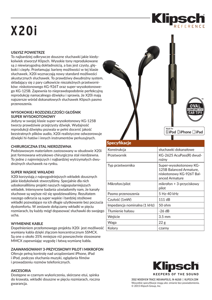 X20i USŁYSZ POWIETRZE To najbardziej odkrywcze douszne słuchawki jakie kiedykolwiek stworzył Klipsch. Wysokie tony reprodukowane są z niewiarygodną dokładnością, a bas jest czysty, głęboki i ciepły. Przełamując barierę możliwości w tej klasie słuchawek, X20i wyznaczają nowy standard możliwości akustycznych słuchawek. To prawdziwy dwudrożny system, składający się z pary całkowicie niezależnych przetworników: niskotonowego KG-926T oraz super-wysokotonowego KG-125B. Zapewnia to nieprawdopodobnie perfekcyjną reprodukcję namacalnego dźwięku i sprawia, że X20i mają najszersze wśród dokanałowych słuchawek Klipsch pasmo przenoszenia. WYSOKOKIEJ ROZDZIELCZOŚCI GŁOŚNIK SUPER WYSOKOTONOWY Jedyny w swojej klasie super-wysokotonowy KG-125B tworzy prawdziwie przejrzysty dźwięk. Wydajność reprodukcji dźwięku pozwala w pełni docenić jakość bezstratnych plików audio, X20i realistyczne odwzorowuje dźwięki hi-hatów i innych instrumentów perkusyjnych. CHIRURGICZNA STAL NIERDZEWNA Podstawowym materiałem zastosowany w obudowie X20i jest formowana wtryskowo chirurgiczna stal nierdzewna. To jedne z najmniejszych i najbardziej wytrzymałych dwudrożnych słuchawek na rynku. SUPER WĄSKIE WKŁADKI X20i korzystają z najwygodniejszych wkładek dousznych jakie kiedykolwiek stworzyliśmy. Specjalnie dla nich udoskonaliliśmy projekt naszych najpopularniejszych wkładek. Intensywne badania uświadomiły nam, że kanały słuchowe są węższe niż się spodziewaliśmy. Rezultatem naszego odkrycia są super wąskie i bardziej stożkowe wkładki pozwalające na ich długie użytkowanie bez poczucia dyskomfortu. W zestawie dołączamy wkładki w pięciu rozmiarach, by każdy mógł dopasować słuchawki do swojego ucha. WYMIENNE KABLE Dopełnieniem przełomowego projektu X20i jest możliwość wymiany kabla dzięki złączom koncentrycznym SSMCX. Są one o około 35% mniejsze niż powszechnie stosowane MMCX zapewniając wygodę i łatwą wymianę kabla. Specyfikacje Konstrukcja słuchawki dokanałowe Przetwornik KG-2625 AcuPass(R) dwudrożny Typ przetwornika Super-wysokotonowy KG125B Balanced Armature, niskotonowy KG-926T Balanced Armature Mikrofon/pilot mikrofon + 3-przyciskowy pilot Pasmo przenoszenia 5 Hz-40 kHz Czułość (1mW) 111 dB Impedancja nominalna (1 kHz) 50 ohm Tłumienie hałasu -26 dB Wejście 3.5 mm Waga 22 g Kolory czarny ZAAWANSOWANY 3-PRZYCISKOWY PILOT I MIKROFON Oferuje pełną kontrolę nad urządzeniami iPhone, iPad i iPod, podczas słuchania muzyki, oglądania filmów i prowadzeniu rozmów telefonicznych. AKCESORIA Dostępne w czarnym wykończeniu, skórzane etui, spinka do krawata, wkładki douszne w pięciu rozmiarach, roczna gwarancja. Wszystkie specyfikacje mogą ulec zmianie bez powiadomienia. © 2015 Klipsch Group, Inc.