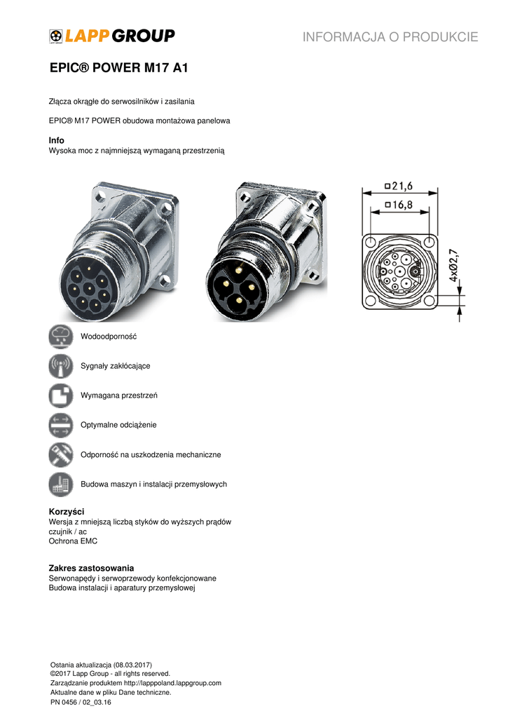 INFORMACJA O PRODUKCIE EPIC® POWER M17 A1 Złącza okrągłe do serwosilników i zasilania EPIC® M17 POWER obudowa montażowa panelowa Info Wysoka moc z najmniejszą wymaganą przestrzenią Wodoodporność Sygnały zakłócające Wymagana przestrzeń Optymalne odciążenie Odporność na uszkodzenia mechaniczne Budowa maszyn i instalacji przemysłowych Korzyści Wersja z mniejszą liczbą styków do wyższych prądów czujnik / ac Ochrona EMC Zakres zastosowania Serwonapędy i serwoprzewody konfekcjonowane Budowa instalacji i aparatury przemysłowej Ostania aktualizacja (08.03.2017) ©2017 Lapp Group - all rights reserved. Zarządzanie produktem http://lapppoland.lappgroup.com Aktualne dane w pliku Dane techniczne. PN 0456 / 02_03.16 INFORMACJA O PRODUKCIE EPIC® POWER M17 A1 Dane techniczne Klasyfikacja: ETIM 5.0 Class-ID: EC002635 Opis klasy ETIM 5.0: Złącze okrągłe (złącza przemysłowe) Napięcie pracy: 630 V: styki 2 mm i 1 mm 60 V: styki 0,6 mm Napięcie impulsowe: 6 kV: styki 2 mm i 1 mm 1,5 kV: styki 0,6 mm Prąd roboczy: 3+PE: 20 A, 5+PE/6+PE/7+PE:14 A, 3+PE+5:14 A/3,6 A Stopień zanieczyszczenia: 3 Styki: Mosiądz złocony Liczba styków: 3+PE, 5+PE, 6+PE, 7+PE, 3+PE+5 Styki: 3+PE (2 mm), 5+PE (1 mm), 6+PE (1 mm), 7+PE (1 mm), 3+PE+5 (1 mm/0,6 mm) Podłączanie żyły: Zacisk: 3+PE: 0,5 - 2,5 mm², 5 + PE/6 + PE/7 + PE: 0,06 - 1 mm², 3 + P + 5: 0,06 - 1/0,06 - 0,5 mm² Materiał: Obudowa: odlew cynkowy niklowany, mosiądz niklowany Wkład: PA Uszczelnienie: FPM Stopień ochrony: IP 67 Liczba operacji załącz/rozłącz: 100 Zakres temperatury: Od -40°C do +125°C Wskazówka Fotografie nie mogą być używane do wymiarowania oraz nie stanowią szczegółowego odwzorowania przedstawionych produktów. * Podane ceny to ceny netto bez podatku VAT i dodatkowych opłat. Sprzedaż klientom biznesowym. Ostania aktualizacja (08.03.2017) ©2017 Lapp Group - all rights reserved. Zarządzanie produktem http://lapppoland.lappgroup.com Aktualne dane w pliku Dane techniczne. PN 0456 / 02_03.16 Powered by TCPDF (www.tcpdf.org) Opis produktu Typ mocowania Konfiguracja styków Złącze pulpitowe M17 typ A1 montaż od przodu obudowy na 4 śruby 44423075 EPIC®M17, żeński Ø 2,7mm (4x) 3+PE (styki 2 mm) 44423070 EPIC®M17, męski Ø 2,7mm (4x) 3+PE (styki 2 mm) 44423076 EPIC®M17, żeński Ø 2,7mm (4x) 5+PE (styki 1 mm) 44423071 EPIC®M17, męski Ø 2,7mm (4x) 5+PE (styki 1 mm) 44423077 EPIC®M17, żeński Ø 2,7mm (4x) 6+PE (styki 1 mm) 44423072 EPIC®M17, męski Ø 2,7mm (4x) 6+PE (styki 1 mm) 44423078 EPIC®M17, żeński Ø 2,7mm (4x) 7+PE (styki 1 mm) 44423073 EPIC®M17, męski Ø 2,7mm (4x) 7+PE (styki 1 mm) 44423079 EPIC®M17, żeński Ø 2,7mm (4x) 3+PE+5 (styki 1 mm/0,6 mm) 44423074 EPIC®M17, męski Ø 2,7mm (4x) 3+PE+5 (styki 1 mm/0,6 mm) EPIC® POWER M17 A1 Ostania aktualizacja (08.03.2017) ©2017 Lapp Group - all rights reserved. Zarządzanie produktem http://lapppoland.lappgroup.com Aktualne dane w pliku Dane techniczne. PN 0456 / 02_03.16 Numer katalogowy INFORMACJA O PRODUKCIE Powered by TCPDF (www.tcpdf.org) INFORMACJA O PRODUKCIE EPIC® POWER M17 A1 Ostania aktualizacja (08.03.2017) ©2017 Lapp Group - all rights reserved. Zarządzanie produktem http://lapppoland.lappgroup.com Aktualne dane w pliku Dane techniczne. PN 0456 / 02_03.16