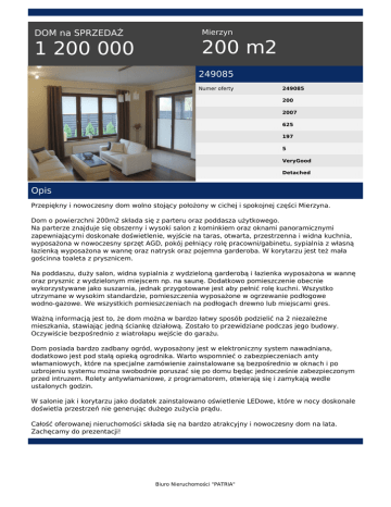 DOM na SPRZEDAŻ 1 200 000 Mierzyn 200 m2 249085 Numer oferty 249085 200 2007 625 197 5 VeryGood Detached Opis Przepiękny i nowoczesny dom wolno stojący położony w cichej i spokojnej części Mierzyna. Dom o powierzchni 200m2 składa się z parteru oraz poddasza użytkowego. Na parterze znajduje się obszerny i wysoki salon z kominkiem oraz oknami panoramicznymi zapewniającymi doskonałe doświetlenie, wyjście na taras, otwarta, przestrzenna i widna kuchnia, wyposażona w nowoczesny sprzęt AGD, pokój pełniący rolę pracowni/gabinetu, sypialnia z własną łazienką wyposażona w wannę oraz natrysk oraz pojemna garderoba. W korytarzu jest też mała gościnna toaleta z prysznicem. Na poddaszu, duży salon, widna sypialnia z wydzieloną garderobą i łazienka wyposażona w wannę oraz prysznic z wydzielonym miejscem np. na saunę. Dodatkowo pomieszczenie obecnie wykorzystywane jako suszarnia, jednak przygotowane jest aby pełnić rolę kuchni. Wszystko utrzymane w wysokim standardzie, pomieszczenia wyposażone w ogrzewanie podłogowe wodno-gazowe. We wszystkich pomieszczeniach na podłogach drewno lub miejscami gres. Ważną informacją jest to, że dom można w bardzo łatwy sposób podzielić na 2 niezależne mieszkania, stawiając jedną ściankę działową. Zostało to przewidziane podczas jego budowy. Oczywiście bezpośrednio z wiatrołapu wejście do garażu. Dom posiada bardzo zadbany ogród, wyposażony jest w elektroniczny system nawadniana, dodatkowo jest pod stałą opieką ogrodnika. Warto wspomnieć o zabezpieczeniach anty włamaniowych, które na specjalne zamówienie zainstalowane są bezpośrednio w oknach i po uzbrojeniu systemu można swobodnie poruszać się po domu będąc jednocześnie zabezpieczonym przed intruzem. Rolety antywłamaniowe, z programatorem, otwierają się i zamykają wedle ustalonych godzin. W salonie jak i korytarzu jako dodatek zainstalowano oświetlenie LEDowe, które w nocy doskonale doświetla przestrzeń nie generując dużego zużycia prądu. Całość oferowanej nieruchomości składa się na bardzo atrakcyjny i nowoczesny dom na lata. Zachęcamy do prezentacji! Biuro Nieruchomości "PATRIA" Biuro Nieruchomości "PATRIA" tel. 91 4886426, 91 4886427, 507 124 122 email: [email protected] Biuro Nieruchomości "PATRIA" Powered by TCPDF (www.tcpdf.org)