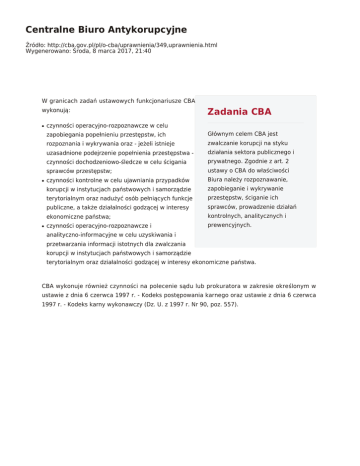 Centralne Biuro Antykorupcyjne Źródło: http://cba.gov.pl/pl/o-cba/uprawnienia/349,uprawnienia.html Wygenerowano: Środa, 8 marca 2017, 21:40 W granicach zadań ustawowych funkcjonariusze CBA wykonują: ● ● ● Zadania CBA czynności operacyjno-rozpoznawcze w celu zapobiegania popełnieniu przestępstw, ich Głównym celem CBA jest rozpoznania i wykrywania oraz - jeżeli istnieje zwalczanie korupcji na styku uzasadnione podejrzenie popełnienia przestępstwa - działania sektora publicznego i czynności dochodzeniowo-śledcze w celu ścigania prywatnego. Zgodnie z art. 2 sprawców przestępstw; ustawy o CBA do właściwości czynności kontrolne w celu ujawniania przypadków Biura należy rozpoznawanie, korupcji w instytucjach państwowych i samorządzie zapobieganie i wykrywanie terytorialnym oraz nadużyć osób pełniących funkcje przestępstw, ściganie ich publiczne, a także działalności godzącej w interesy sprawców, prowadzenie działań ekonomiczne państwa; kontrolnych, analitycznych i czynności operacyjno-rozpoznawcze i prewencyjnych. analityczno-informacyjne w celu uzyskiwania i przetwarzania informacji istotnych dla zwalczania korupcji w instytucjach państwowych i samorządzie terytorialnym oraz działalności godzącej w interesy ekonomiczne państwa. CBA wykonuje również czynności na polecenie sądu lub prokuratora w zakresie określonym w ustawie z dnia 6 czerwca 1997 r. - Kodeks postępowania karnego oraz ustawie z dnia 6 czerwca 1997 r. - Kodeks karny wykonawczy (Dz. U. z 1997 r. Nr 90, poz. 557).