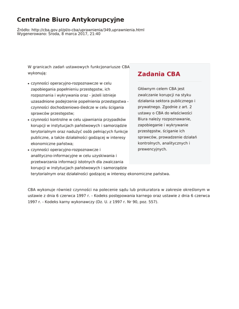 Centralne Biuro Antykorupcyjne Zadania CBA