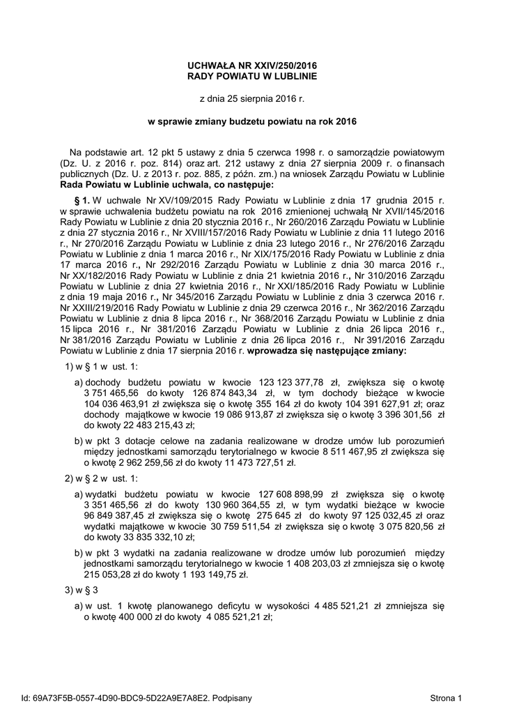 UCHWAŁA NR XXIV/250/2016 RADY POWIATU W LUBLINIE z dnia 25 sierpnia 2016 r. w sprawie zmiany budzetu powiatu na rok 2016 Na podstawie art. 12 pkt 5 ustawy z dnia 5 czerwca 1998 r. o samorządzie powiatowym (Dz. U. z 2016 r. poz. 814) oraz art. 212 ustawy z dnia 27 sierpnia 2009 r. o finansach publicznych (Dz. U. z 2013 r. poz. 885, z późn. zm.) na wniosek Zarządu Powiatu w Lublinie Rada Powiatu w Lublinie uchwala, co następuje: § 1. W uchwale Nr XV/109/2015 Rady Powiatu w Lublinie z dnia 17 grudnia 2015 r. w sprawie uchwalenia budżetu powiatu na rok 2016 zmienionej uchwałą Nr XVII/145/2016 Rady Powiatu w Lublinie z dnia 20 stycznia 2016 r., Nr 260/2016 Zarządu Powiatu w Lublinie z dnia 27 stycznia 2016 r., Nr XVIII/157/2016 Rady Powiatu w Lublinie z dnia 11 lutego 2016 r., Nr 270/2016 Zarządu Powiatu w Lublinie z dnia 23 lutego 2016 r., Nr 276/2016 Zarządu Powiatu w Lublinie z dnia 1 marca 2016 r., Nr XIX/175/2016 Rady Powiatu w Lublinie z dnia 17 marca 2016 r., Nr 292/2016 Zarządu Powiatu w Lublinie z dnia 30 marca 2016 r., Nr XX/182/2016 Rady Powiatu w Lublinie z dnia 21 kwietnia 2016 r., Nr 310/2016 Zarządu Powiatu w Lublinie z dnia 27 kwietnia 2016 r., Nr XXI/185/2016 Rady Powiatu w Lublinie z dnia 19 maja 2016 r., Nr 345/2016 Zarządu Powiatu w Lublinie z dnia 3 czerwca 2016 r. Nr XXIII/219/2016 Rady Powiatu w Lublinie z dnia 29 czerwca 2016 r., Nr 362/2016 Zarządu Powiatu w Lublinie z dnia 8 lipca 2016 r., Nr 368/2016 Zarządu Powiatu w Lublinie z dnia 15 lipca 2016 r., Nr 381/2016 Zarządu Powiatu w Lublinie z dnia 26 lipca 2016 r., Nr 381/2016 Zarządu Powiatu w Lublinie z dnia 26 lipca 2016 r., Nr 391/2016 Zarządu Powiatu w Lublinie z dnia 17 sierpnia 2016 r. wprowadza się następujące zmiany: 1) w § 1 w ust. 1: a) dochody budżetu powiatu w kwocie 123 123 377,78 zł, zwiększa się o kwotę 3 751 465,56 do kwoty 126 874 843,34 zł, w tym dochody bieżące w kwocie 104 036 463,91 zł zwiększa się o kwotę 355 164 zł do kwoty 104 391 627,91 zł; oraz dochody majątkowe w kwocie 19 086 913,87 zł zwiększa się o kwotę 3 396 301,56 zł do kwoty 22 483 215,43 zł; b) w pkt 3 dotacje celowe na zadania realizowane w drodze umów lub porozumień między jednostkami samorządu terytorialnego w kwocie 8 511 467,95 zł zwiększa się o kwotę 2 962 259,56 zł do kwoty 11 473 727,51 zł. 2) w § 2 w ust. 1: a) wydatki budżetu powiatu w kwocie 127 608 898,99 zł zwiększa się o kwotę 3 351 465,56 zł do kwoty 130 960 364,55 zł, w tym wydatki bieżące w kwocie 96 849 387,45 zł zwiększa się o kwotę 275 645 zł do kwoty 97 125 032,45 zł oraz wydatki majątkowe w kwocie 30 759 511,54 zł zwiększa się o kwotę 3 075 820,56 zł do kwoty 33 835 332,10 zł; b) w pkt 3 wydatki na zadania realizowane w drodze umów lub porozumień między jednostkami samorządu terytorialnego w kwocie 1 408 203,03 zł zmniejsza się o kwotę 215 053,28 zł do kwoty 1 193 149,75 zł. 3) w § 3 a) w ust. 1 kwotę planowanego deficytu w wysokości 4 485 521,21 zł zmniejsza się o kwotę 400 000 zł do kwoty 4 085 521,21 zł; Id: 69A73F5B-0557-4D90-BDC9-5D22A9E7A8E2. Podpisany Strona 1 b) w ust. 2 źródła pokrycia deficytu, którymi są przychody pochodzące z kredytów i pożyczek w kwocie 4 485 521,21 zł zmniejsza się o kwotę 400 000 zł do kwoty 4 085 521,21 zł; 4) w § 4 w ust. 1 łączną kwotę planowanych przychodów budżetu w kwocie 8 794 283,40 zł zmniejsza się o kwotę 400 000 zł do kwoty 8 394 283,40 zł. 5) w § 5: a) w pkt 1 rezerwę ogólną w kwocie 96 245 zł zwiększa się o kwotę 11 439 zł do kwoty 107 684 zł; b) w pkt 2: - rezerwę celową w łącznej kwocie 1 672 694,75 zł zmniejsza się o kwotę 1 022 792,29 zł do kwoty 649 902,46 zł, - w lit. a kwotę 432 200,10 zł zmniejsza się o kwotę 231 881 zł do kwoty 200 319,10 zł, - w lit. b kwotę 80 395,55 zł zmniejsza się o kwotę 55 000 zł do kwoty 25 395,55 zł, - w lit. e kwotę 890 099,10 zł zmniejsza się o kwotę 735 911,29 zł do kwoty 154 187,81 zł. 6) w załącznikach Nr 1, 2, 3, 4, 5, 5a, 6 do uchwały budżetowej dokonuje się zmian zgodnie z załącznikami do niniejszej uchwały. § 2. Wykonanie uchwały powierza się Zarządowi Powiatu w Lublinie. § 3. Uchwała wchodzi w życie z dniem podjęcia. Przewodniczący Rady Powiatu w Lublinie Antoni Skrabucha Id: 69A73F5B-0557-4D90-BDC9-5D22A9E7A8E2. Podpisany Strona 2 Załącznik Nr 1 Zmiany w planie dochodów budzetu na rok 2016 Rodzaj zadania: Poroz. z AR Dział Rozdział § Nazwa 1 2 3 4 Plan przed zmianą Zmniejszenie Zwiększenie Plan po zmianach (5+6+7) 5 6 7 8 bieżące bieżące razem: 4 000,00 0,00 0,00 4 000,00 0,00 0,00 0,00 0,00 w tym z tytułu dotacji i środków na finansowanie wydatków na realizację zadań finansowanych z udziałem środków, o których mowa w art. 5 ust. 1 pkt 2 i 3 Rodzaj zadania: Poroz. z JST Dział Rozdział § Nazwa 1 2 3 4 Plan przed zmianą Zmniejszenie Zwiększenie Plan po zmianach (5+6+7) 5 6 7 8 bieżące Administracja publiczna 750 w tym z tytułu dotacji i środków na finansowanie wydatków na realizację zadań finansowanych z udziałem środków, o których mowa w art. 5 ust. 1 pkt 2 i 3 Starostwa powiatowe 75020 2710 w tym z tytułu dotacji i środków na finansowanie wydatków na realizację zadań finansowanych z udziałem środków, o których mowa w art. 5 ust. 1 pkt 2 i 3 Dotacja celowa otrzymana z tytułu pomocy finansowej udzielanej między jednostkami samorządu terytorialnego na dofinansowanie własnych zadań bieżących bieżące razem: w tym z tytułu dotacji i środków na finansowanie wydatków na realizację zadań finansowanych z udziałem środków, o których mowa w art. 5 ust. 1 pkt 2 i 3 43 500,00 0,00 34 104,00 77 604,00 0,00 0,00 0,00 0,00 0,00 0,00 34 104,00 34 104,00 0,00 0,00 0,00 0,00 0,00 0,00 34 104,00 34 104,00 52 387,00 0,00 34 104,00 86 491,00 0,00 0,00 0,00 0,00 8 184 080,95 0,00 2 898 155,56 11 082 236,51 majątkowe 600 Transport i łączność Id: 69A73F