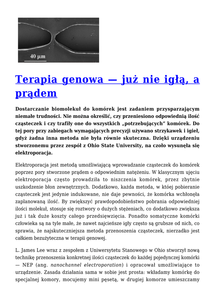 Terapia genowa — już nie igłą, a prądem Dostarczanie biomolekuł do komórek jest zadaniem przysparzającym niemałe trudności. Nie można określić, czy przeniesiono odpowiednią ilość cząsteczek i czy trafiły one do wszystkich „potrzebujących” komórek. Do tej pory przy zabiegach wymagających precyzji używano strzykawek i igieł, gdyż żadna inna metoda nie była równie skuteczna. Dzięki urządzeniu stworzonemu przez zespół z Ohio State University, na czoło wysunęła się elektroporacja. Elektroporacja jest metodą umożliwiającą wprowadzanie cząsteczek do komórek poprzez pory stworzone prądem o odpowiednim natężeniu. W klasycznym ujęciu elektroporacja często prowadziła to niszczenia komórek, przez zbytnie uszkodzenie błon zewnętrznych. Dodatkowo, każda metoda, w któej pobieranie cząsteczek jest jedynie indukowane, nie daje pewności, że komórka wchłonęła zaplanowaną ilość. By zwiększyć prawdopodobieństwo pobrania odpowiedniej ilości molekuł, stosuje się roztwory o dużych stężeniach, co dodatkowo zwiększa już i tak duże koszty całego przedsięwzięcia. Ponadto somatyczne komórki człowieka są na tyle małe, że nawet najcieńsze igły często są grubsze od nich, co sprawia, że najskuteczniejsza metoda przenoszenia cząsteczek, nierzadko jest całkiem bezużyteczna w terapii genowej. L. James Lee wraz z zespołem z Uniwersytetu Stanowego w Ohio stworzył nową technikę przenoszenia konkretnej ilości cząsteczek do każdej pojedynczej komórki — NEP (ang. nanochannel electroporation) i opracował umożliwiające to urządzenie. Zasada działania sama w sobie jest prosta: wkładamy komórkę do specjalnej komory, mocujemy mini pęsetą, w drugiej komorze umieszczamy żądaną ilość biomolekuł, wytwarzamy prąd rzędu kilkuset voltów tworzący dziury w błonie komórkowej i poprzez kanał łączący obie komory cząsteczki wędrują wprost do komórki. Zważywszy na skalę całego procesu, staje się on nieco problematyczny. Podczas testów naukowcy musieli zmagać się z kilkoma problemami. Jak duże napięcie i na jak długo należy przyłożyć do komórki, tak by powstały otwory w błonie, dostatecznie duże dla przenoszonych cząsteczek, ale jednocześnie odpowiednio małe, aby nie doprowadzić do trwałego uszkodzenia komórki? Czy na pewno wszystkie planowane cząsteczki zostały wchłonięte przez komórkę? Jak dużo komórek może być jednocześnie modyfikowanych? Jak do tej pory udało się określić najskuteczniejsze natężenie prądu i optymalny czas oddziaływania. Dzięki znacznikom fluorescencyjnym potwierdzono również, że wszystkie cząsteczki są przekazywane z komory do komórki. Jedynym mankamentem nowej technologii zespołu Lee jest ilość. W jednym cyklu możliwe jest oddziaływanie na kilku pojedyńczych komórkach, tym niemniej prace wciąż trwają, a plan jest niezwykle ambitny — modyfikacja 100 tysięcy komórek w jednym cyklu. Marta Danch Źródło: researchnews.osu.edu Dostarczanie biomolekuł do komórek jest zadaniem przysparzającym niemałe trudności Data publikacji: 15.01.2012r.