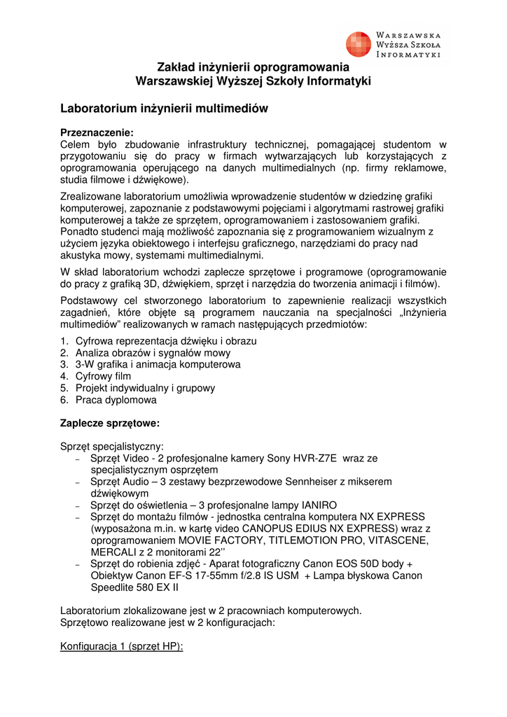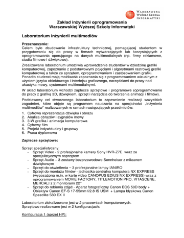 Zakład inżynierii oprogramowania Warszawskiej Wyższej Szkoły Informatyki Laboratorium inżynierii multimediów Przeznaczenie: Celem było zbudowanie infrastruktury technicznej, pomagającej studentom w przygotowaniu się do pracy w firmach wytwarzających lub korzystających z oprogramowania operującego na danych multimedialnych (np. firmy reklamowe, studia filmowe i dźwiękowe). Zrealizowane laboratorium umożliwia wprowadzenie studentów w dziedzinę grafiki komputerowej, zapoznanie z podstawowymi pojęciami i algorytmami rastrowej grafiki komputerowej a także ze sprzętem, oprogramowaniem i zastosowaniem grafiki. Ponadto studenci mają możliwość zapoznania się z programowaniem wizualnym z użyciem języka obiektowego i interfejsu graficznego, narzędziami do pracy nad akustyka mowy, systemami multimedialnymi. W skład laboratorium wchodzi zaplecze sprzętowe i programowe (oprogramowanie do pracy z grafiką 3D, dźwiękiem, sprzęt i narzędzia do tworzenia animacji i filmów). Podstawowy cel stworzonego laboratorium to zapewnienie realizacji wszystkich zagadnień, które objęte są programem nauczania na specjalności „Inżynieria multimediów” realizowanych w ramach następujących przedmiotów: 1. 2. 3. 4. 5. 6. Cyfrowa reprezentacja dźwięku i obrazu Analiza obrazów i sygnałów mowy 3-W grafika i animacja komputerowa Cyfrowy film Projekt indywidualny i grupowy Praca dyplomowa Zaplecze sprzętowe: Sprzęt specjalistyczny: – Sprzęt Video - 2 profesjonalne kamery Sony HVR-Z7E wraz ze specjalistycznym osprzętem – Sprzęt Audio – 3 zestawy bezprzewodowe Sennheiser z mikserem dźwiękowym – Sprzęt do oświetlenia – 3 profesjonalne lampy IANIRO – Sprzęt do montażu filmów - jednostka centralna komputera NX EXPRESS (wyposażona m.in. w kartę video CANOPUS EDIUS NX EXPRESS) wraz z oprogramowaniem MOVIE FACTORY, TITLEMOTION PRO, VITASCENE, MERCALI z 2 monitorami 22’’ – Sprzęt do robienia zdjęć - Aparat fotograficzny Canon EOS 50D body + Obiektyw Canon EF-S 17-55mm f/2.8 IS USM + Lampa błyskowa Canon Speedlite 580 EX II Laboratorium zlokalizowane jest w 2 pracowniach komputerowych. Sprzętowo realizowane jest w 2 konfiguracjach: Konfiguracja 1 (sprzęt HP): – – – – – Komputer PC Procesor Intel Core 2 Quad Q9400 Pamięć RAM 2 * 2GB Dysk twardy 500 GB Płyta główna zawierająca 4 sloty DDR2 800MHz, zawierająca kartę graficzną, kartę muzyczną i kartę sieciową – Monitor LCD 19" – Ilość – 24 stanowiska Konfiguracja 2 (sprzęt Lenovo): – Komputer PC – Procesor Intel Core 2 Duo E4600 – Pamięć RAM 3 GB – Dysk twardy 500 GB – Płyta główna zawierająca 4 sloty DDR2 800MHz, zawierająca kartę graficzną, kartę muzyczną i kartę sieciową – Monitor 19” – Ilość – 24 stanowiska Zaplecze programowe: Oprogramowanie, które zabezpiecza zajęcia dydaktyczne jest następujące: • Windows Server 2003 • Windows XP • Windows 2000 • Ghost 2003 • MS Office XP • Aplikacje MSDN AA – Microsoft .NET – MS Visio – MS Project – MS Access • Cinema 4D • Pinnacle Studio • Visual Studio 2005 (SilverLight SDK) • AVG 7.0 • Scilab Wykaz wybranych realizowanych zagadnień: – Akwizycja dźwięku i obrazu. Procesy próbkowania, kwantyzacji, kodowania: • modulacja: PCM, DPCM, DELTA, • kodowanie: LPC dźwięku, obrazu. – Transformacje sygnałów: DFT, DCT, Haara, Hadamarda, falkowa: • zastosowanie do dźwięku (mowy), • zastosowanie do obrazu. – Kompresja bezstratna i stratna. Metody: kodowanie długości serii, Huffmana, arytmetyczna, słownikowe, metody transformacyjne. Perceptualna charakterystyka wzroku i słuchu: • kompresja dźwięku, • kompresja obrazów, sekwencji obrazów. – Przegląd formatów plików audio oraz wideo: WAV, ATRAC, AC-3, MPEG Audio – MP3, AAC, BMP, GIF, TIFF, JPEG, MPEG Wideo. Synteza mowy na przykładzie standardów syntezy LPC10 i CELP. Elementarne transformacje obrazów: • transformacje skali szarości, • progowanie, • zmiana liczby poziomów kwantyzacji, • wyrównywanie histogramu. Zastosowanie transformat DFT, DCT do analizy obrazu. Zmiana rozdzielczości obrazu. Filtracja obrazów filtrami FIR, pojęcie odpowiedzi impulsowej, splotu dyskretnego: • wygładzanie, • wyostrzanie, • detekcja krawędzi. Segmentacja obrazów, wykrywanie obiektów na obrazie: • opis obiektów – współczynniki kształtu, momenty geometryczne, • segmentacja obrazu z wykorzystaniem transformaty Hougha. Klasyfikacja (rozpoznawanie) obrazów z wykorzystaniem sztucznych sieci neuronowych: • wielowarstwowa sieć neuronowa typu BP, • sformułowanie zadania klasyfikacji, • trening sieci, • rozpoznawanie. Analiza fourierowska sygnału mowy. Parametryczny opis sygnału mowy: • współczynniki LPC, • współczynniki banku filtrów, • współczynniki mel-cepstralne, • momenty geometryczne. Kwantyzacja wektorowa. Modelowanie sygnału mowy z wykorzystaniem niejawnych modeli Markowa – HMM. Rozpoznawanie mowy (słów izolowanych) z wykorzystaniem HMM, rozpoznawanie mówcy z wykorzystaniem sieci neuronowych. • • – – – – – – – – – – – –