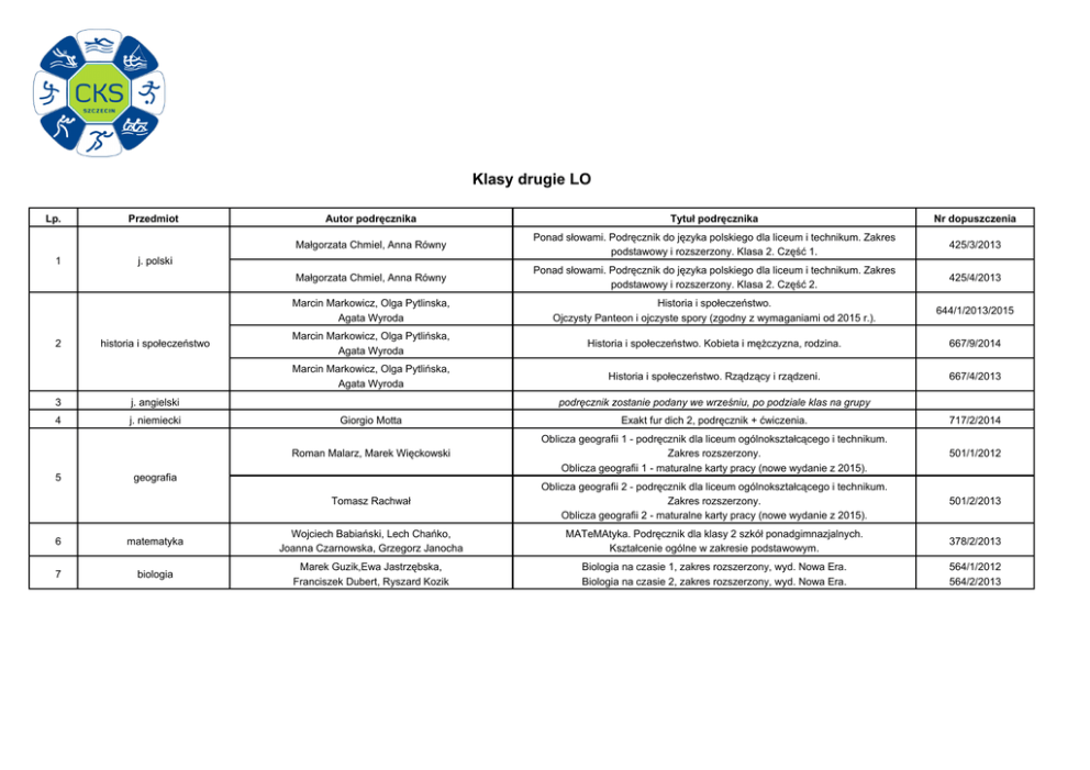 Klasy drugie LO Lp. 1 2 Przedmiot Tytuł podręcznika Nr dopuszczenia Małgorzata Chmiel, Anna Równy Ponad słowami. Podręcznik do języka polskiego dla liceum i technikum. Zakres podstawowy i rozszerzony. Klasa 2. Część 1. 425/3/2013 Małgorzata Chmiel, Anna Równy Ponad słowami. Podręcznik do języka polskiego dla liceum i technikum. Zakres podstawowy i rozszerzony. Klasa 2. Część 2. 425/4/2013 Marcin Markowicz, Olga Pytlinska, Agata Wyroda Historia i społeczeństwo. Ojczysty Panteon i ojczyste spory (zgodny z wymaganiami od 2015 r.). 644/1/2013/2015 Marcin Markowicz, Olga Pytlińska, Agata Wyroda Historia i społeczeństwo. Kobieta i mężczyzna, rodzina. 667/9/2014 Marcin Markowicz, Olga Pytlińska, Agata Wyroda Historia i społeczeństwo. Rządzący i rządzeni. 667/4/2013 j. polski historia i społeczeństwo 3 j. angielski 4 j. niemiecki 5 Autor podręcznika podręcznik zostanie podany we wrześniu, po podziale klas na grupy Giorgio Motta Exakt fur dich 2, podręcznik + ćwiczenia. 717/2/2014 Roman Malarz, Marek Więckowski Oblicza geografii 1 - podręcznik dla liceum ogólnokształcącego i technikum. Zakres rozszerzony. Oblicza geografii 1 - maturalne karty pracy (nowe wydanie z 2015). 501/1/2012 Tomasz Rachwał Oblicza geografii 2 - podręcznik dla liceum ogólnokształcącego i technikum. Zakres rozszerzony. Oblicza geografii 2 - maturalne karty pracy (nowe wydanie z 2015). 501/2/2013 geografia 6 matematyka Wojciech Babiański, Lech Chańko, Joanna Czarnowska, Grzegorz Janocha MATeMAtyka. Podręcznik dla klasy 2 szkół ponadgimnazjalnych. Kształcenie ogólne w zakresie podstawowym. 378/2/2013 7 biologia Marek Guzik,Ewa Jastrzębska, Franciszek Dubert, Ryszard Kozik Biologia na czasie 1, zakres rozszerzony, wyd. Nowa Era. Biologia na czasie 2, zakres rozszerzony, wyd. Nowa Era. 564/1/2012 564/2/2013