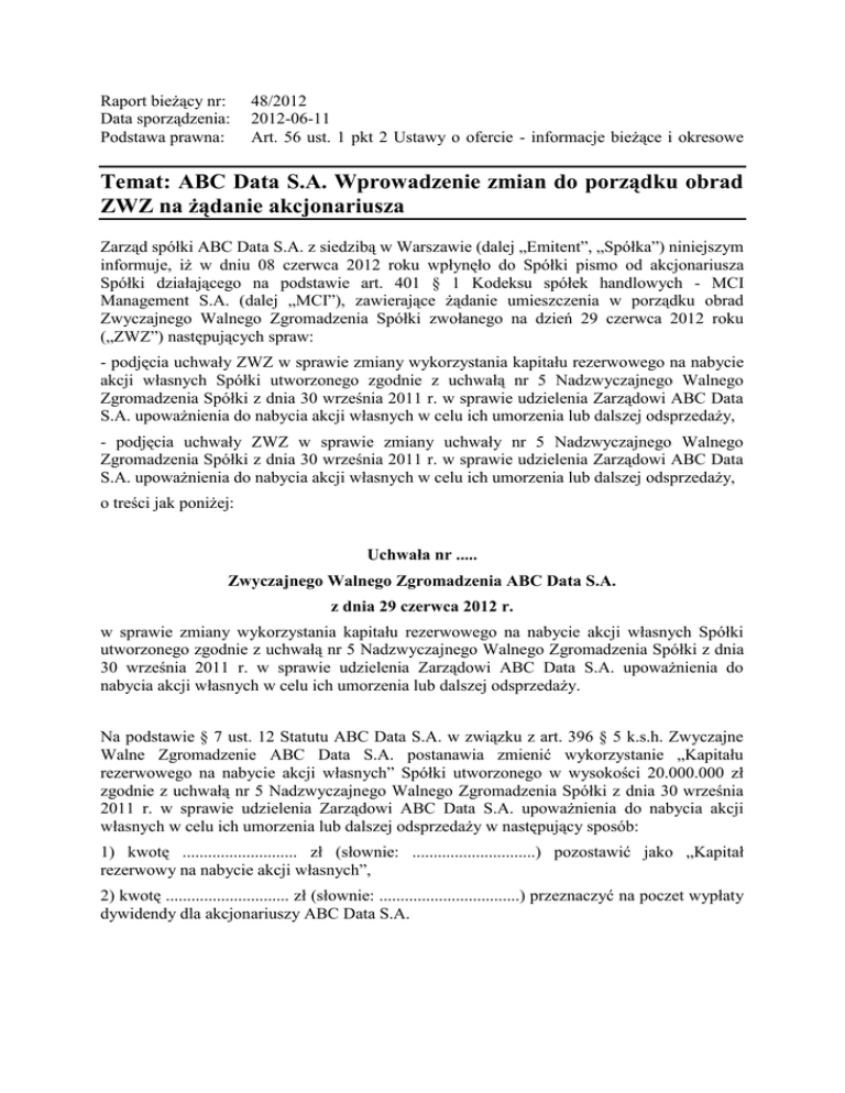 Raport bieżący nr: Data sporządzenia: Podstawa prawna: 48/2012 2012-06-11 Art. 56 ust. 1 pkt 2 Ustawy o ofercie - informacje bieżące i okresowe Temat: ABC Data S.A. Wprowadzenie zmian do porządku obrad ZWZ na żądanie akcjonariusza Zarząd spółki ABC Data S.A. z siedzibą w Warszawie (dalej „Emitent”, „Spółka”) niniejszym informuje, iż w dniu 08 czerwca 2012 roku wpłynęło do Spółki pismo od akcjonariusza Spółki działającego na podstawie art. 401 § 1 Kodeksu spółek handlowych - MCI Management S.A. (dalej „MCI”), zawierające żądanie umieszczenia w porządku obrad Zwyczajnego Walnego Zgromadzenia Spółki zwołanego na dzień 29 czerwca 2012 roku („ZWZ”) następujących spraw: - podjęcia uchwały ZWZ w sprawie zmiany wykorzystania kapitału rezerwowego na nabycie akcji własnych Spółki utworzonego zgodnie z uchwałą nr 5 Nadzwyczajnego Walnego Zgromadzenia Spółki z dnia 30 września 2011 r. w sprawie udzielenia Zarządowi ABC Data S.A. upoważnienia do nabycia akcji własnych w celu ich umorzenia lub dalszej odsprzedaży, - podjęcia uchwały ZWZ w sprawie zmiany uchwały nr 5 Nadzwyczajnego Walnego Zgromadzenia Spółki z dnia 30 września 2011 r. w sprawie udzielenia Zarządowi ABC Data S.A. upoważnienia do nabycia akcji własnych w celu ich umorzenia lub dalszej odsprzedaży, o treści jak poniżej: Uchwała nr ..... Zwyczajnego Walnego Zgromadzenia ABC Data S.A. z dnia 29 czerwca 2012 r. w sprawie zmiany wykorzystania kapitału rezerwowego na nabycie akcji własnych Spółki utworzonego zgodnie z uchwałą nr 5 Nadzwyczajnego Walnego Zgromadzenia Spółki z dnia 30 września 2011 r. w sprawie udzielenia Zarządowi ABC Data S.A. upoważnienia do nabycia akcji własnych w celu ich umorzenia lub dalszej odsprzedaży. Na podstawie § 7 ust. 12 Statutu ABC Data S.A. w związku z art. 396 § 5 k.s.h. Zwyczajne Walne Zgromadzenie ABC Data S.A. postanawia zmienić wykorzystanie „Kapitału rezerwowego na nabycie akcji własnych” Spółki utworzonego w wysokości 20.000.000 zł zgodnie z uchwałą nr 5 Nadzwyczajnego Walnego Zgromadzenia Spółki z dnia 30 września 2011 r. w sprawie udzielenia Zarządowi ABC Data S.A. upoważnienia do nabycia akcji własnych w celu ich umorzenia lub dalszej odsprzedaży w następujący sposób: 1) kwotę ........................... zł (słownie: .............................) pozostawić jako „Kapitał rezerwowy na nabycie akcji własnych”, 2) kwotę ............................. zł (słownie: .................................) przeznaczyć na poczet wypłaty dywidendy dla akcjonariuszy ABC Data S.A. Uchwała nr ..... Zwyczajnego Walnego Zgromadzenia ABC Data S.A. z dnia 29 czerwca 2012 r. w sprawie zmiany uchwały nr 5 Nadzwyczajnego Walnego Zgromadzenia ABC Data S.A. z dnia 30 września 2011 r. w sprawie udzielenia Zarządowi ABC Data S.A. upoważnienia do nabycia akcji własnych w celu ich umorzenia lub dalszej odsprzedaży Na podstawie art. 362 § 2 pkt 3 k.s.h. w związku z § 7 ust. 12 Statutu ABC Data S.A. i art. 396 § 5 k.s.h. Zwyczajne Walne Zgromadzenie ABC Data S.A. niniejszym uchwala, co następuje: §1 W uchwale nr 5 Nadzwyczajnego Walnego Zgromadzenia ABC Data S.A. z dnia 30 września 2011 r. w sprawie udzielenia Zarządowi ABC Data S.A. upoważnienia do nabycia akcji własnych w celu ich umorzenia lub dalszej odsprzedaży wprowadza się następujące zmiany: 1) § 1 ust. 1 pkt 2 w brzmieniu: ”2) łączna cena (kwota) nabycia Akcji Własnych, powiększona o koszty ich nabycia, nie będzie większa niż 20 milionów złotych,” otrzymuje brzmienie: „2) łączna cena (kwota) nabycia Akcji Własnych, powiększona o koszty ich nabycia, nie będzie większa niż ............................. złotych,”. 2) § 2 ust. 1 w brzmieniu: „1. Nadzwyczajne Walne Zgromadzenie ABC Data S.A. postanawia utworzyć w ABC Data „Kapitał rezerwowy na nabycie akcji własnych” i wydziela z kapitału zapasowego ABC Data S.A. na „Kapitał rezerwowy na nabycie akcji własnych” kwotę w łącznej wysokości 20.000.000 zł.” otrzymuje brzmienie: „1. Nadzwyczajne Walne Zgromadzenie ABC Data S.A. postanawia utworzyć w ABC Data „Kapitał rezerwowy na nabycie akcji własnych” i wydziela z kapitału zapasowego ABC Data S.A. na „Kapitał rezerwowy na nabycie akcji własnych” kwotę w łącznej wysokości ........................ zł.” W związku z powyższym, działając na podstawie art. 401 § 2 Kodeksu spółek handlowych, Zarząd Spółki ogłasza zmianę porządku obrad, który z uwzględnieniem żądania MCI wyglądać będzie następująco: 1) 2) 3) 4) Otwarcie obrad Walnego Zgromadzenia, Wybór Przewodniczącego Walnego Zgromadzenia, Sporządzenie listy obecności, Stwierdzenie prawidłowości zwołania Walnego Zgromadzenia i jego zdolności do podejmowania uchwał, 5) Zatwierdzenie porządku obrad Walnego Zgromadzenia, 6) Rozpatrzenie sprawozdania Zarządu z działalności Spółki za rok obrotowy 2011, 7) Rozpatrzenie sprawozdania finansowego Spółki za rok obrotowy 2011, 8) Rozpatrzenie sprawozdania Zarządu z działalności Grupy Kapitałowej za rok obrotowy 2011, 9) Rozpatrzenie skonsolidowanego sprawozdania finansowego Grupy Kapitałowej za rok obrotowy 2011, 10) Rozpatrzenie sprawozdania Rady Nadzorczej z działalności Rady Nadzorczej za rok obrotowy 2011, 11) Podjęcie uchwały w sprawie: - zatwierdzenia sprawozdania Zarządu z działalności Spółki za rok obrotowy 2011, - zatwierdzenie sprawozdania finansowego Spółki za rok obrotowy 2011, - zatwierdzenie sprawozdania Zarządu z działalności Grupy Kapitałowej za rok obrotowy 2011, - zatwierdzenia skonsolidowanego sprawozdania finansowego Grupy Kapitałowej za rok obrotowy 2011, - podjęcia uchwały ZWZ w sprawie zmiany wykorzystania kapitału rezerwowego na nabycie akcji własnych Spółki utworzonego zgodnie z uchwałą nr 5 Nadzwyczajnego Walnego Zgromadzenia Spółki z dnia 30 września 2011 r. w sprawie udzieleni