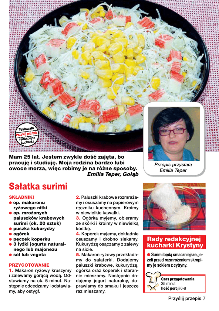Testowała pis Przyślij prze redakcyjna kucharka Mam 25 lat. Jestem zwykle dość zajęta, bo pracuję i studiuję. Moja rodzina bardzo lubi owoce morza, więc robimy je na różne sposoby. Emilia Teper, Gołąb Przepis przysłała Emilia Teper Sałatka surimi 2. Paluszki krabowe rozmrażamy i osuszamy na papierowym ręczniku kuchennym. Kroimy w niewielkie kawałki. 3. Ogórka myjemy, obieramy ze skórki i kroimy w niewielką kostkę. 4. Koperek myjemy, dokładnie osuszamy i drobno siekamy. Kukurydzę osączamy z zalewy na sicie. 5. Makaron ryżowy przekładamy do salaterki. Dodajemy PRZYGOTOWANIE paluszki krabowe, kukurydzę, 1. Makaron ryżowy kruszymy ogórka oraz koperek i starani zalewamy gorącą wodą. Od- nie mieszamy. Następnie dostawiamy na ok. 5 minut. Na- dajemy jogurt naturalny, dostępnie odcedzamy i odstawia- prawiamy do smaku i jeszcze my, aby ostygł. raz mieszamy. SKŁADNIKI ● op. makaronu ryżowego nitki ● op. mrożonych paluszków krabowych surimi (ok. 20 sztuk) ● puszka kukurydzy ● ogórek ● pęczek koperku ● 3 łyżki jogurtu naturalnego lub majonezu ● sól lub vegeta Rady redakcyjnej kucharki Krystyny ● Surimi będą smaczniejsze, je- żeli przed rozmrożeniem skropimy je sokiem z cytryny. Czas przygotowania 35 minut Ilość porcji 6-8 Przyślij przepis 7