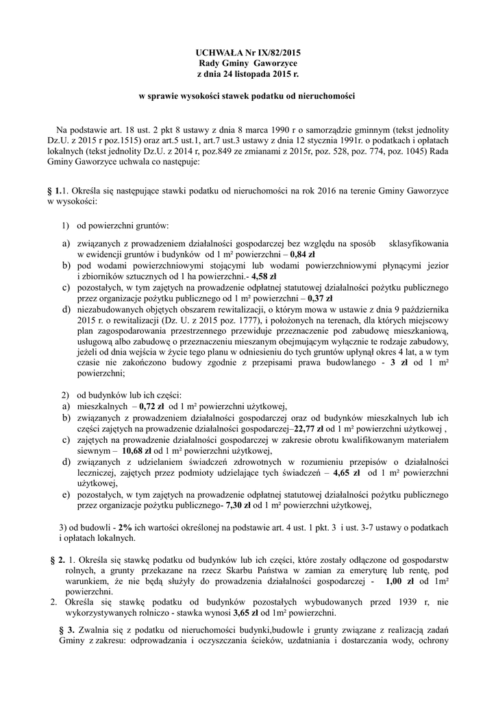 UCHWAŁA Nr IX/82/2015 Rady Gminy Gaworzyce z dnia 24 listopada 2015 r. w sprawie wysokości stawek podatku od nieruchomości Na podstawie art. 18 ust. 2 pkt 8 ustawy z dnia 8 marca 1990 r o samorządzie gminnym (tekst jednolity Dz.U. z 2015 r poz.1515) oraz art.5 ust.1, art.7 ust.3 ustawy z dnia 12 stycznia 1991r. o podatkach i opłatach lokalnych (tekst jednolity Dz.U. z 2014 r, poz.849 ze zmianami z 2015r, poz. 528, poz. 774, poz. 1045) Rada Gminy Gaworzyce uchwala co następuje: § 1.1. Określa się następujące stawki podatku od nieruchomości na rok 2016 na terenie Gminy Gaworzyce w wysokości: 1) od powierzchni gruntów: a) związanych z prowadzeniem działalności gospodarczej bez względu na sposób sklasyfikowania w ewidencji gruntów i budynków od 1 m² powierzchni – 0,84 zł b) pod wodami powierzchniowymi stojącymi lub wodami powierzchniowymi płynącymi jezior i zbiorników sztucznych od 1 ha powierzchni.- 4,58 zł c) pozostałych, w tym zajętych na prowadzenie odpłatnej statutowej działalności pożytku publicznego przez organizacje pożytku publicznego od 1 m² powierzchni – 0,37 zł d) niezabudowanych objętych obszarem rewitalizacji, o którym mowa w ustawie z dnia 9 października 2015 r. o rewitalizacji (Dz. U. z 2015 poz. 1777), i położonych na terenach, dla których miejscowy plan zagospodarowania przestrzennego przewiduje przeznaczenie pod zabudowę mieszkaniową, usługową albo zabudowę o przeznaczeniu mieszanym obejmującym wyłącznie te rodzaje zabudowy, jeżeli od dnia wejścia w życie tego planu w odniesieniu do tych gruntów upłynął okres 4 lat, a w tym czasie nie zakończono budowy zgodnie z przepisami prawa budowlanego - 3 zł od 1 m² powierzchni; 2) od budynków lub ich części: a) mieszkalnych – 0,72 zł od 1 m² powierzchni użytkowej, b) związanych z prowadzeniem działalności gospodarczej oraz od budynków mieszkalnych lub ich części zajętych na prowadzenie działalności gospodarczej–22,77 zł od 1 m² powierzchni użytkowej , c) zajętych na prowadzenie działalności gospodarczej w zakresie obrotu kwalifikowanym materiałem siewnym – 10,68 zł od 1 m² powierzchni użytkowej, d) związanych z udzielaniem świadczeń zdrowotnych w rozumieniu przepisów o działalności leczniczej, zajętych przez podmioty udzielające tych świadczeń – 4,65 zł od 1 m² powierzchni użytkowej, e) pozostałych, w tym zajętych na prowadzenie odpłatnej statutowej działalności pożytku publicznego przez organizacje pożytku publicznego- 7,30 zł od 1 m² powierzchni użytkowej, 3) od budowli - 2% ich wartości określonej na podstawie art. 4 ust. 1 pkt. 3 i ust. 3-7 ustawy o podatkach i opłatach lokalnych. § 2. 1. Określa się stawkę podatku od budynków lub ich części, które zostały odłączone od gospodarstw rolnych, a grunty przekazane na rzecz Skarbu Państwa w zamian za emeryturę lub rentę, pod warunkiem, że nie będą służyły do prowadzenia działalności gospodarczej - 1,00 zł od 1m² powierzchni. 2. Określa się stawkę podatku od budynków pozostałych wybudowanych przed 1939 r, nie wykorzystywanych rolniczo - stawka wynosi 3,65 zł od 1m² powierzchni. § 3. Zwalnia się z podatku od nieruchomości budynki,budowle i grunty związane z realizacją zadań Gminy z zakresu: odprowadzania i oczyszczania ścieków, uzdatniania i dostarczania wody, ochrony przeciwpożarowej, ochrony zdrowia, kultury oraz pomocy społecznej, z wyjątkiem zajętych na prowadzenie działalności gospodarczej. § 4. Wykonanie uchwały powierza się Wójtowi Gminy. § 5. Uchwała wchodzi w życie po upływie 14 dni od dnia ogłoszenia w Dzienniku Urzędowym Województwa Dolnośląskiego z mocą obowiązującą od 1 stycznia 2016r. Przewodnicząca Rady Gminy Danuta Pawliszyn