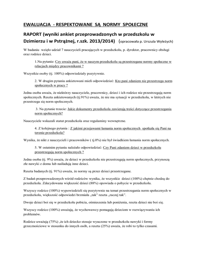 EWALUACJA - RESPEKTOWANE SĄ NORMY SPOŁECZNE RAPORT (wyniki ankiet przeprowadzonych w przedszkolu w Dzimierzu i w Pstrążnej, r.szk. 2013/2014) (opracowała p. Urszula Wyleżych) W badaniu wzięło udział 7 nauczycieli pracujących w przedszkolu, p. dyrektor, pracownicy obsługi oraz rodzice dzieci. 1.Na pytanie: Czy uważa pani, że w naszym przedszkolu są przestrzegane normy społeczne w relacjach między pracownikami ? Wszystkie osoby (tj. 100%) odpowiedziały pozytywnie. 2. W drugim pytaniu ankietowani mieli odpowiedzieć: Kto pani zdaniem nie przestrzega norm społecznych w pracy ? Jedna osoba uważa, że niektórzy nauczyciele, pracownicy, dzieci i ich rodzice nie przestrzegają norm społecznych. Reszta ankietowanych (tj.91%) uważa, że nie ma sytuacji w przedszkolu, w których nie przestrzega się norm społecznych. 3. Na pytanie trzecie: Jakie dokumenty przedszkola zawierają treści dotyczące przestrzegania norm społecznych? Nauczyciele wskazali statut przedszkola oraz regulaminy wewnętrzne. 4. Z kolejnego pytania : Z jakimi przejawami łamania norm społecznych spotkała się Pani na terenie przedszkola? Wynika, że nikt z nauczycieli i pracowników ( tj.0%) nie był świadkiem łamania norm społecznych. 5. W ostatnim pytaniu należało odpowiedzieć: Czy Pani zdaniem dzieci w przedszkolu przestrzegają norm społecznych ? Jedna osoba (tj. 9%) uważa, że dzieci w przedszkolu nie przestrzegają norm społecznych, przynoszą złe nawyki z domu lub naśladują inne dzieci. Reszta badanych (tj. 91%) uważa, że normy są przez dzieci przestrzegane. Z badań przeprowadzonych wśród rodziców wynika, że wszystkie dzieci (100%) chętnie chodzą do przedszkola. Zdecydowana większość dzieci (88%) opowiada o pobycie w przedszkolu. Wszyscy rodzice (100%) wypowiedzieli się pozytywnie na temat przestrzegania norm społecznych w przedszkolu, większość odpowiedzi brzmiała „tak” reszta „raczej tak”. Dwoje dzieci boi się w przedszkolu pobicia, ośmieszenia lub poniżenia, reszta dzieci nie boi się. Wszyscy rodzice (100%) uważają, że wychowawcy pomagają dzieciom w rozwiązywaniu ich problemów. Rodzice uważają (75%) ,że ich dziecko stosuje wyuczone w przedszkolu nawyki i formy grzecznościowe w stosunku do innych osób, a reszta (25%) uważa, że robi to tylko czasami.