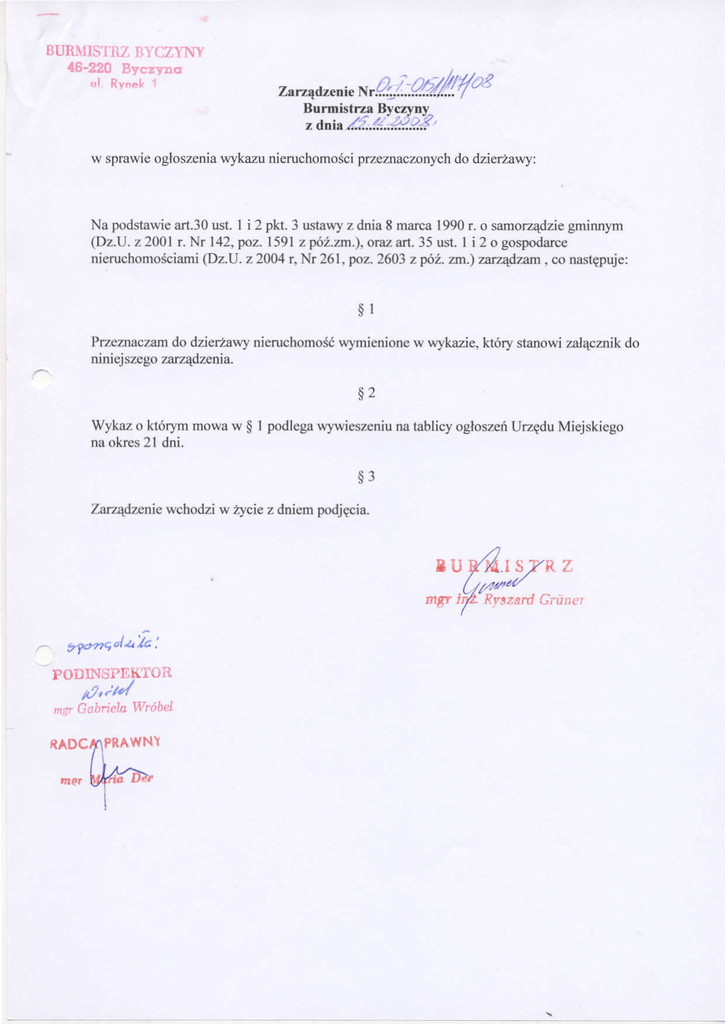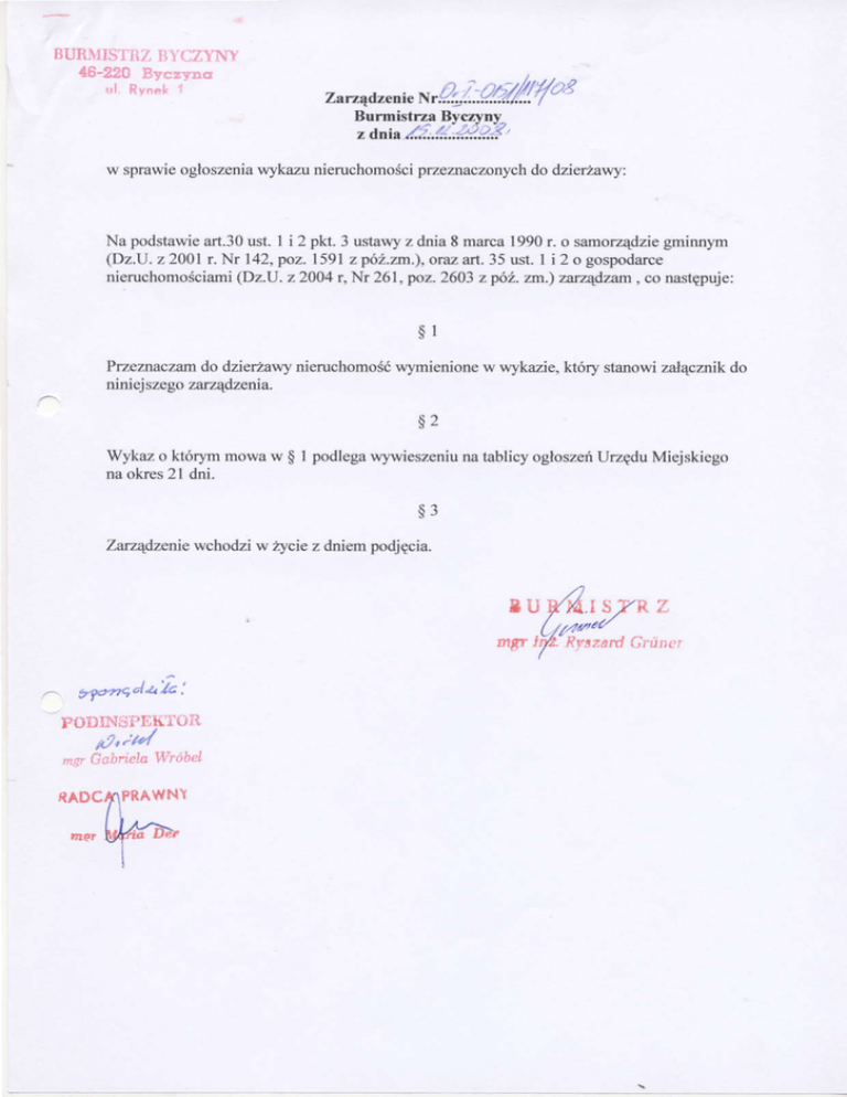 wykaz nini€jgzY zostaje w]rwi€szoly na t8blicy og|oszońUrzędu Miejskiego w Byczf,nie la okres 21 dni tj' od dnia ..........'.....'2008r.