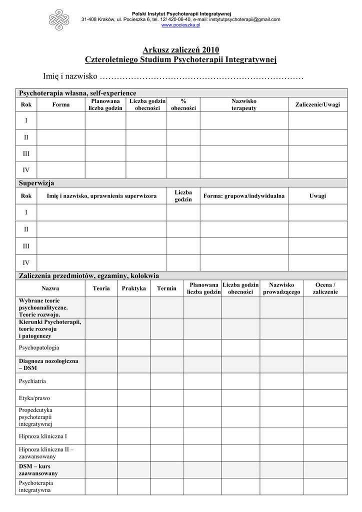Polski Instytut Psychoterapii Integratywnej 31-408 Kraków, ul. Pocieszka 6, tel. 12/ 420-06-40, e-mail: [email protected] www.pocieszka.pl Arkusz zaliczeń 2010 Czteroletniego Studium Psychoterapii Integratywnej Imię i nazwisko ……………………………………………………………… Psychoterapia własna, self-experience Rok Forma Planowana liczba godzin Liczba godzin % obecności obecności Nazwisko terapeuty Zaliczenie/Uwagi Forma: grupowa/indywidualna Uwagi I II III IV Superwizja Rok Liczba godzin Imię i nazwisko, uprawnienia superwizora I II III IV Zaliczenia przedmiotów, egzaminy, kolokwia Nazwa Wybrane teorie psychoanalityczne. Teorie rozwoju. Kierunki Psychoterapii, teorie rozwoju i patogenezy Psychopatologia Diagnoza nozologiczna – DSM Psychiatria Etyka/prawo Propedeutyka psychoterapii integratywnej Hipnoza kliniczna I Hipnoza kliniczna II – zaawansowany DSM – kurs zaawansowany Psychoterapia integratywna Teoria Praktyka Termin Planowana Liczba godzin Nazwisko liczba godzin obecności prowadzącego Ocena / zaliczenie Polski Instytut Psychoterapii Integratywnej 31-408 Kraków, ul. Pocieszka 6, tel. 12/ 420-06-40, e-mail: [email protected] www.pocieszka.pl Zaliczenia przedmiotów, egzaminy, kolokwia, cd Nazwa Teoria Praktyka Termin Planowana Liczba godzin liczba godzin obecności Nazwisko prowadzącego Ocena / zaliczenie Warsztaty psychoterapeutyczne Szkolenia fakultatywne i specjalizacyjne Nazwa Teoria Praktyka Planowana Liczba godzin liczba godzin obecności Prowadzący (główny) Uwagi Integratywna psychoterapia krótkoterminowa lub Psychoterapia i poradnictwo Integratywna psychoterapia depresji Integratywna psychoterapia zaburzeń lękowych Psychosomatoterapia StaŜ kliniczny Nazwa i adres placówki Liczba godzin Termin Nazwisko zaliczającego Uwagi Prace pisemne Tytuł Studium przypadku pacjenta psychotycznego Esej – moja specjalizacja Praca dyplomowa – studium przypadku Data zaliczenia Ocena Nazwisko prowadzącego Uwagi Polski Instytut Psychoterapii Integratywnej 31-408 Kraków, ul. Pocieszka 6, tel. 12/ 420-06-40, e-mail: [email protected] www.pocieszka.pl Praktyka psychoterapeutyczna superwizowana rok Nazwa, rodzaj i adres placówki Średnia liczba sesji w tyg. Szacunkowa liczba sesji w roku Nazwisko zaliczającego I II III IV Komisyjne Egzaminy Kompetencyjne (Rekomendacyjny, Certyfikacyjny, etc.) Oceny Nazwa Data Czynnik specyficzny Czynnik techniczny Egzaminatorzy Uwagi Zjazdy, sympozja i konferencje naukowe Tytuł Organizator Liczba godzin Data Tytuł prezentacji własnej Podsumowanie Studium Rodzaj kształcenia Psychoterapia własna / self experience Superwizja Kształcenie teoretyczne Kształcenie praktyczne StaŜ kliniczny Praktyka superwizowana Łączna liczba godzin Termin Uwagi Polski Instytut Psychoterapii Integratywnej 31-408 Kraków, ul. Pocieszka 6, tel. 12/ 420-06-40, e-mail: [email protected] www.pocieszka.pl Podsumowanie szkolenia Rok I Rok II Rok III Rok IV Psychoterapia własna Propedeutyka Psychoterapia własna Inne kierunki psychoterapii - egzamin Psychoanaliza - egzamin Superwizja Propedeutyka Psychopatologia DSM Krótko./ Poradnictwo Psychiatria Egz komp. Zaliczenie roku. Uwagi Egz komp. Zaliczenie roku. Uwagi Psychoterapia własna Superwizja Hipnoza - I Hipnoza - II Psychosomatoterapia Psychoterapia Integratywna Warsztaty z metod Depresja Lęki Egz komp. Zaliczenie roku. Uwagi Psychoterapia własna Superwizja Etyka/Prawo Warsztat …………… Warsztat …………… Warsztat …………… Warsztat …………… Warsztat ………… Warsztat …………… Egz komp. Zaliczenie roku. Uwagi
