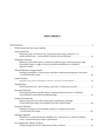 Spis treści Wprowadzenie . . . . . . . . . . . . . . . . . . . . . . . . . . . . . . . . . . . . . . . . . . . . . . . . . . . . . . . . . . . . . . . . . . . . . 9 i. Wychowanie fizyczne i sport szkolny Maria Skoniecka Realizacja zajęć ruchowych oraz wychowania fizycznego w klasach i–iii szkoły podstawowej – ocena efektów reformy systemu edukacji. . . . . . . . . . . . . . . . . . . . 19 Władysław Pańczyk Badania uczniowskich opinii o miejscach realizacji zajęć wychowania fizycznego (dynamika zmian w ciągu 20 lat na przykładzie południowo-wschodnich regionów Polski). . . . . . . . . . . . . . . . . . . . . . . . . . . . . . . . . . . . . . . . . . . . . . . . . . . . . . . . . . 29 Witold Półtorak, Grzegorz Bielec Pomiędzy formalnym i rzeczywistym sposobem realizowania programu nauczania z wychowania fizycznego. . . . . . . . . . . . . . . . . . . . . . . . . . . . . . . . . . . . . . . . . . . . . . . . . . . 49 Adam Przybysz Aktualny stan sportu szkolnego w Krośnie i powiecie krośnieńskim. . . . . . . . . . . . . . . . . 59 Michał Baran Wychowanie fizyczne i sport szkolny a potrzeby i oczekiwania uczniów . . . . . . . . . . . . . 71 Krzysztof Warchoł Gimnastyka podstawowa jako forma rywalizacji sportowej dzieci i młodzieży na przykładzie województwa podkarpackiego. . . . . . . . . . . . . . . . . . . . . . . . . . . . . . . . . . 87 Andrzej Nowakowski Imprezy sprawnościowe dla uczniów jako uzupełnienie szkolnego wychowania fizycznego na przykładzie powiatu wadowickiego. . . . . . . . . . . . . . . . . . . . 99 Krzysztof Warchoł Podstawy teoretyczne oraz praktyka szkolna we współczesnej ocenie z wychowania fizycznego. . . . . . . . . . . . . . . . . . . . . . . . . . . . . . . . . . . . . . . . . . . . . . . . . . 107 Jadwiga Cyganiuk Samoocena i samokontrola jako dydaktyczna, wychowawcza i społeczna funkcja oceny z wychowania fizycznego w gimnazjum. . . . . . . . . . . . . . . . . . . . . . . . . . . . . . . . . 119 Ewa Kałamacka, Wacław Srokosz Szkolne przygotowanie do całożyciowej troski o zdrowie . . . . . . . . . . . . . . . . . . . . . . . . . 131 Spis treści 6 Marzena Kurzak Elementy stylu życia młodzieży gimnazjalnej . . . . . . . . . . . . . . . . . . . . . . . . . . . . . . . . . 139 Aleksander Wiecheć Kultura fizyczna realizowana w ramach projektów unijnych jako szansa rozwoju szkoły po reformie systemu edukacji, na przykładzie Zespołu Szkół w Zawoi Wilcznej. . . . . . . . . . . . . . . . . . . . . . . . . . . . . . . 151 ii. Aktywny wypoczynek, rekreacja i turystyka szkolna Włodzimierz Chodinow Wypoczynek aktywny realizowany w treningu obwodowym. . . . . . . . . . . . . . . . . . . . . . 165 Emilian Zadarko, Zbigniew Barabasz, Edyta Nizioł Narciarstwo zjazdowe jako forma zajęć sportowo-rekreacyjnych w opinii młodzieży i dorosłych z terenu Podkarpacia . . . . . . . . . . . . . . . . . . . . . . . . . . . 175 Rafał Kapica Wycieczki szkolne w opinii studentów wychowania fizycznego. . . . . . . . . . . . . . . . . . . . 187 Jarosław Herbert, Maciej Brożyna Dzieci i młodzież poza szkołą jako szczególny odbiorca usług turystyczno-rekreacyjnych. . . . . . . . . . . . . . . . . . . . . . . . . . . . . . . . . . . . . . . . . . . . . . . . . 195 iii. Rozwój somatyczny i motoryczny, wychowanie fizyczne specjalne, elementy gimnastyki korekcyjnej i fizjoterapii Dominik Dąbrowski Poziom zdolności motorycznych oraz ich uwarunkowania w rozwoju dzieci i młodzieży z dysfunkcjami narządu słuchu . . . . . . . . . . . . . . . . . . . . 211 Dominik Dąbrowski Uwarunkowania rozwoju fizycznego dzieci i młodzieży z dysfunkcjami narządu słuchu z terenu wschodniej Polski . . . . . . . . . . . . . . . . . . . . . . 221 Stanisław Cieszkowski, Justyna Lenik, Paweł Lenik, Karolina Przednowek, Krzysztof Przednowek Wpływ systematycznego treningu pływackiego na poziom rozwoju somatycznego i motorycznego chłopców w wieku 10–12 lat. . . . . . . . . . . . . . . . . . . . . . . . . . . . . . . . . . . 229 Adam Bielecki Sprawność fizyczna człowieka jako pozytywny miernik zdrowia. . . . . . . . . . . . . . . . . . 239 Łukasz Wojtyczek Gimnastyka korekcyjna czy fizjoterapia? . . . . . . . . . . . . . . . . . . . . . . . . . . . . . . . . . . . . . 255 iv. Z tradycji kultury fizycznej na Podkarpaciu Paweł Świder, Stanisław Cieszkowski Kadra szkoleniowa i baza sportowa województwa krośnieńskiego w latach 1975–1998. . . . . . . . . . . . . . . . . . . . . . . . . . . . . . . . . . . . . . . . . . . . . . . . . . . . . . . 261 Spis treści Paweł Świder, Paweł Lenik, Justyna Lenik Struktura organizacyjna kultury fizycznej na terenie województwa krośnieńskiego w latach 1975–1998. . . . . . . . . . . . . . . . . . . . . . 273 Grzegorz Bielec Rozwój rzeszowskiej gimnastyki na tle ogólnopolskim w latach powojennych (1945–1956) . . . . . . . . . . . . . . . . . . . . . . . . . . . . . . . . . . . . . . . . . . 287 Grzegorz Bielec, Witold Półtorak Rozwój wychowania fizycznego w Galicji w latach 1772–1914 . . . . . . . . . . . . . . . . . . . . 305 Iwona Tabaczek-Bejster Szkolenie ratowników wodnych w Polsce (1945–1989). . . . . . . . . . . . . . . . . . . . . . . . . . . 319 Wojciech Bajorek, Paweł Król, Marian Rzepko Wpływ transformacji systemowej w Polsce po roku 1989 na funkcjonowanie klubów sportowych . . . . . . . . . . . . . . . . . . . . . . . . . . . . . . . . . . . . . . 335 v. Wybrane zagadnienia z pedeutologii wychowania fizycznego Anna Bodasińska, Katarzyna Mularczyk Nauczyciel wychowania fizycznego jako promotor i kreator zdrowotnych wartości gier zespołowych. . . . . . . . . . . . . . . . . . . . . . . . . . . . . . . . . . . . . . 353 Krzysztof Warchoł Społeczne i zawodowe uwarunkowania pracy nauczyciela wychowania fizycznego. . . . . . . . . . . . . . . . . . . . . . . . . . . . . . . . . . . . . . . . . 365 Informacja o autorach. . . . . . . . . . . . . . . . . . . . . . . . . .