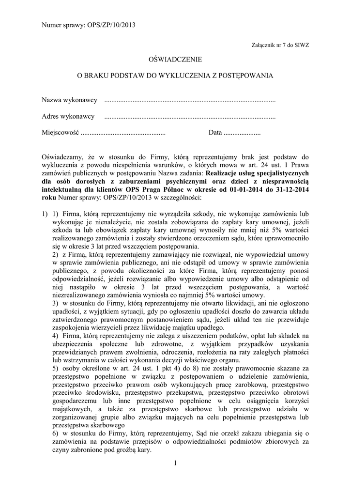 Numer sprawy: OPS/ZP/10/2013 Załącznik nr 7 do SIWZ OŚWIADCZENIE O BRAKU PODSTAW DO WYKLUCZENIA Z POSTĘPOWANIA Nazwa wykonawcy ................................................................................................. Adres wykonawcy ................................................................................................. Miejscowość ................................................ Data ..................... Oświadczamy, że w stosunku do Firmy, którą reprezentujemy brak jest podstaw do wykluczenia z powodu niespełnienia warunków, o których mowa w art. 24 ust. 1 Prawa zamówień publicznych w postępowaniu Nazwa zadania: Realizacje usług specjalistycznych dla osób dorosłych z zaburzeniami psychicznymi oraz dzieci z niesprawnością intelektualną dla klientów OPS Praga Północ w okresie od 01-01-2014 do 31-12-2014 roku Numer sprawy: OPS/ZP/10/2013 w szczególności: 1) 1) Firma, którą reprezentujemy nie wyrządziła szkody, nie wykonując zamówienia lub wykonując je nienależycie, nie została zobowiązana do zapłaty kary umownej, jeżeli szkoda ta lub obowiązek zapłaty kary umownej wynosiły nie mniej niż 5% wartości realizowanego zamówienia i zostały stwierdzone orzeczeniem sądu, które uprawomocniło się w okresie 3 lat przed wszczęciem postępowania. 2) z Firmą, którą reprezentujemy zamawiający nie rozwiązał, nie wypowiedział umowy w sprawie zamówienia publicznego, ani nie odstąpił od umowy w sprawie zamówienia publicznego, z powodu okoliczności za które Firma, którą reprezentujemy ponosi odpowiedzialność, jeżeli rozwiązanie albo wypowiedzenie umowy albo odstąpienie od niej nastąpiło w okresie 3 lat przed wszczęciem postępowania, a wartość niezrealizowanego zamówienia wyniosła co najmniej 5% wartości umowy. 3) w stosunku do Firmy, którą reprezentujemy nie otwarto likwidacji, ani nie ogłoszono upadłości, z wyjątkiem sytuacji, gdy po ogłoszeniu upadłości doszło do zawarcia układu zatwierdzonego prawomocnym postanowieniem sądu, jeżeli układ ten nie przewiduje zaspokojenia wierzycieli przez likwidację majątku upadłego. 4) Firma, którą reprezentujemy nie zalega z uiszczeniem podatków, opłat lub składek na ubezpieczenia społeczne lub zdrowotne, z wyjątkiem przypadków uzyskania przewidzianych prawem zwolnienia, odroczenia, rozłożenia na raty zaległych płatności lub wstrzymania w całości wykonania decyzji właściwego organu. 5) osoby określone w art. 24 ust. 1 pkt 4) do 8) nie zostały prawomocnie skazane za przestępstwo popełnione w związku z postępowaniem o udzielenie zamówienia, przestępstwo przeciwko prawom osób wykonujących pracę zarobkową, przestępstwo przeciwko środowisku, przestępstwo przekupstwa, przestępstwo przeciwko obrotowi gospodarczemu lub inne przestępstwo popełnione w celu osiągnięcia korzyści majątkowych, a także za przestępstwo skarbowe lub przestępstwo udziału w zorganizowanej grupie albo związku mających na celu popełnienie przestępstwa lub przestępstwa skarbowego 6) w stosunku do Firmy, którą reprezentujemy, Sąd nie orzekł zakazu ubiegania się o zamówienia na podstawie przepisów o odpowiedzialności podmiotów zbiorowych za czyny zabronione pod groźbą kary. 1 Numer sprawy: OPS/ZP/10/2013 7) w przypadku wykonawcy będącego osobą fizyczną, nie zostałem / zostałam prawomocnie skazany / skazana za przestępstwo, o którym mowa w art. 9 lub art. 10 ustawy z dnia 15 czerwca 2012 r. o skutkach powierzania wykonywania pracy cudzoziemcom przebywającym wbrew przepisom na terytorium Rzeczypospolitej Polskiej (Dz. U. poz. 769) - przez okres 1 roku od dnia uprawomocnienia się wyroku. 8) Firmy, którą reprezentujemy, będącą spółką jawną, spółką partnerską, spółką komandytową, spółką komandytowo-akcyjną lub osobą prawną, nie skazano prawomocnie za przestępstwo, o którym mowa w art. 9 lub art. 10 ustawy z dnia 15 czerwca 2012 r. o skutkach powierzania wykonywania pracy cudzoziemcom przebywającym wbrew przepisom na terytorium Rzeczypospolitej Polskiej - przez okres 1 roku od dnia uprawomocnienia się wyroku, odpowiednio wspólnika, partnera, członka zarządu, komplementariusza lub urzędującego członka organu zarządzającego Na potwierdzenie spełnienia wyżej wymienionych warunków do oferty załączam wszelkie dokumenty i oświadczenia wskazane przez zamawiającego w specyfikacji istotnych warunków zamówienia. ................................................................................. (data i czytelny podpis wykonawcy) 2