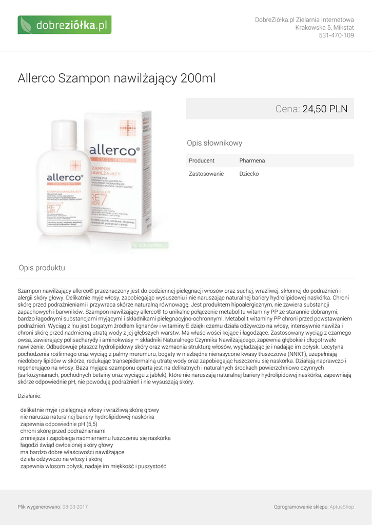 DobreZiółka.pl Zielarnia Internetowa Krakowska 5, Mikstat 531-470-109 Allerco Szampon nawilżający 200ml Cena: 24,50 PLN Opis słownikowy Producent Pharmena Zastosowanie Dziecko Opis produktu Szampon nawilżający allerco® przeznaczony jest do codziennej pielęgnacji włosów oraz suchej, wrażliwej, skłonnej do podrażnień i alergii skóry głowy. Delikatnie myje włosy, zapobiegając wysuszeniu i nie naruszając naturalnej bariery hydrolipidowej naskórka. Chroni skórę przed podrażnieniami i przywraca skórze naturalną równowagę. Jest produktem hipoalergicznym, nie zawiera substancji zapachowych i barwników. Szampon nawilżający allerco® to unikalne połączenie metabolitu witaminy PP ze starannie dobranymi, bardzo łagodnymi substancjami myjącymi i składnikami pielęgnacyjno-ochronnymi. Metabolit witaminy PP chroni przed powstawaniem podrażnień. Wyciąg z lnu jest bogatym źródłem lignanów i witaminy E dzięki czemu działa odżywczo na włosy, intensywnie nawilża i chroni skórę przed nadmierną utratą wody z jej głębszych warstw. Ma właściwości kojące i łagodzące. Zastosowany wyciąg z czarnego owsa, zawierający polisacharydy i aminokwasy – składniki Naturalnego Czynnika Nawilżającego, zapewnia głębokie i długotrwałe nawilżenie. Odbudowuje płaszcz hydrolipidowy skóry oraz wzmacnia strukturę włosów, wygładzając je i nadając im połysk. Lecytyna pochodzenia roślinnego oraz wyciąg z palmy murumuru, bogaty w niezbędne nienasycone kwasy tłuszczowe (NNKT), uzupełniają niedobory lipidów w skórze, redukując transepidermalną utratę wody oraz zapobiegając łuszczeniu się naskórka. Działają naprawczo i regenerująco na włosy. Baza myjąca szamponu oparta jest na delikatnych i naturalnych środkach powierzchniowo czynnych (sarkozynianach, pochodnych betainy oraz wyciągu z jabłek), które nie naruszają naturalnej bariery hydrolipidowej naskórka, zapewniają skórze odpowiednie pH, nie powodują podrażnień i nie wysuszają skóry. Działanie: delikatnie myje i pielęgnuje włosy i wrażliwą skórę głowy nie narusza naturalnej bariery hydrolipidowej naskórka zapewnia odpowiednie pH (5,5) chroni skórę przed podrażnieniami zmniejsza i zapobiega nadmiernemu łuszczeniu się naskórka łagodzi świąd owłosionej skóry głowy ma bardzo dobre właściwości nawilżające działa odżywczo na włosy i skórę zapewnia włosom połysk, nadaje im miękkość i puszystość Plik wygenerowano: 08-03-2017 Oprogramowanie sklepu: AptusShop DobreZiółka.pl Zielarnia Internetowa Krakowska 5, Mikstat 531-470-109 nie obciąża włosów nie szczypie w oczy Sposób stosowania: Szampon należy nanieść na mokre włosy i starannie masować do uzyskania piany. Następnie dokładnie spłukać wodą. Szampon może być używany w sposób ciągły. Wskazania do stosowania: Codzienna pielęgnacja włosów oraz suchej, wrażliwej, skłonnej do podrażnień i alergii skóry głowy. Produkt odpowiedni do stosowania u dzieci i niemowląt. Plik wygenerowano: 08-03-2017 Powered by TCPDF (www.tcpdf.org) Oprogramowanie sklepu: AptusShop
