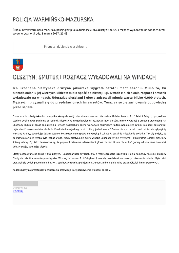 POLICJA WARMIŃSKO-MAZURSKA Źródło: http://warminsko-mazurska.policja.gov.pl/ol/aktualnosci/1767,Olsztyn-Smutek-i-rozpacz-wyladowali-na-windach.html Wygenerowano: Środa, 8 marca 2017, 21:43 Strona znajduje się w archiwum. OLSZTYN: SMUTEK I ROZPACZ WYŁADOWALI NA WINDACH Ich ukochana olsztyńska drużyna piłkarska wygrała ostatni mecz sezonu. Mimo to, ku niezadowoleniu jej wiernych kibiców miała spaść do niższej ligi. Dwóch z nich swoją rozpacz i smutek wyładowało na windach. Uderzając pięściami i głową zniszczyli mienie warte blisko 4.000 złotych. Mężczyźni przyznali się do przedstawionych im zarzutów. Teraz za swoje zachowanie odpowiedzą przed sądem. 6 czerwca br. olsztyńska drużyna piłkarska grała swój ostatni mecz sezonu. Niespełna 18-letni Łukasz R. i 19-letni Patryk J. przyszli na stadion dopingować swojemu zespołowi. Niestety ku niezadowoleniu i rozpaczy jego kibiców, mimo wygranej z drużyną przyjezdną ich ukochany klub miał spaść do niższej ligi. Dwóch nastolatków zdenerwowanych zaistniałym faktem wspólnie ze swoimi kolegami postanowili pójść utopić swoje smutki w alkoholu. Poszli do domu jednego z nich. Kiedy jechali windą 17-latek nie wytrzymał i dwukrotnie uderzył pięścią w ścianę kabiny, powodując jej zniszczenie. Po zakrapianym spotkaniu Patryk J. i Łukasz R. poszli do mieszkania 19-latka. Tak się złożyło, że do Patryka również trzeba było jechać windą. Kiedy olsztynianie byli w windzie „gospodarz” nie wytrzymał i kilkukrotnie uderzył pięścią w ścianę kabiny. Był tak zdenerwowany, że poprawił czterema uderzeniami głową. Łukasz R. nie chciał być gorszy od kompana i również dołożył swoje, uderzając pięścią. Straty oszacowano na blisko 4.000 złotych. Funkcjonariusze Wydziału dw. z Przestępczością Przeciwko Mieniu Komendy Miejskiej Policji w Olsztynie ustalili sprawców przestępstw. Wczoraj Łukaszowi R. i Patrykowi J. zostały przedstawione zarzuty zniszczenia mienia. Mężczyźni przyznali się do ich popełnienia. Patryk J. oświadczył również policjantom, że uderzał bo nie lubi wind oraz spółdzielni mieszkaniowych. Kodeks Karny za przestępstwo zniszczenia przewiduję karę pozbawienia wolności do lat 5. Ocena: 0/5 (0) Tweetnij