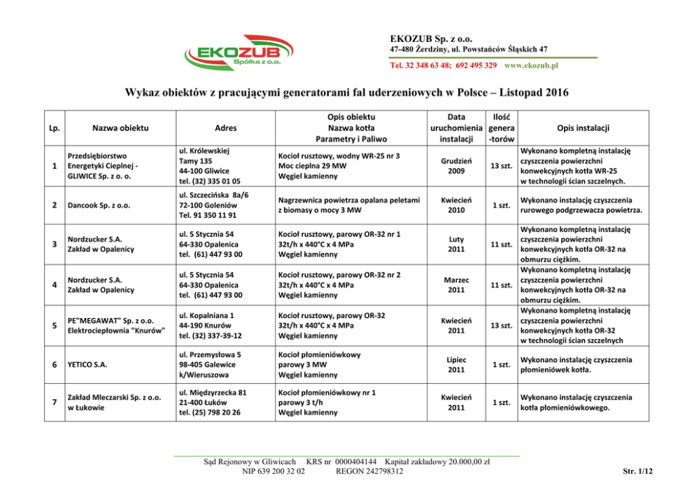 EKOZUB Sp. z o.o. 47-480 Żerdziny, ul. Powstańców Śląskich 47 Tel. 32 348 63 48; 692 495 329 www.ekozub.pl Wykaz obiektów z pracującymi generatorami fal uderzeniowych w Polsce – Listopad 2016 Lp. Nazwa obiektu Adres Opis obiektu Nazwa kotła Parametry i Paliwo Data Ilość uruchomienia genera instalacji -torów Opis instalacji 1 Przedsiębiorstwo Energetyki Cieplnej GLIWICE Sp. z o. o. ul. Królewskiej Tamy 135 44-100 Gliwice tel. (32) 335 01 05 Kocioł rusztowy, wodny WR-25 nr 3 Moc cieplna 29 MW Węgiel kamienny Grudzień 2009 Wykonano kompletną instalację czyszczenia powierzchni 13 szt. konwekcyjnych kotła WR-25 w technologii ścian szczelnych. 2 Dancook Sp. z o.o. ul. Szczecińska 8a/6 72-100 Goleniów Tel. 91 350 11 91 Nagrzewnica powietrza opalana peletami z biomasy o mocy 3 MW Kwiecień 2010 1 szt. 3 Nordzucker S.A. Zakład w Opalenicy ul. 5 Stycznia 54 64-330 Opalenica tel. (61) 447 93 00 Kocioł rusztowy, parowy OR-32 nr 1 32t/h x 440°C x 4 MPa Węgiel kamienny Luty 2011 4 Nordzucker S.A. Zakład w Opalenicy ul. 5 Stycznia 54 64-330 Opalenica tel. (61) 447 93 00 Kocioł rusztowy, parowy OR-32 nr 2 32t/h x 440°C x 4 MPa Węgiel kamienny Marzec 2011 5 PE"MEGAWAT" Sp. z o.o. Elektrociepłownia "Knurów" ul. Kopalniana 1 44-190 Knurów tel. (32) 337-39-12 Kocioł rusztowy, parowy OR-32 32t/h x 440°C x 4 MPa Węgiel kamienny 6 YETICO S.A. ul. Przemysłowa 5 98-405 Galewice k/Wieruszowa Kocioł płomieniówkowy parowy 3 MW Węgiel kamienny 7 Zakład Mleczarski Sp. z o.o. w Łukowie ul. Międzyrzecka 81 21-400 Łuków tel. (25) 798 20 26 Kocioł płomieniówkowy nr 1 parowy 3 t/h Węgiel kamienny Kwiecień 2011 Wykonano instalację czyszczenia rurowego podgrzewacza powietrza. Wykonano kompletną instalację czyszczenia powierzchni 11 szt. konwekcyjnych kotła OR-32 na obmurzu ciężkim. Wykonano kompletną instalację czyszczenia powierzchni 11 szt. konwekcyjnych kotła OR-32 na obmurzu ciężkim. Wykonano kompletną instalację czyszczenia powierzchni 13 szt. konwekcyjnych kotła OR-32 w technologii ścian szczelnych Lipiec 2011 1 szt. Wykonano instalację czyszczenia płomieniówek kotła. Kwiecień 2011 1 szt. Wykonano instalację czyszczenia kotła płomieniówkowego. ______________________________________________________________________ Sąd Rejonowy w Gliwicach KRS nr 0000404144 Kapitał zakładowy 20.000,00 zł NIP 639 200 32 02 REGON 242798312 Str. 1/12 EKOZUB Sp. z o.o. 47-480 Żerdziny, ul. Powstańców Śląskich 47 Tel. 32 348 63 48; 692 495 329 www.ekozub.pl 8 Przedsiębiorstwo Energetyki Cieplnej GLIWICE Sp. z o. o. 9 Przedsiębiorstwo Energetyki Cieplnej GLIWICE Sp. z o. o. ul. Królewskiej Tamy 135 44-100 Gliwice tel. (32) 335 01 05 ul. Królewskiej Tamy 135 44-100 Gliwice tel. (32) 335 01 05 Wykonano kompletną instalację czyszczenia powierzchni 14 szt. konwekcyjnych kotła WR-25 w technologii ścian szczelnych. Wykonano instalację usuwania nawisów w bunkrze węgla kotła 4 szt. WR-25 w technologii ścian szczelnych. Kocioł rusztowy, wodny WR-25 nr 2 Moc cieplna 29 MW Węgiel kamienny Listopad 2011 Zbiornik węgla kotła WR-25 nr 2 Listopad 2011 ul. Pomarzanowice 23 62-010 Pobiedziska tel. (61) 815 30 04 Kocioł płomieniówkowy, parowy EKONOMIK-125 Biomasa Styczeń 2012 1 szt. Wykonano instalację czyszczenia kotła płomieniówkowego. 11 Przedsiębiorstwo Energetyki Cieplnej GLIWICE Sp. z o. o. ul. Królewskiej Tamy 135 44-100 Gliwice tel. (32) 335 01 05 Zbiornik wapna Wrzesień 2012 2 szt. Wykonano instalację usuwania nawisów w zbiorniku wapna. 12 Krajowa Spółka Cukrowa S.A. Cukrownia Kluczewo ul. Broniewskiego 23 73-102 Stargard Szczeciński Zasobnik węgla kotła OR-50 tel. (91)576 33 22 Wrzesień 2012 2 szt. Wykonano instalację usuwania nawisów w bunkrze węgla kotła WR-25 w technologii ścian szczelnych. 13 Przedsiębiorstwo Energetyki Cieplnej GLIWICE Sp. z o. o. ul. Królewskiej Tamy 135 44-100 Gliwice tel. (32) 335 01 05 Absorber w Instalacji Odsiarczania Spalin Wrzesień 2012 4 szt. Wykonano instalację czyszczenia powierzchni absorbera w obrębie głowicy rozpyłowej. 14 P.P.H.U. Agrokompleks Gorzelnia Polski Konopad 86-105Świecie Kocioł płomieniówkowy parowy 2,2 t/h Węgiel kamienny Grudzień 2012 1 szt. Wykonano instalację czyszczenia kotła płomieniówkowego. 15 Zakład Utylizacji Odpadów Sp. z o.o. ul. Sulańska 11 62-510 Konin tel. (63) 249 36 24 Wymiennik płomieniówkowy 3 t/h Odpady medyczne oraz wszelkie inne niebezpieczne odpady w formie stałej i płynnej Grudzień 2012 2 szt. Wykonano instalację czyszczenia płomieniówek wymiennika ciepła w instalacji utylizacji odpadów. 10 DREW-ZET Sp. z o.o. ______________________________________________________________________ Sąd Rejonowy w Gliwicach KRS nr 0000404144 Kapitał zakładowy 20.000,00 zł NIP 639 200 32 02 REGON 242798312 Str. 2/12 EKOZUB Sp. z o.o. 47-480 Żerdziny, ul. Powstańców Śląskich 47 Tel. 32 348 63 48; 692 495 329 www.ekozub.pl ul. Kolejowa 14-220 Kisielice tel. (55) 278 55 00 Kocioł rusztowy, wodny KNS 3000 Moc cieplna 3MW Rozdrobniona słoma ul. Pomarzanowice 23 62-010 Pobiedziska Te. (61) 815 30 04 Kocioł płomieniówkowy parowy ERm- 2,4 Biomasa 18 Przedsiębiorstwo Energetyki Cieplnej GLIWICE Sp. z o. o. ul. Królewskiej Tamy 135 44-100 Gliwice tel. (32) 335 01 05 Kocioł rusztowy, wodny WR-25 nr 1 Moc cieplna 29 MW Węgiel kamienny Kwiecień 2013 Wykonano kompletną instalację czyszczenia powierzchni 14 szt. konwekcyjnych kotła WR-25 w technologii ścian szczelnych. 19 PEC Sp. z o.o. w Grajewie ul. Targowa 2 19-200 Grajewo tel. (86) 272 23 88 Kocioł rusztowy, parowy Wydajność 8 t/h Wilgotna biomasa Kwiecień 2013 5 szt. Wykonano kompletną instalację czyszczenia wszystkich powierzchni wymiany ciepła. 20 Zakład Mleczarski Sp. z o.o. w Łukowie ul. Międzyrzecka 81 21-400 Łuków tel. (25) 798 20 26 Kocioł płomieniówkowy nr 2 parowy 3 t/h Węgiel kamienny Kwiecień 2013 1 szt. Wykonano instalację czyszczenia kotła płomieniów