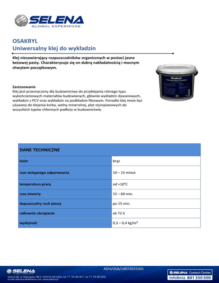OSAKRYL Uniwersalny klej do wykładzin Klej niezawierający rozpuszczalników organicznych w postaci jasno beżowej pasty. Charakteryzuje się on dobrą nakładalnością i mocnym chwytem początkowym. Zastosowanie Klej jest przeznaczony dla budownictwa do przyklejania różnego typu wykończeniowych materiałów budowlanych, głównie wykładzin dywanowych, wykładzin z PCV oraz wykładzin na podkładzie filcowym. Ponadto klej może być używany do klejenia korka, wełny mineralnej, płyt styropianowych do wszystkich typów chłonnych podłoży w budownictwie. DANE TECHNICZNE kolor brąz czas wstępnego odparowania 10 – 15 minut temperatura pracy od +10℃ czas otwarty 15 – 60 min. dopuszczalny ruch pieszy po 15 min. całkowite obciążenie ok 72 h wydajność 0,3 – 0,4 kg/m2 ADH/OSA/14072015V01 SPOSÓB UŻYCIA prowadzać w pomieszczeniach suchych o temperaturze nie niższej niż 10℃. PRZYGOTOWANIE PODŁOŻA Klej nakładać szpachelką ząbkowana tak, aby całe podłoże było zwilżone. Po upływie ok. 10 min wykładzinę położyć i mocno docisnąć do Wykładzina powinna dokładnie przylegać do podłoża. Spoina osiąga pełną wytrzymałość po ok. 3 dobach. Do tego czasu nie należy używać powierzchni i unikać jej zawilgocenia. Podłoże oczyścić, odpylić, osuszyć i wyrównać. Klej można nakładać na podłoża o następujących zawartościach wilgoci: podłoże cementowe – max 3%; podłoże anhydrytowe lub gipsowe – max 0,5%.skóra) należy przygotować do klejenia przez drasanie papierem ściernym i usunięcie powstałego pyłu. APLIKACJA OPAKOWANIE / PRZECHOWYWANIE Przed użyciem klej oraz elementy klejone sezonować przez jedną dobę w pomieszczeniu,w którym będą używane. Klej wymieszać przed użyciem. Klejenie Przechowywać do 12 miesięcy w oryginalnie zamkniętym opakowaniu w suchych, dobrze wentylowanych pomieszczeniach, w temperaturze od +5 °C do +25 °C Ostrzeżenia i zalecenia BHP PRODUKT NIE STANOWI ZAGROŻENIA DLA ZDROWIA I ŻYCIA LUDZKIEGO. PRZED ZASTOSOWANIEM NALEŻY ZAPOZNAĆ SIĘ Z KARTĄ BEZPIECZEŃSTWA PRODUKTU LUB PRZECZYTAĆ ETYKIETĘ NA OPAKOWANIU. Data sporządzenia 01.07.2015 Powyższe dane, zalecenia i wskazówki opierają się na naszej najlepszej wiedzy, badaniach oraz doświadczeniach i zostały udzielone w dobrej wierze, zgodnie z zasadami obowiązującymi w naszej firmie i u naszych dostawców. Zaproponowane sposoby postępowania uznane są za powszechne, jednak każdy z użytkowników tego materiału powinien upewnić się na wszelkie możliwe sposoby, włącznie ze sprawdzeniem produktu końcowego w odpowiednich warunkach, o przydatności dostarczanych materiałów dla osiągnięcia celów przez niego zamierzonych. Ani Spółka, ani jej upoważnieni przedstawiciele nie mogą ponosić odpowiedzialności za jakiekolwiek straty poniesione na skutek nieprawidłowego, bądź błędnego użycia jej materiałów. ADH/OSA/14072015V01