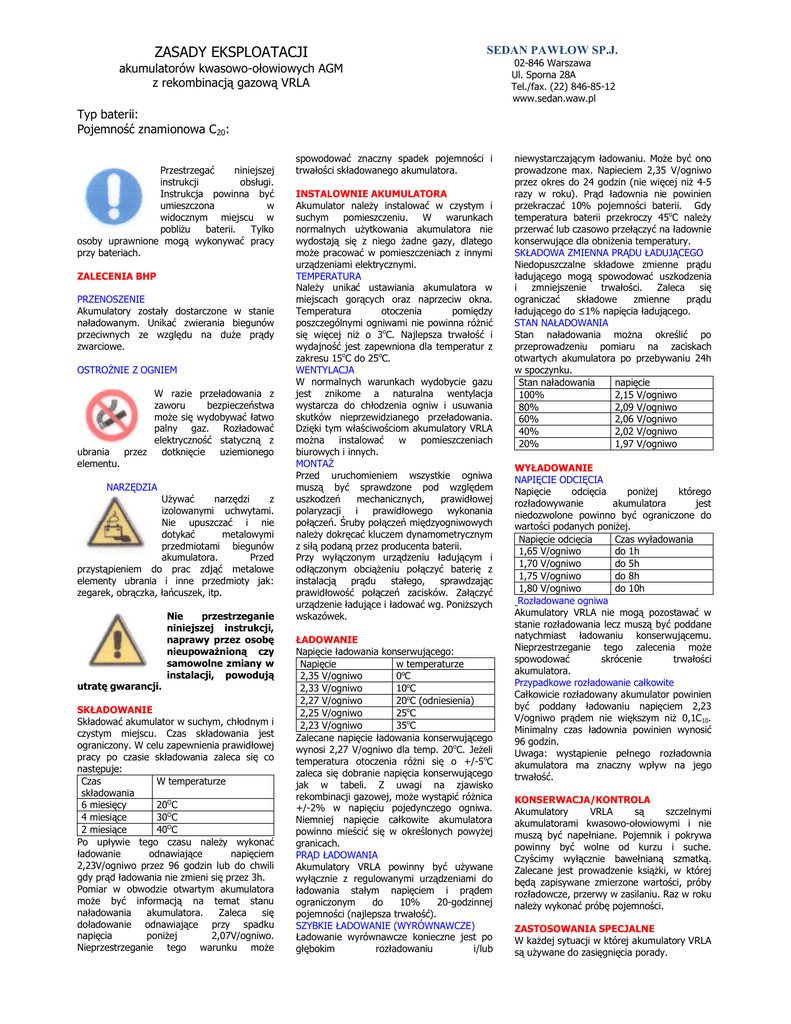 ZASADY EKSPLOATACJI SEDAN PAWŁOW SP.J. akumulatorów kwasowo-ołowiowych AGM z rekombinacją gazową VRLA 02-846 Warszawa Ul. Sporna 28A Tel./fax. (22) 846-85-12 www.sedan.waw.pl Typ baterii: Pojemność znamionowa C20: Przestrzegać niniejszej instrukcji obsługi. Instrukcja powinna być umieszczona w widocznym miejscu w pobliżu baterii. Tylko osoby uprawnione mogą wykonywać pracy przy bateriach. ZALECENIA BHP PRZENOSZENIE Akumulatory zostały dostarczone w stanie naładowanym. Unikać zwierania biegunów przeciwnych ze względu na duże prądy zwarciowe. OSTROŻNIE Z OGNIEM ubrania elementu. W razie przeładowania z zaworu bezpieczeństwa może się wydobywać łatwo palny gaz. Rozładować elektryczność statyczną z przez dotknięcie uziemionego NARZĘDZIA Używać narzędzi z izolowanymi uchwytami. Nie upuszczać i nie dotykać metalowymi przedmiotami biegunów akumulatora. Przed przystąpieniem do prac zdjąć metalowe elementy ubrania i inne przedmioty jak: zegarek, obrączka, łańcuszek, itp. utratę gwarancji. Nie przestrzeganie niniejszej instrukcji, naprawy przez osobę nieupoważnioną czy samowolne zmiany w instalacji, powodują SKŁADOWANIE Składować akumulator w suchym, chłodnym i czystym miejscu. Czas składowania jest ograniczony. W celu zapewnienia prawidłowej pracy po czasie składowania zaleca się co następuje: Czas W temperaturze składowania 6 miesięcy 20OC 4 miesiące 30OC 2 miesiące 40OC Po upływie tego czasu należy wykonać ładowanie odnawiające napięciem 2,23V/ogniwo przez 96 godzin lub do chwili gdy prąd ładowania nie zmieni się przez 3h. Pomiar w obwodzie otwartym akumulatora może być informacją na temat stanu naładowania akumulatora. Zaleca się doładowanie odnawiające przy spadku napięcia poniżej 2,07V/ogniwo. Nieprzestrzeganie tego warunku może spowodować znaczny spadek pojemności i trwałości składowanego akumulatora. INSTALOWNIE AKUMULATORA Akumulator należy instalować w czystym i suchym pomieszczeniu. W warunkach normalnych użytkowania akumulatora nie wydostają się z niego żadne gazy, dlatego może pracować w pomieszczeniach z innymi urządzeniami elektrycznymi. TEMPERATURA Należy unikać ustawiania akumulatora w miejscach gorących oraz naprzeciw okna. Temperatura otoczenia pomiędzy poszczególnymi ogniwami nie powinna różnić się więcej niż o 3oC. Najlepsza trwałość i wydajność jest zapewniona dla temperatur z zakresu 15oC do 25oC. WENTYLACJA W normalnych warunkach wydobycie gazu jest znikome a naturalna wentylacja wystarcza do chłodzenia ogniw i usuwania skutków nieprzewidzianego przeładowania. Dzięki tym właściwościom akumulatory VRLA można instalować w pomieszczeniach biurowych i innych. MONTAŻ Przed uruchomieniem wszystkie ogniwa muszą być sprawdzone pod względem uszkodzeń mechanicznych, prawidłowej polaryzacji i prawidłowego wykonania połączeń. Śruby połączeń międzyogniwowych należy dokręcać kluczem dynamometrycznym z siłą podaną przez producenta baterii. Przy wyłączonym urządzeniu ładującym i odłączonym obciążeniu połączyć baterię z instalacją prądu stałego, sprawdzając prawidłowość połączeń zacisków. Załączyć urządzenie ładujące i ładować wg. Poniższych wskazówek. ŁADOWANIE Napięcie ładowania konserwującego: Napięcie w temperaturze 2,35 V/ogniwo 0oC 2,33 V/ogniwo 10oC 2,27 V/ogniwo 20oC (odniesienia) 2,25 V/ogniwo 25oC 2,23 V/ogniwo 35oC Zalecane napięcie ładowania konserwującego wynosi 2,27 V/ogniwo dla temp. 20oC. Jeżeli temperatura otoczenia różni się o +/-5oC zaleca się dobranie napięcia konserwującego jak w tabeli. Z uwagi na zjawisko rekombinacji gazowej, może wystąpić różnica +/-2% w napięciu pojedynczego ogniwa. Niemniej napięcie całkowite akumulatora powinno mieścić się w określonych powyżej granicach. PRĄD ŁADOWANIA Akumulatory VRLA powinny być używane wyłącznie z regulowanymi urządzeniami do ładowania stałym napięciem i prądem ograniczonym do 10% 20-godzinnej pojemności (najlepsza trwałość). SZYBKIE ŁADOWANIE (WYRÓWNAWCZE) Ładowanie wyrównawcze konieczne jest po głębokim rozładowaniu i/lub niewystarczającym ładowaniu. Może być ono prowadzone max. Napieciem 2,35 V/ogniwo przez okres do 24 godzin (nie więcej niż 4-5 razy w roku). Prąd ładownia nie powinien przekraczać 10% pojemności baterii. Gdy temperatura baterii przekroczy 45oC należy przerwać lub czasowo przełączyć na ładownie konserwujące dla obniżenia temperatury. SKŁADOWA ZMIENNA PRĄDU ŁADUJĄCEGO Niedopuszczalne składowe zmienne prądu ładującego mogą spowodować uszkodzenia i zmniejszenie trwałości. Zaleca się ograniczać składowe zmienne prądu ładującego do ≤1% napięcia ładującego. STAN NAŁADOWANIA Stan naładowania można określić po przeprowadzeniu pomiaru na zaciskach otwartych akumulatora po przebywaniu 24h w spoczynku. Stan naładowania napięcie 100% 2,15 V/ogniwo 80% 2,09 V/ogniwo 60% 2,06 V/ogniwo 40% 2,02 V/ogniwo 20% 1,97 V/ogniwo WYŁADOWANIE NAPIĘCIE ODCIĘCIA Napięcie odcięcia poniżej którego rozładowywanie akumulatora jest niedozwolone powinno być ograniczone do wartości podanych poniżej. Napięcie odcięcia Czas wyładowania 1,65 V/ogniwo do 1h 1,70 V/ogniwo do 5h 1,75 V/ogniwo do 8h 1,80 V/ogniwo do 10h Rozładowane ogniwa Akumulatory VRLA nie mogą pozostawać w stanie rozładowania lecz muszą być poddane natychmiast ładowaniu konserwującemu. Nieprzestrzeganie tego zalecenia może spowodować skrócenie trwałości akumulatora. Przypadkowe rozładowanie całkowite Całkowicie rozładowany akumulator powinien być poddany ładowaniu napięciem 2,23 V/ogniwo prądem nie większym niż 0,1C10. Minimalny czas ładownia powinien wynosić 96 godzin. Uwaga: wystąpienie pełnego rozładownia akumulatora ma znaczny wpływ na jego trwałość. KONSERWACJA/KONTROLA Akumulatory VRLA są szczelnymi akumulatorami kwasowo-ołowiowymi i nie muszą być nape