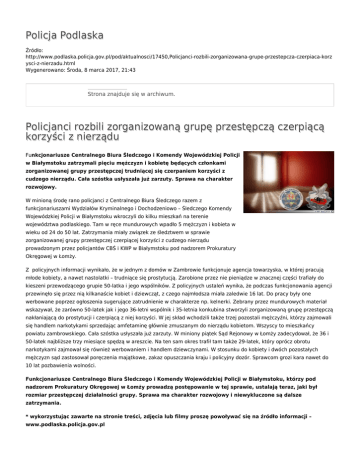 Policja Podlaska Źródło: http://www.podlaska.policja.gov.pl/pod/aktualnosci/17450,Policjanci-rozbili-zorganizowana-grupe-przestepcza-czerpiaca-korz ysci-z-nierzadu.html Wygenerowano: Środa, 8 marca 2017, 21:43 Strona znajduje się w archiwum. Policjanci rozbili zorganizowaną grupę przestępczą czerpiącą korzyści z nierządu Funkcjonariusze Centralnego Biura Śledczego i Komendy Wojewódzkiej Policji w Białymstoku zatrzymali pięciu mężczyzn i kobietę będących członkami zorganizowanej grupy przestępczej trudniącej się czerpaniem korzyści z cudzego nierządu. Cała szóstka usłyszała już zarzuty. Sprawa na charakter rozwojowy. W minioną środę rano policjanci z Centralnego Biura Śledczego razem z funkcjonariuszami Wydziałów Kryminalnego i Dochodzeniowo – Śledczego Komendy Wojewódzkiej Policji w Białymstoku wkroczyli do kilku mieszkań na terenie województwa podlaskiego. Tam w ręce mundurowych wpadło 5 mężczyzn i kobieta w wieku od 24 do 50 lat. Zatrzymania miały związek ze śledztwem w sprawie zorganizowanej grupy przestępczej czerpiącej korzyści z cudzego nierządu prowadzonym przez policjantów CBŚ i KWP w Białymstoku pod nadzorem Prokuratury Okręgowej w Łomży. Z policyjnych informacji wynikało, że w jednym z domów w Zambrowie funkcjonuje agencja towarzyska, w której pracują młode kobiety, a nawet nastolatki – trudniące się prostytucją. Zarobione przez nie pieniądze w znacznej części trafiały do kieszeni przewodzącego grupie 50-latka i jego wspólników. Z policyjnych ustaleń wynika, że podczas funkcjonowania agencji przewinęło się przez nią kilkanaście kobiet i dziewcząt, z czego najmłodsza miała zaledwie 16 lat. Do pracy były one werbowane poprzez ogłoszenia sugerujące zatrudnienie w charakterze np. kelnerki. Zebrany przez mundurowych materiał wskazywał, że zarówno 50-latek jak i jego 36-letni wspólnik i 35-letnia konkubina stworzyli zorganizowaną grupę przestępczą nakłaniającą do prostytucji i czerpiącą z niej korzyści. W jej skład wchodzili także trzej pozostali mężczyźni, którzy zajmowali się handlem narkotykami sprzedając amfetaminę głównie zmuszanym do nierządu kobietom. Wszyscy to mieszkańcy powiatu zambrowskiego. Cała szóstka usłyszała już zarzuty. W miniony piątek Sąd Rejonowy w Łomży zadecydował, że 36 i 50-latek najbliższe trzy miesiące spędzą w areszcie. Na ten sam okres trafił tam także 29-latek, który oprócz obrotu narkotykami zajmował się również werbowaniem i handlem dziewczynami. W stosunku do kobiety i dwóch pozostałych mężczyzn sąd zastosował poręczenia majątkowe, zakaz opuszczania kraju i policyjny dozór. Sprawcom grozi kara nawet do 10 lat pozbawienia wolności. Funkcjonariusze Centralnego Biura Śledczego i Komendy Wojewódzkiej Policji w Białymstoku, którzy pod nadzorem Prokuratury Okręgowej w Łomży prowadzą postępowanie w tej sprawie, ustalają teraz, jaki był rozmiar przestępczej działalności grupy. Sprawa ma charakter rozwojowy i niewykluczone są dalsze zatrzymania. * wykorzystując zawarte na stronie treści, zdjęcia lub filmy proszę powoływać się na źródło informacji – www.podlaska.policja.gov.pl ZAŁĄCZNIKI DO STRONY Posłuchaj - st.asp. Justyna Aćman 2.06 MB Ocena: 0/5 (0) Tweetnij