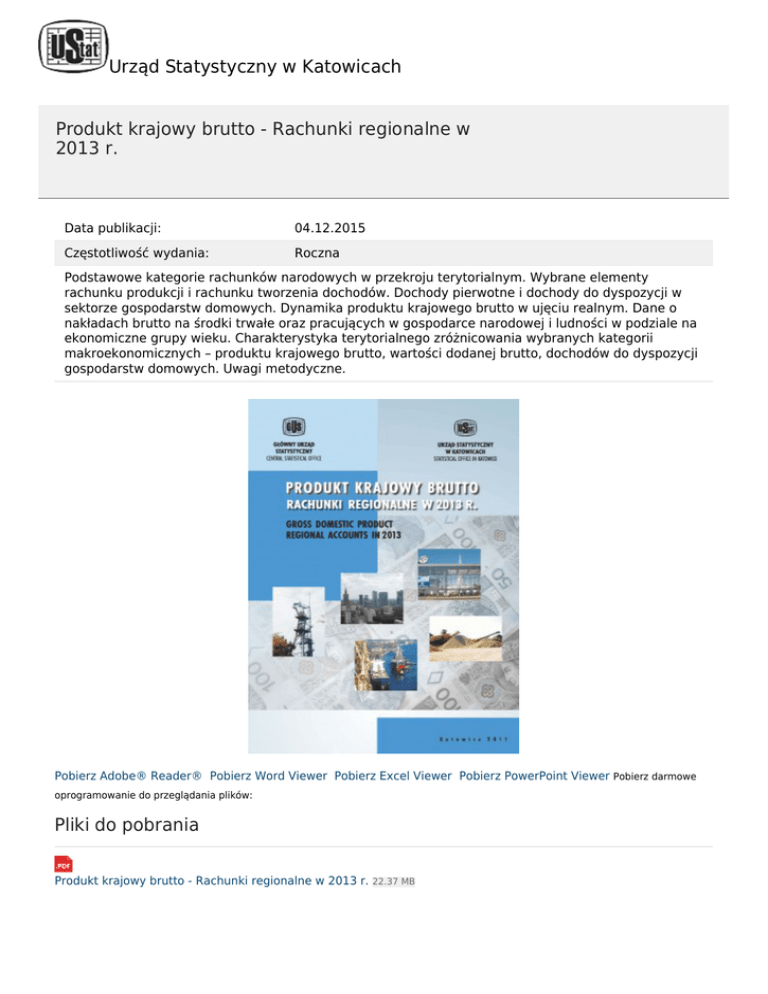 Urząd Statystyczny w Katowicach Produkt krajowy brutto - Rachunki regionalne w 2013 r. Data publikacji: 04.12.2015 Częstotliwość wydania: Roczna Podstawowe kategorie rachunków narodowych w przekroju terytorialnym. Wybrane elementy rachunku produkcji i rachunku tworzenia dochodów. Dochody pierwotne i dochody do dyspozycji w sektorze gospodarstw domowych. Dynamika produktu krajowego brutto w ujęciu realnym. Dane o nakładach brutto na środki trwałe oraz pracujących w gospodarce narodowej i ludności w podziale na ekonomiczne grupy wieku. Charakterystyka terytorialnego zróżnicowania wybranych kategorii makroekonomicznych – produktu krajowego brutto, wartości dodanej brutto, dochodów do dyspozycji gospodarstw domowych. Uwagi metodyczne. Pobierz Adobe® Reader® Pobierz Word Viewer Pobierz Excel Viewer Pobierz PowerPoint Viewer Pobierz darmowe oprogramowanie do przeglądania plików: Pliki do pobrania Produkt krajowy brutto - Rachunki regionalne w 2013 r. 22.37 MB Produkt krajowy brutto - Rachunki regionalne w 2013 r. - tablice 0.34 MB Produkt krajowy brutto - Rachunki regionalne w 2013 r. 22.32 MB Wyjdź z archiwum 2016 Produkt krajowy brutto - Rachunki regionalne w 2014 r. 2013 Produkt krajowy brutto - Rachunki regionalne w 2013 r. 22.32 MB 2012 Produkt krajowy brutto - Rachunki regionalne w 2012 r. 9.67 MB 2011 Produkt krajowy brutto – Rachunki regionalne w 2011 r. 10.15 MB 2010 Produkt krajowy brutto – Rachunki regionalne w 2010 r. - dane ogólnopolskie 2.19 MB 2009 Produkt krajowy brutto – Rachunki regionalne w 2009 r. - dane ogólnopolskie 6.25 MB 2008 Produkt krajowy brutto – Rachunki regionalne w 2008 r. - dane ogólnopolskie 4.30 MB 2007 Produkt krajowy brutto – Rachunki regionalne w 2007 r. - dane ogólnopolskie 2.02 MB 2006 Produkt krajowy brutto – Rachunki regionalne w 2006 r. - dane ogólnopolskie 9.85 MB 2005 Produkt krajowy brutto - Rachunki regionalne w 2005 r. - dane ogólnopolskie 4.46 MB 2004 Produkt krajowy brutto - Rachunki regionalne 2004 - dane ogólnopolskie 4.41 MB 2003 Produkt krajowy brutto - Rachunki regionalne 2003 - dane ogólnopolskie 6.31 MB 2002 Produkt krajowy brutto według województw i podregionów w 2002 roku - dane ogólnopolskie 4.68 MB