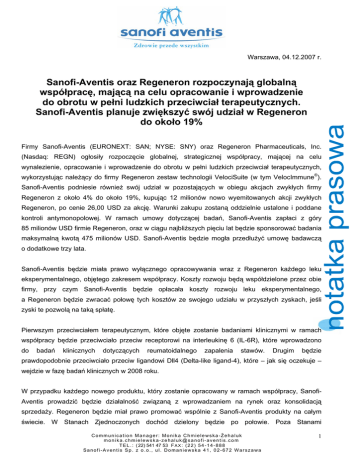 Warszawa, 04.12.2007 r. Sanofi-Aventis oraz Regeneron rozpoczynają globalną współpracę, mającą na celu opracowanie i wprowadzenie do obrotu w pełni ludzkich przeciwciał terapeutycznych. Sanofi-Aventis planuje zwiększyć swój udział w Regeneron do około 19% Firmy Sanofi-Aventis (EURONEXT: SAN; NYSE: SNY) oraz Regeneron Pharmaceuticals, Inc. (Nasdaq: REGN) ogłosiły rozpoczęcie globalnej, strategicznej współpracy, mającej na celu wynalezienie, opracowanie i wprowadzenie do obrotu w pełni ludzkich przeciwciał terapeutycznych, wykorzystując należący do firmy Regeneron zestaw technologii VelociSuite (w tym VelocImmune®). Sanofi-Aventis podniesie również swój udział w pozostających w obiegu akcjach zwykłych firmy Regeneron z około 4% do około 19%, kupując 12 milionów nowo wyemitowanych akcji zwykłych Regeneron, po cenie 26,00 USD za akcję. Warunki zakupu zostaną oddzielnie ustalone i poddane kontroli antymonopolowej. W ramach umowy dotyczącej badań, Sanofi-Aventis zapłaci z góry 85 milionów USD firmie Regeneron, oraz w ciągu najbliższych pięciu lat będzie sponsorować badania maksymalną kwotą 475 milionów USD. Sanofi-Aventis będzie mogła przedłużyć umowę badawczą o dodatkowe trzy lata. Sanofi-Aventis będzie miała prawo wyłącznego opracowywania wraz z Regeneron każdego leku eksperymentalnego, objętego zakresem współpracy. Koszty rozwoju będą współdzielone przez obie firmy, przy czym Sanofi-Aventis będzie opłacała koszty rozwoju leku eksperymentalnego, a Regeneron będzie zwracać połowę tych kosztów ze swojego udziału w przyszłych zyskach, jeśli zyski te pozwolą na taką spłatę. Pierwszym przeciwciałem terapeutycznym, które objęte zostanie badaniami klinicznymi w ramach współpracy będzie przeciwciało przeciw receptorowi na interleukinę 6 (IL-6R), które wprowadzono do badań klinicznych dotyczących reumatoidalnego zapalenia stawów. Drugim będzie prawdopodobnie przeciwciało przeciw ligandowi Dll4 (Delta-like ligand-4), które – jak się oczekuje – wejdzie w fazę badań klinicznych w 2008 roku. W przypadku każdego nowego produktu, który zostanie opracowany w ramach współpracy, SanofiAventis prowadzić będzie działalność związaną z wprowadzaniem na rynek oraz konsolidacją sprzedaży. Regeneron będzie miał prawo promować wspólnie z Sanofi-Aventis produkty na całym świecie. W Stanach Zjednoczonych dochód dzielony będzie po połowie. Poza Stanami Communication Manager: Monika Chmielewska-Żehaluk [email protected] T E L . : ( 22) 541 47 53 F A X : ( 2 2 ) 5 4 - 1 4 - 8 8 8 Sanofi-Aventis Sp. z o.o., ul. Domaniewska 41, 02-672 Warszawa 1 Zjednoczonymi dochód dzielony będzie według wstępnie ustalonych zmiennych proporcji, przy czym udział Sanofi-Aventis wyniesie od 65% do 55%. Poza tym, Regeneron będzie uprawniony do otrzymania dodatkowej kwoty wynoszącej maksymalnie 250 milionów USD, w przypadku przekroczenia ustalonych progów sprzedaży, gdy współpraca osiągnie odpowiedni sumaryczny poziom rocznej sprzedaży poza USA wynoszący co najmniej 1 miliard USD. Informacje o zestawie technologii VelociSuite firmy Regeneron Firma Regeneron opracowała i przetestowała grupę nowych platform technologicznych znanych jako VelociSuite, mających na celu zwiększenie zdolności opracowywania nowych leków eksperymentalnych. Technologie VelociGene® i VelociMouse™ są pomocne w identyfikacji typu komórki lub określonych genów, które mogą stanowić cel terapii w przypadku konkretnej choroby, oraz w sprawdzeniu takich genów poprzez wysokowydajną produkcję modeli komórek ssaków. Technologia VelocImmune® zwiększa szybkość i wydajność opracowywania w pełni ludzkich monoklonalnych przeciwciał terapeutycznych i jest obecnie stosowana w celu wytworzenia przeciwciał o znaczeniu klinicznym skierowanych przeciw białkom docelowym. Informacje o Regeneron Pharmaceuticals Regeneron jest firmą biofarmaceutyczną, która opracowuje, rozwija i zamierza wprowadzać do obrotu leki terapeutyczne do leczenia poważnych chorób. Firma Regeneron wprowadziła do badań klinicznych eksperymentalne leki, które potencjalnie mogą wyleczyć raka, choroby oczu i choroby zapalne. Firma prowadzi również programy przedkliniczne obejmujące inne choroby i schorzenia. Dodatkowe informacje dotyczące firmy Regeneron oraz najnowsze komunikaty prasowe dostępne są na ogólnoświatowej stronie internetowej firmy www.regeneron.com. Informacje o firmie Sanofi-Aventis Sanofi-Aventis jest jedną z największych na świecie firm farmaceutycznych. Dysponując ogólnoświatową organizacją badań i rozwoju, firma Sanofi-Aventis zajmuje czołowe pozycje w siedmiu głównych obszarach terapeutycznych: leków stosowanych w chorobach układu krążenia, zakrzepicy, onkologii, chorobach metabolicznych, chorobach ośrodkowego układu nerwowego, chorobach wewnętrznych oraz szczepionek. Firma Sanofi-Aventis jest notowana na giełdach w Paryżu (EURONEXT: SAN) oraz w Nowym Jorku (NYSE: SNY). W Polsce, w wyniku formalno-prawnego połączenia spółek Sanofi-Synthelabo i Aventis Pharma 4 kwietnia 2006 roku, została powołana nowa spółka o nazwie Sanofi-Aventis Sp. z o.o. W wyniku połączenia powstał trzeci, co do wielkości koncern farmaceutyczny w Polsce. Firma zatrudnia blisko 900 osób, w tym 180 we własnym zakładzie produkcyjnym w Rzeszowie. Stwierdzenia odnoszące się do przyszłości Niniejszy komunikat prasowy zawiera stwierdzenia odnoszące się do przyszłości w rozumieniu amerykańskiej ustawy o reformie postępowania sądowego w sprawach związanych z prywatnymi papierami wartościowymi z roku 1995 (Private Securities Litigation Reform Act) w aktualnie obowiązującej wersji. W myśl tej definicji, stwierdzenia odnoszące się do przyszłości nie stanowią faktów historycznych. Stwierdzenia te zawierają Communication Manager: Monika Chmielewska-Żehaluk [email protected] T E L . : ( 22) 541 47